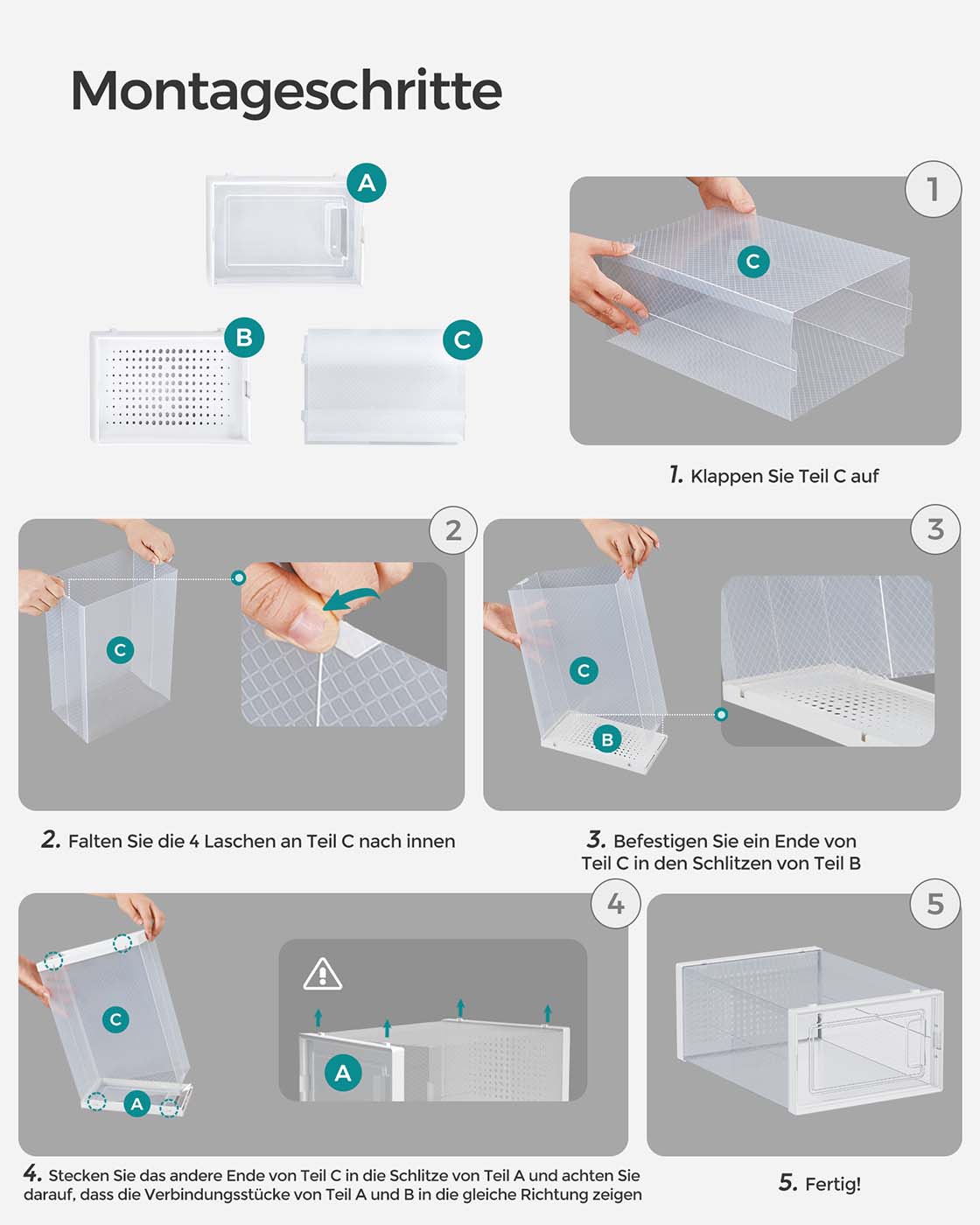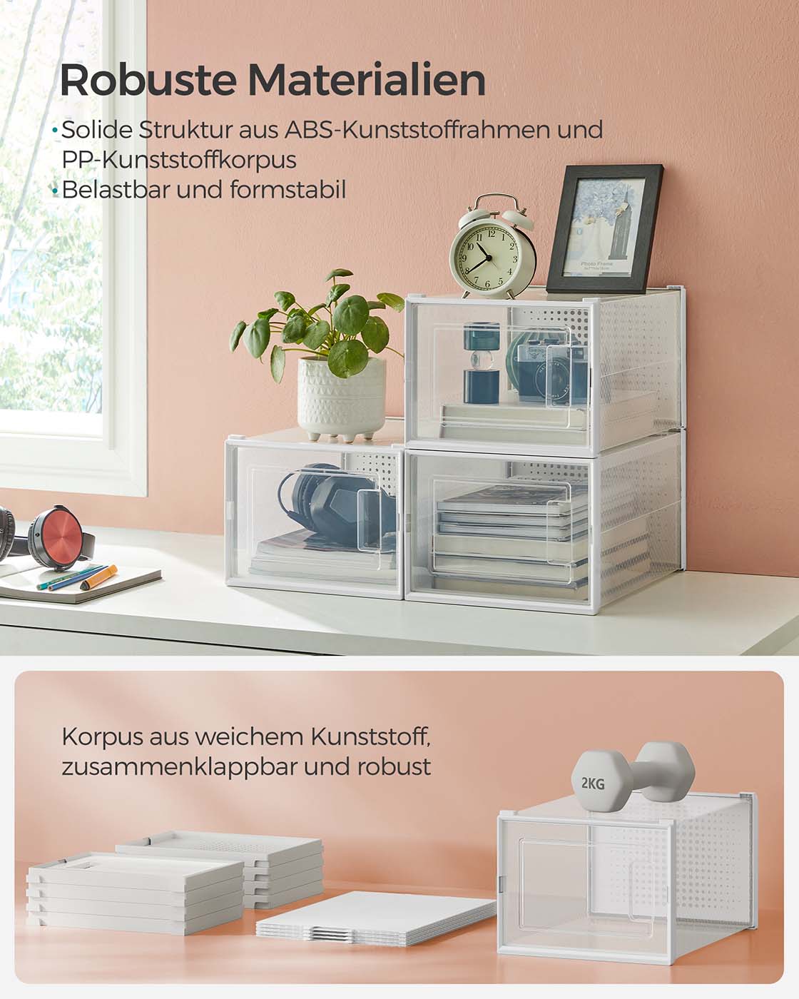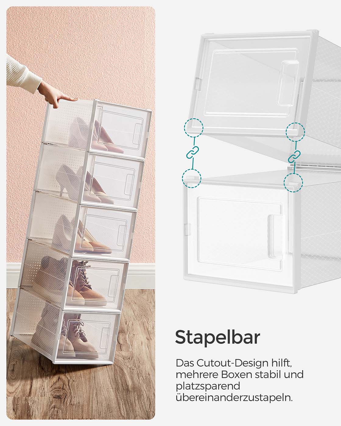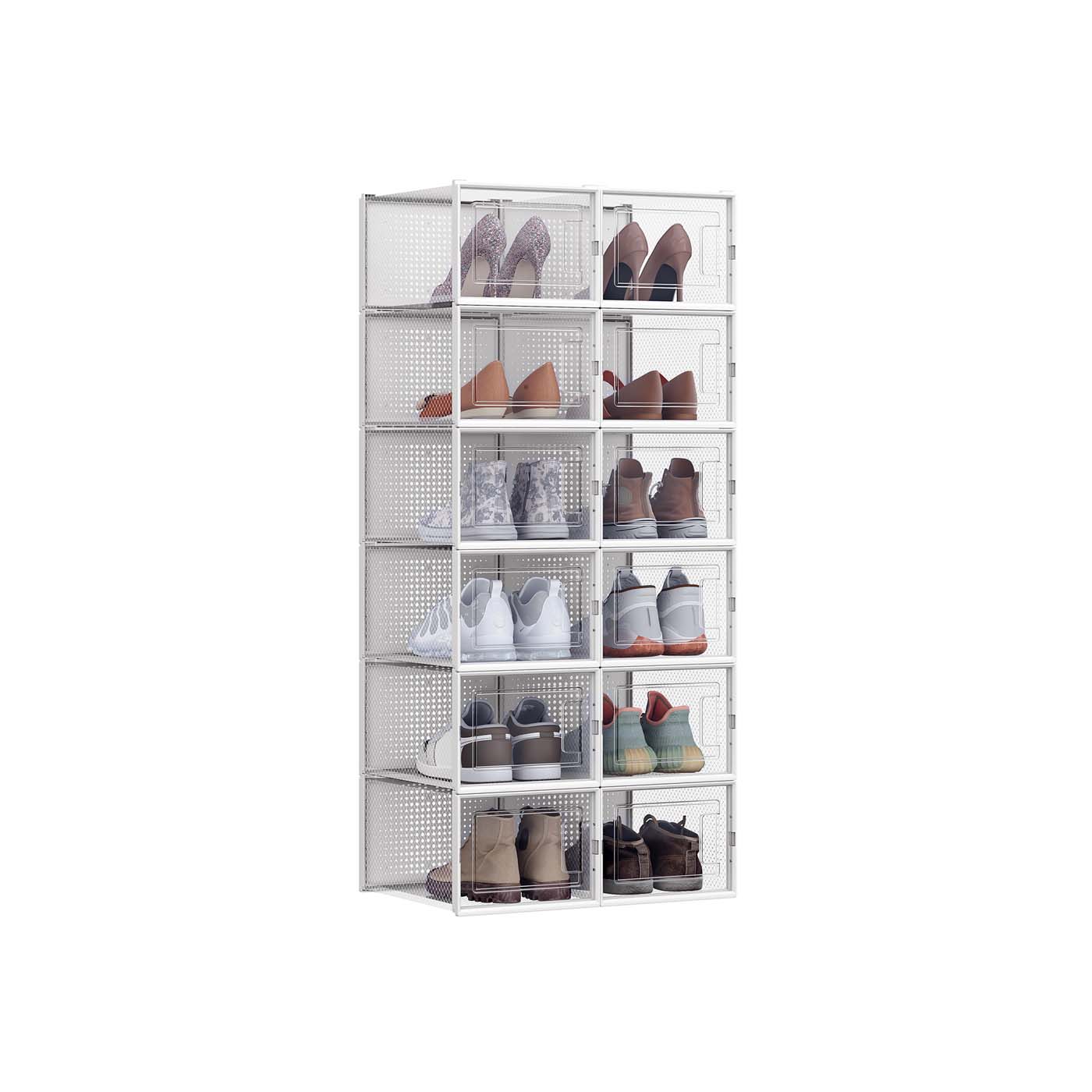 Put an end to the mess: Are you someone who throws their shoes in the closet and leaves them stacked in the living room and bedroom? Your old habits shouldn’t get in your way. Keep them clean and dry in these 12 shoe boxes until you need them next time. High organizational efficiency: Each organizer can hold shoes up to size 46 and protects them from dust. You can immediately find the pair you want to wear, open the front door, and grab them with ease to start your day. The best part is that these boxes are stackable and fit in the hallway, closet, or shelf. Product details: Color: Transparent white Material: Body made of PP (polypropylene), door made of PP (polypropylene) Dimensions of each box: 35 x 25.0 x 18.5 cm (D x W x H) Internal dimensions of each box: 31 x 24.5 x 17.5 cm (D x W x H) Weight: 5.2 kg Scope of delivery: 12 x shoe box 1 x instructions SONGMICS notes: When assembling the product, follow the steps in the instructions and assembly video. Do not use force to disassemble the product. Please measure your shoes and check the size of the corresponding boxes before purchasing.