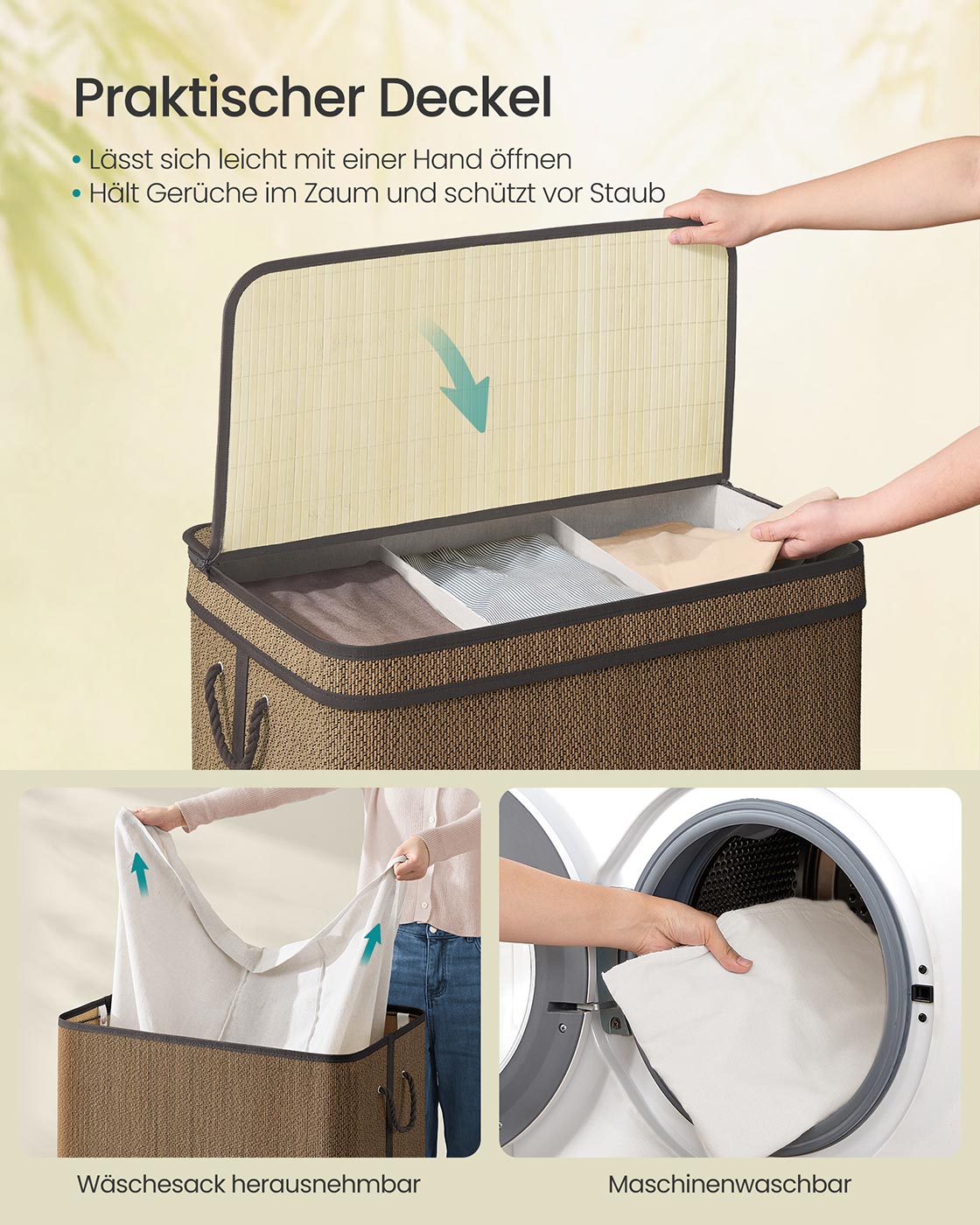SONGMICS laundry basket, bamboo laundry collector, 90 liters, removable and machine-washable laundry bag, with lid, handles, for laundry room, bedroom, living room, natural color LCB067Y01