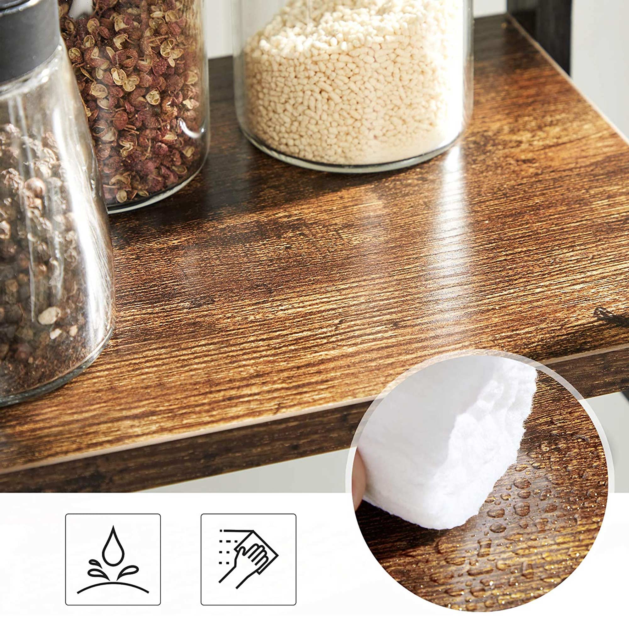 In the kitchenThanks to its compact dimensions (42 x 18 x 43 cm), this shelf fits perfectly on your kitchen countertop for neatly storing spices and cooking utensils. More order in the kitchen, more joy in cooking! In the office Place this shelf on your office desk to store pens, staplers, notes, and other office supplies and keep your desk tidy. A tidy workplace is essential for productive work! In the bedroom Are you a nail polish lover? Do you own lots of nail polish and want to collect even more? How lucky for you! This shelf provides storage space and at the same time offers a stylish stage for your colorful nail polishes. Product details: Color: Vintage brown-black Material: MDF (medium-density fiberboard) (shelves), bamboo (frame) Size: 42 x 18 x 43 cm (L x W x H) Weight: 2.4 kg Scope of delivery: 1 x spice rack 1 x accessory pack 1 x instructions (DE, EN, FR, ES, IT)