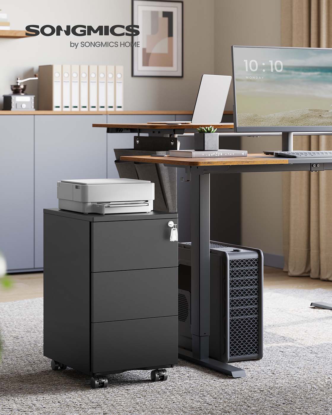 SONGMICS Rolling Container, Mobile Filing Cabinet, Lockable, with 3 Drawers, Storage for Files, Office Supplies, Pre-assembled, Office, Home Office, 39 x 45 x 55 cm (L x W x H), Matte Black OFC63BK