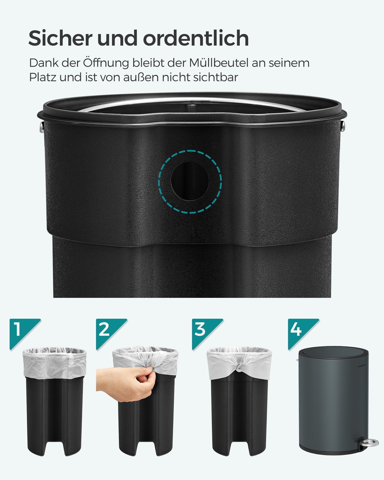 Opening on the inner bucket keeps the trash bag taut so that it is not visible from the outside