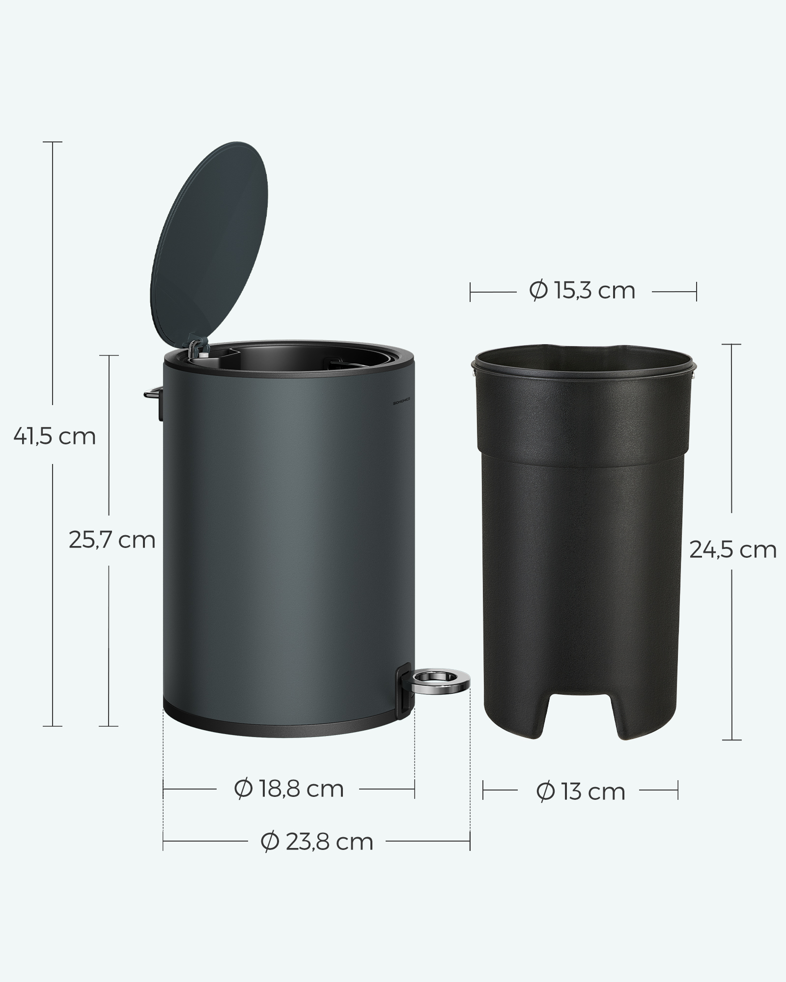 Material: Outer container made of steel, lid made of ABS plastic, inner bucket made of PP plastic