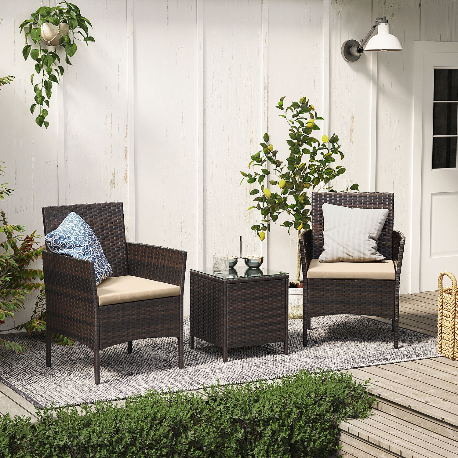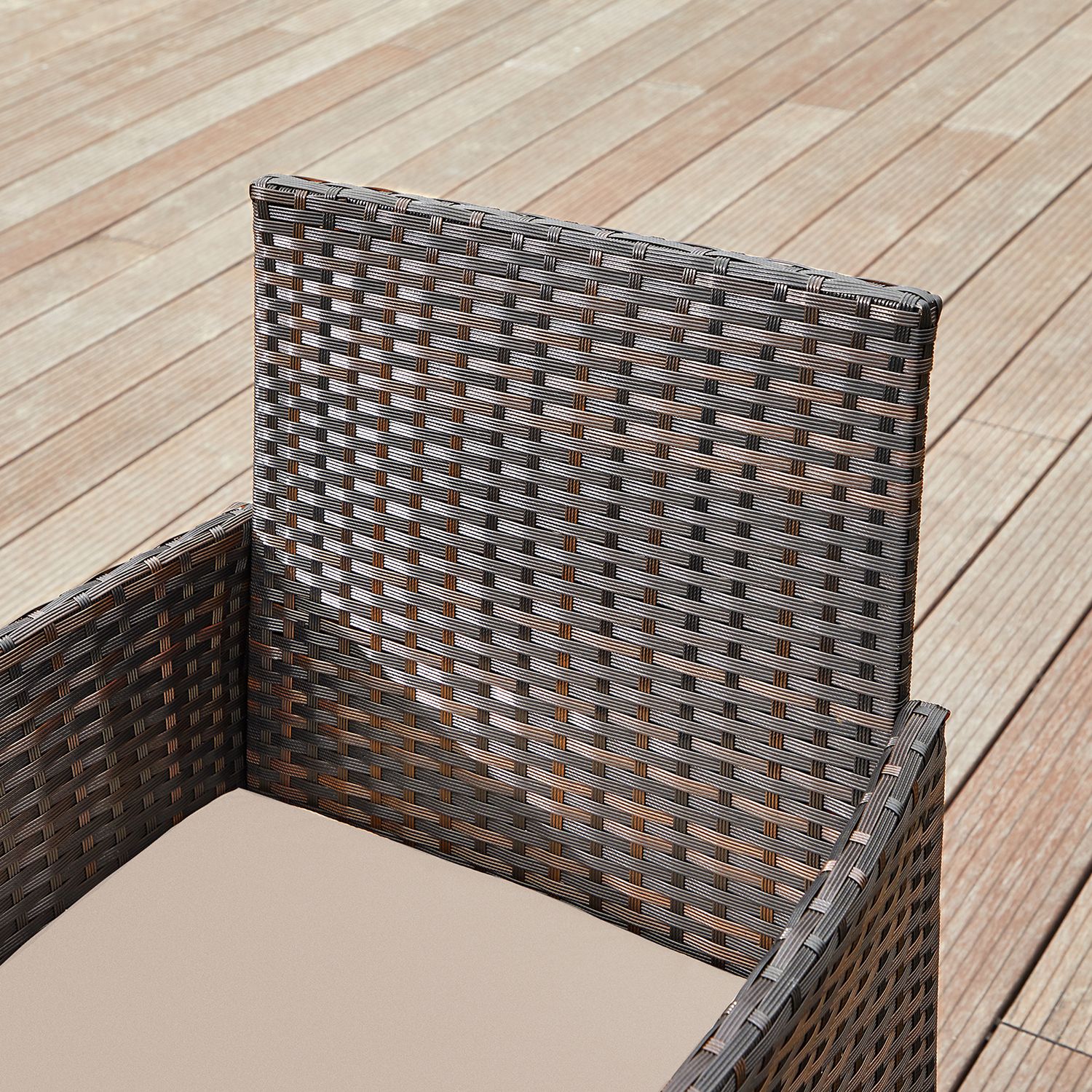 Use this garden furniture set from SONGMICS on every beautiful summer day to watch the sunset with your better half! Is there a better way to end the day? Make yourself comfortable: say goodbye to narrow, uncomfortable chairs! These garden chairs feature outwardly curved armrests and a backrest that is inclined at more than 90° to conform to the shape of your body and support your spine. Enjoy your free time outdoors: place the patio furniture set in your garden or yard to create a place to relax. You can read a book on a cozy afternoon, chat with a friend in the shade, or enjoy a pleasant summer breeze by the pool. With this seating set, anything is possible! Product details: – Color: Brown-Taupe – Chair and table material: Galvanized metal frame, PE poly rattan, tempered glass – Cushion material: VFT (Vertical Fiber Technology) padding, polyester fabric cover – Chair size: 56.5 x 54.5 x 81.5 cm (L x W x H) – Table size: 40 x 40 x 45.5 cm (L x W x H) – Total weight: 16.3 kg – Max. static load capacity per chair: 150 kg – Max. static load capacity of the table: 30 kg SONGMICS Notes:- We recommend covering this furniture set during inclement weather or in winter to extend its lifespan. – Please clean these products with a damp cloth only. – To ensure safe use, do not exceed the maximum load capacity. – Please do not tighten the screws immediately during assembly. Only tighten them carefully after you have inserted all screws. – If the product wobbles, adjust the screws to stabilize it.