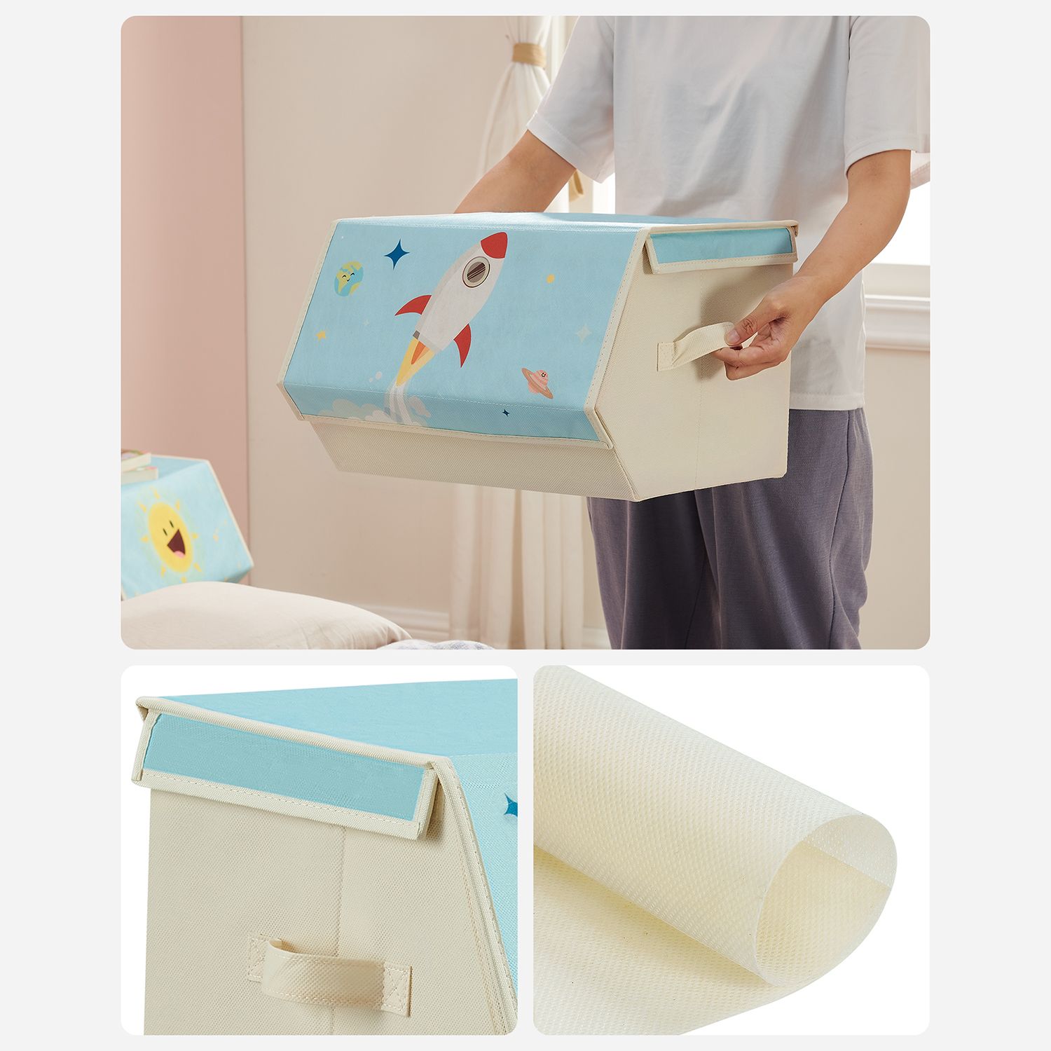 SONGMICS storage box for children, set of 3, folding boxes, toy box with lid, 38 x 35 x 25 cm, for children’s rooms, toy rooms, space motifs, beige RLB700M01