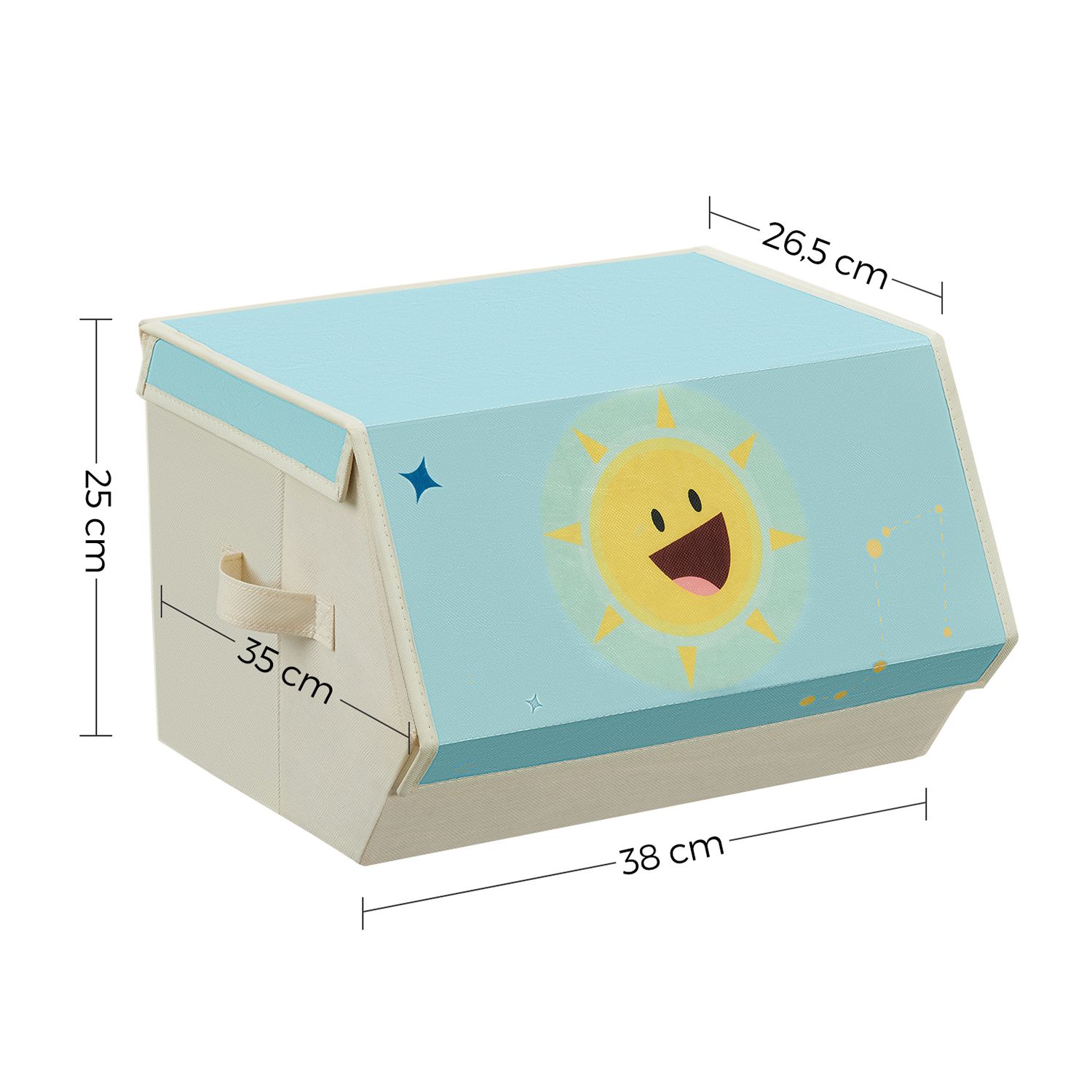 These storage boxes are not only attractive, making storage fun for children, but also practical: – Magnetic lid: Can be opened and “stuck” to the box above so that children can easily find and access the items. – Stackable: The Velcro fastener on the back of each box helps with stacking to make the most of vertical storage space. – With handles: The versatile boxes can be easily stored on shelves, in cupboards, children’s rooms, living rooms, etc. – Foldable design: Makes assembly and storage a breeze. Product details: – Color: Blue – Material: Non-woven fabric, cardboard – Size per box: 38 x 35 x 25 cm (L x W x H) – Total weight: 3.3 kg – Max. static load capacity per box: 10 kg Scope of delivery: – 3 x storage boxes SONGMICS Notes:- The boxes are not washable; it is recommended to wipe off dirt with a damp cloth. – Please place the product in a well-ventilated area if it has an unpleasant odor after unpacking. – Do not expose the product to direct sunlight or high humidity for long periods of time.- The maximum load capacity of each box is 10 kg. Please do not place heavy items in the box.