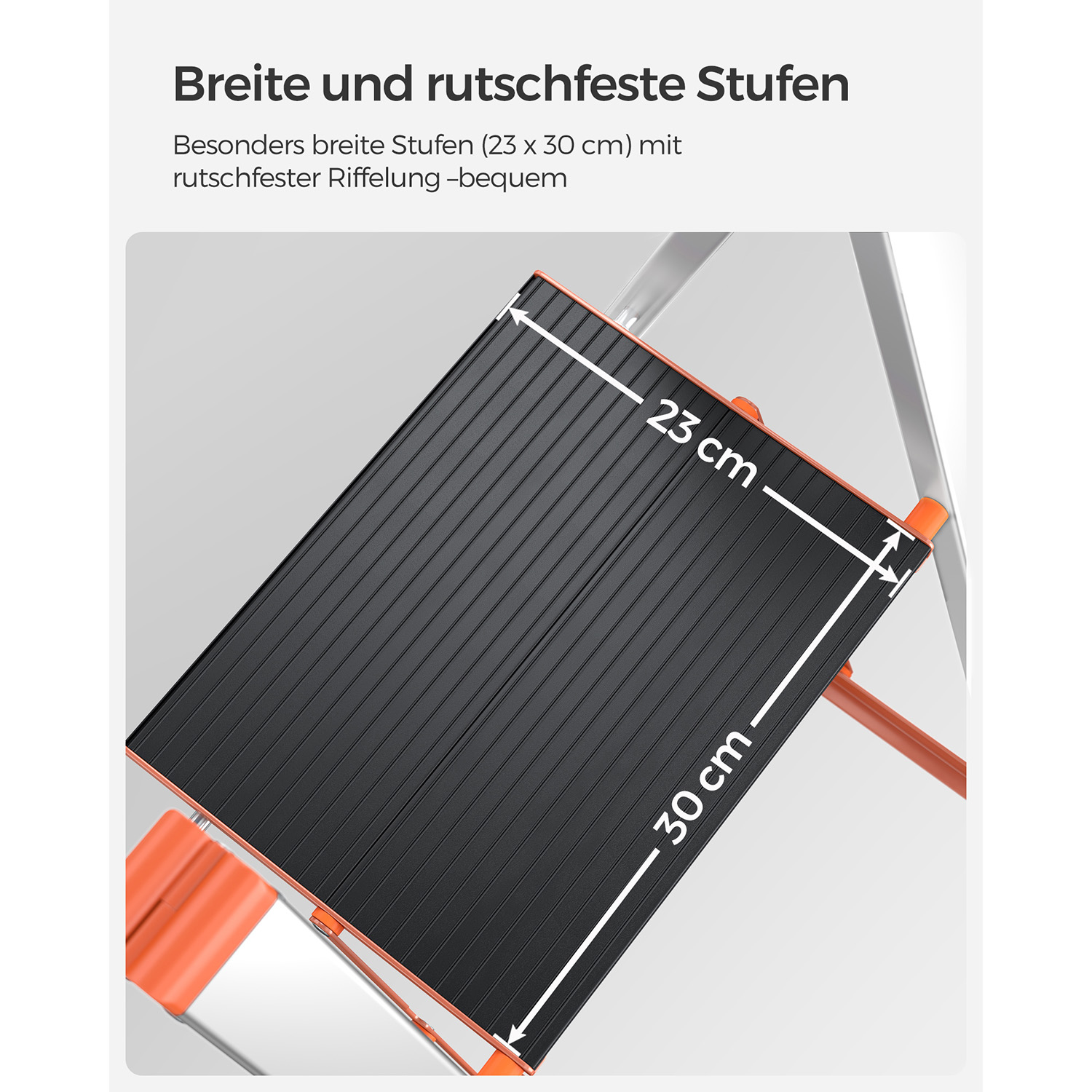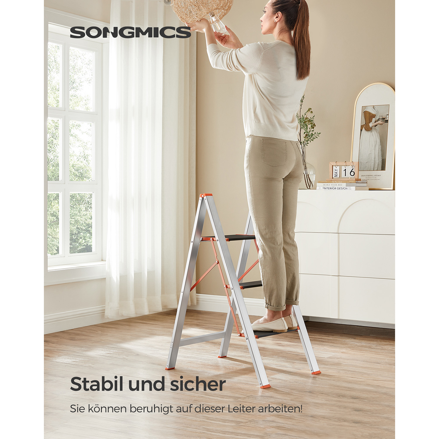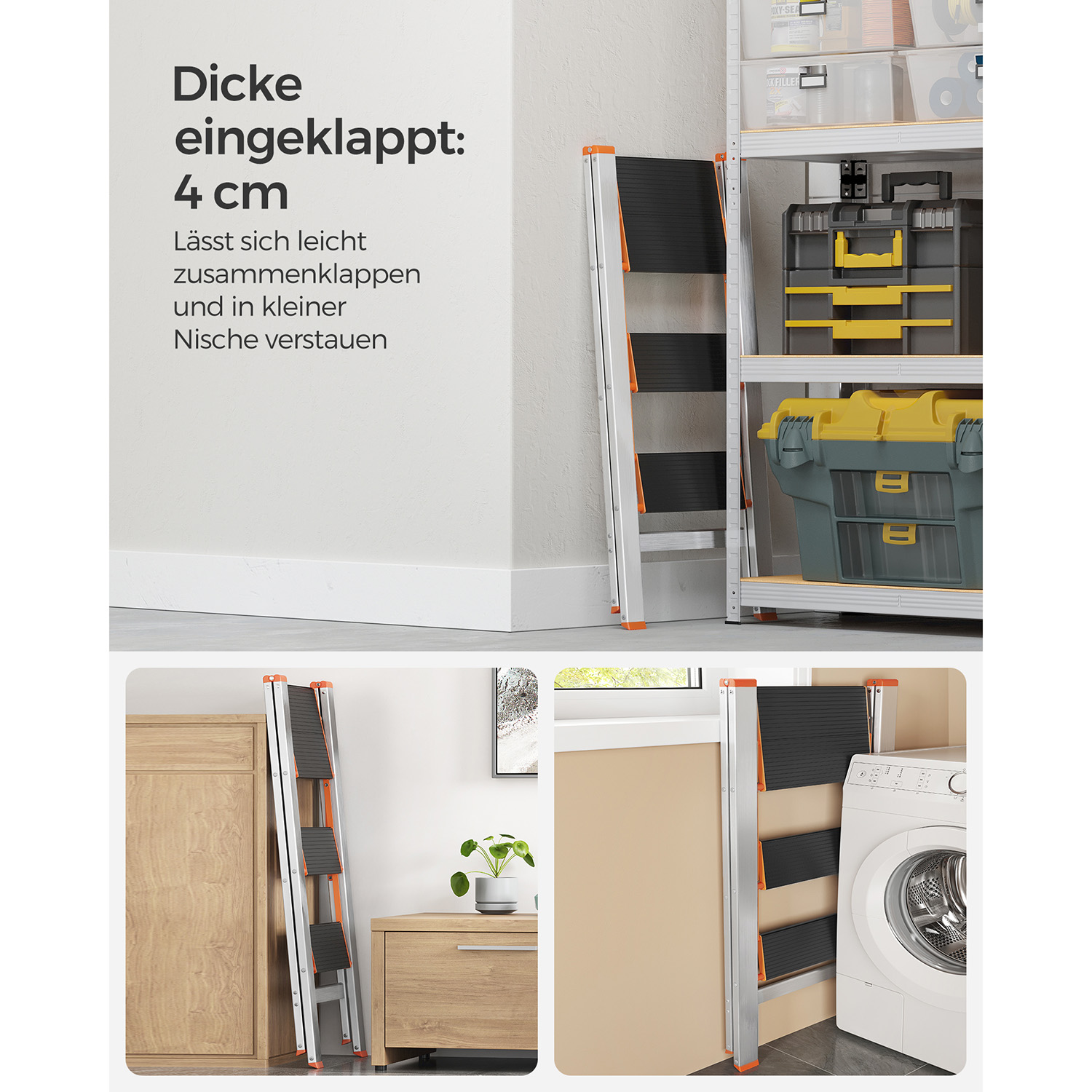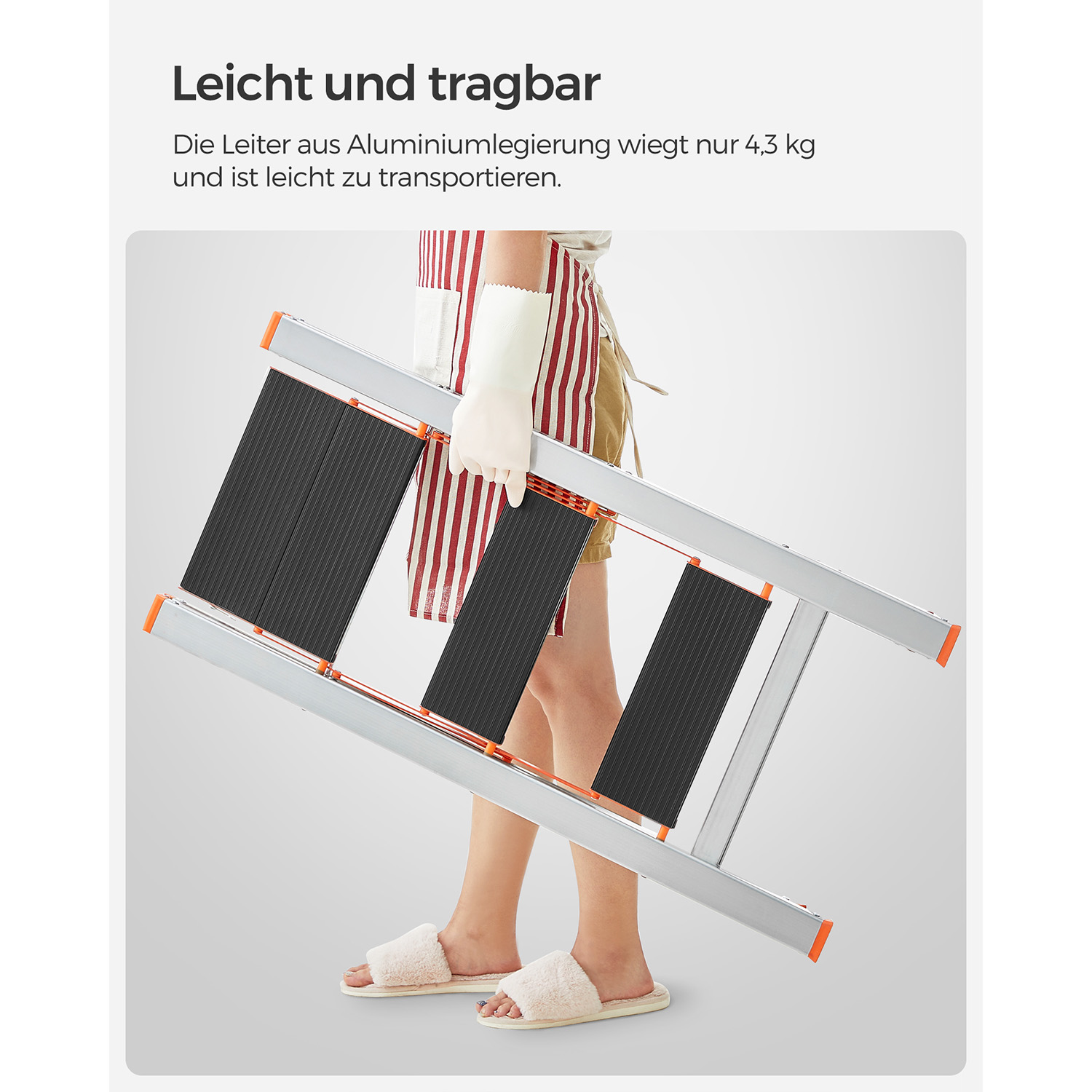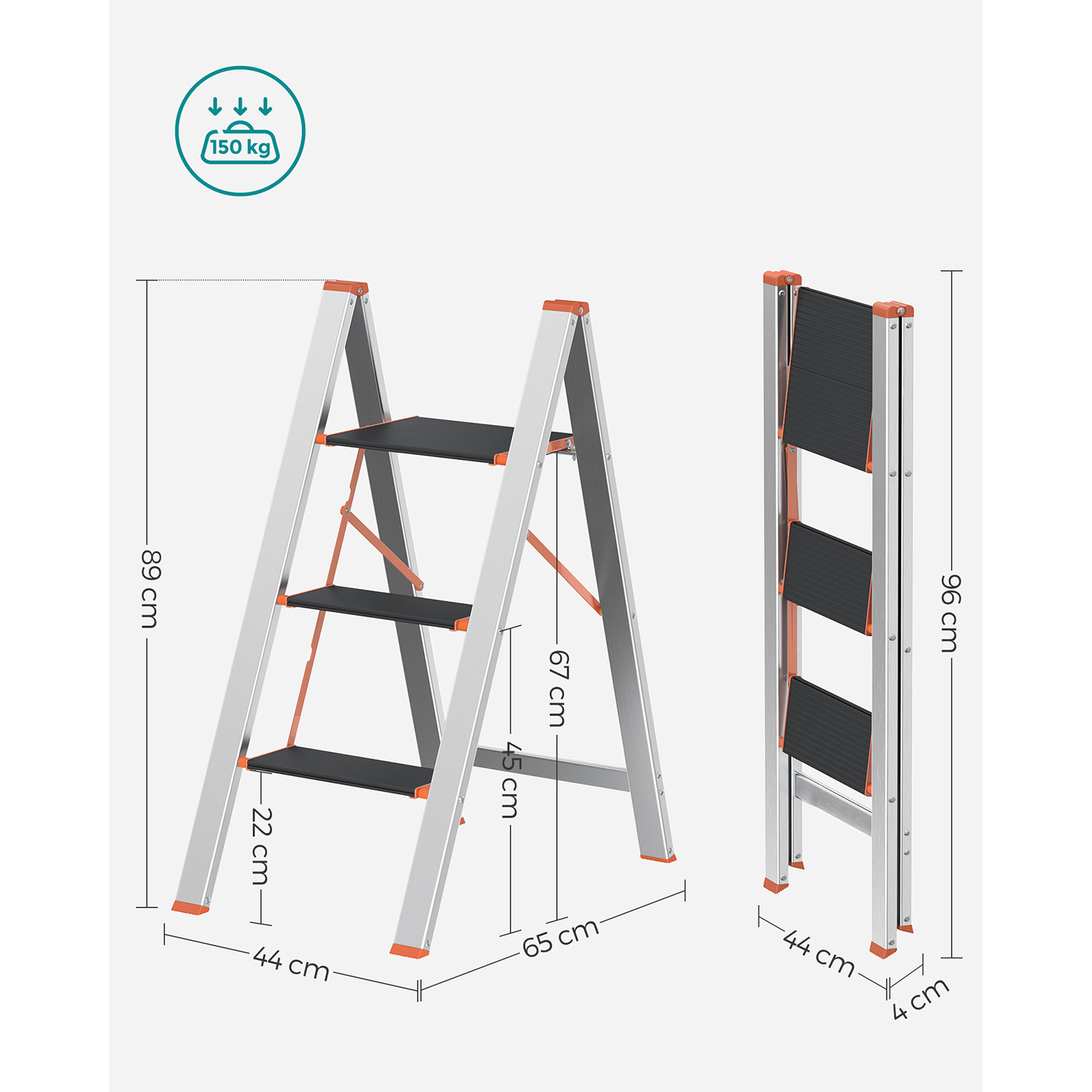 Product details: Color: Silver Material: Aluminum alloy Size when unfolded: 65 x 44 x 89 cm (D x W x H) Thickness when folded: 4 cm Weight: 4.3 kg Max. static load capacity: 150 kg Scope of delivery: 1 x household ladder 1 x instructions SONGMICS Notes:Please ensure that the ladder is undamaged before use. Please do not use the ladder if there is oil or water on the floor. Pregnant women and people with injuries or other physical limitations should not use this ladder.