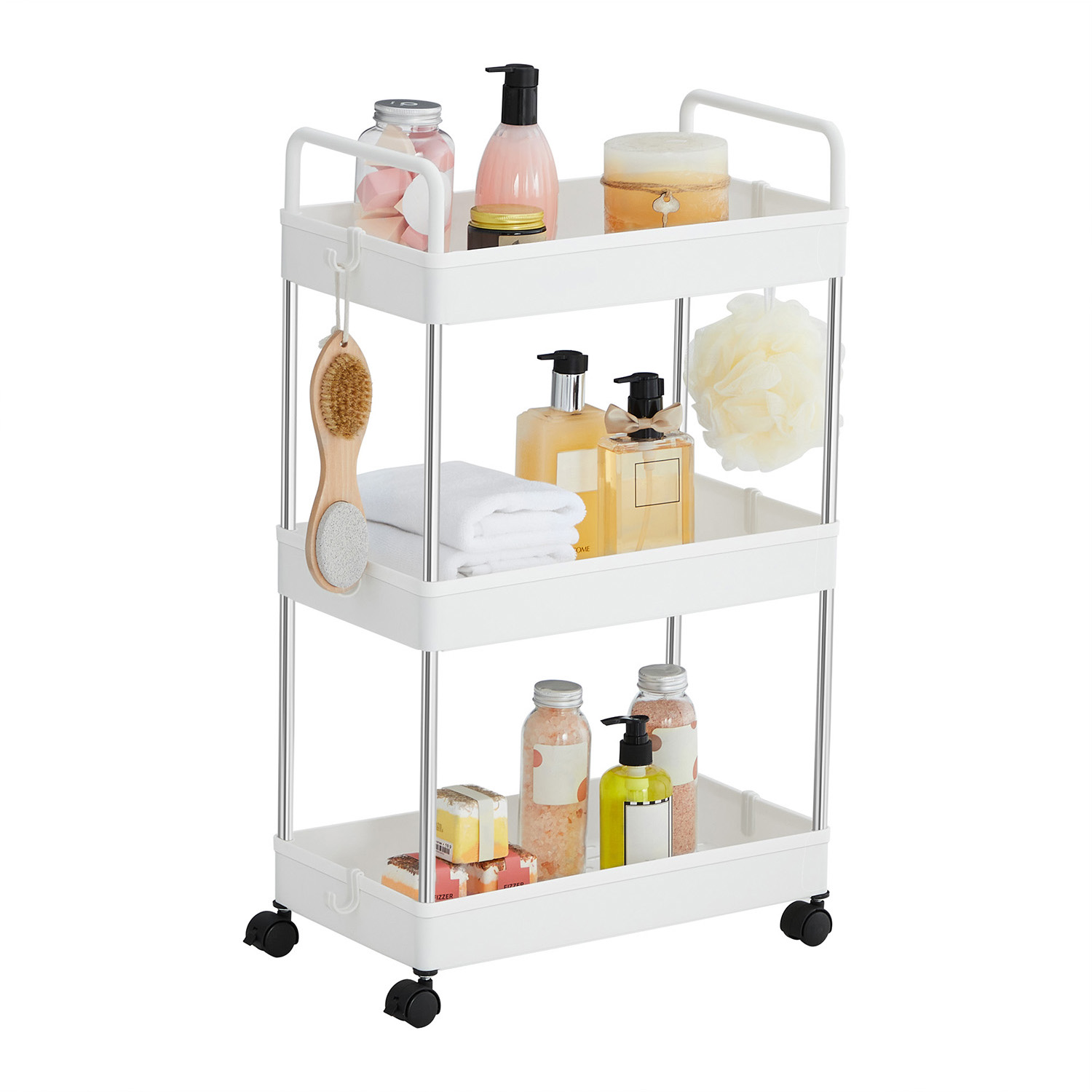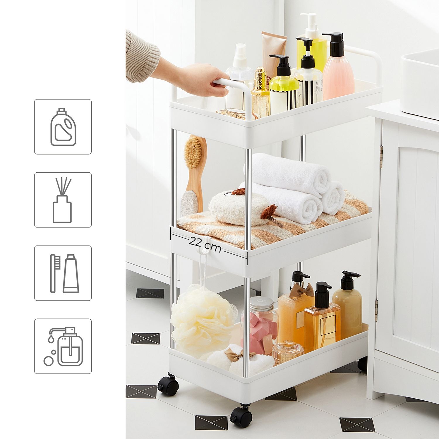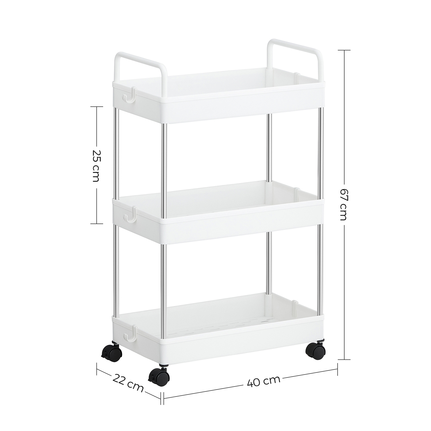 Product details: – Color: White – Material: Stainless steel, PP (polypropylene) – Overall size: 40 x 22 x 67 cm (L x W x H) – Weight: 1.2 kg – Max. static load capacity per level: 5 kg Scope of delivery: – 1 x trolley – 6 x hooks – 1 x instructions SONGMICS Notes: – Store heavier items on the bottom shelf and place or hang items evenly on each level to prevent tipping. – When assembling, please do not press directly on the ends of the tubes with your hands to avoid injury.