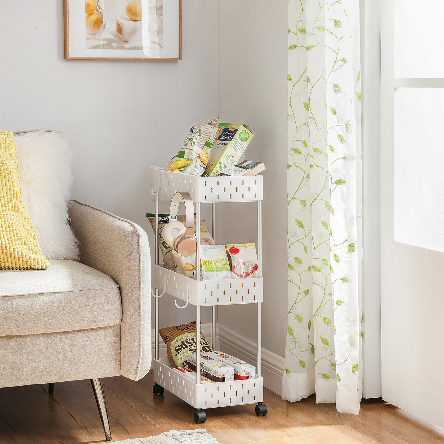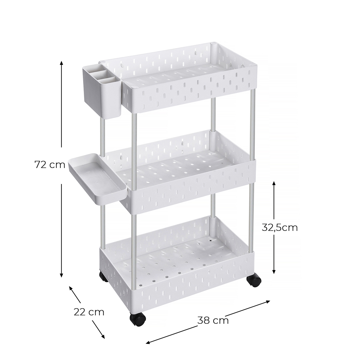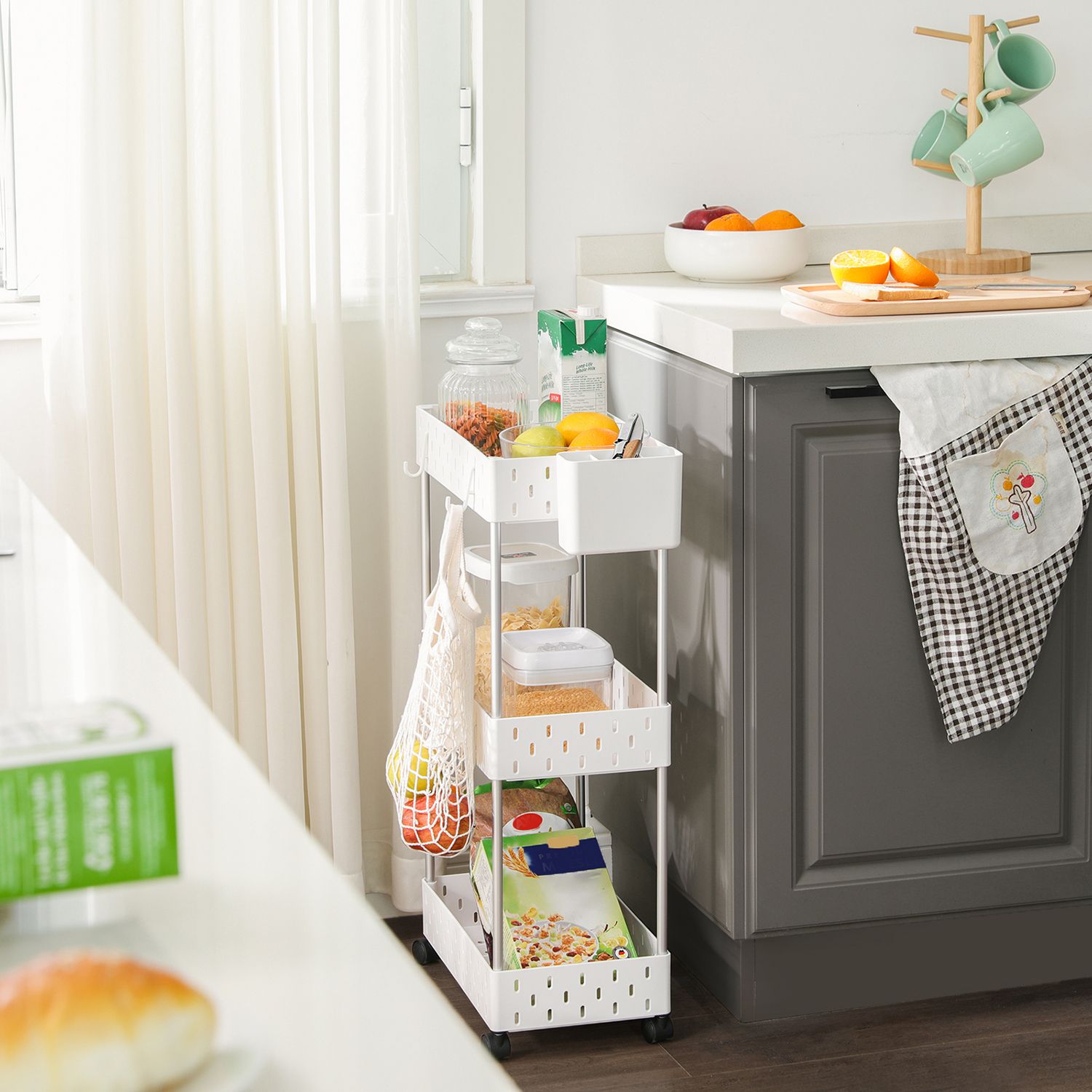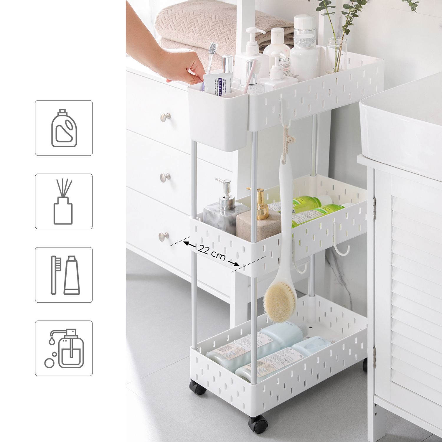 Are some of the items you used yesterday already missing today, forcing you to spend a lot of time looking for them? Don’t worry, this trolley from SONGMICS will help you put an end to this annoying game of hide and seek! Everything within reach: Equipped with 3 high-quality PP plastic shelves and supported by sturdy aluminum tubes, this trolley offers enough space for all those items that have not yet found a permanent place in your home. This multi-talented trolley can also easily withstand heavy weights. Thanks to its compact size, the serving trolley fits perfectly in the bathroom for storing beauty products, in the kitchen for storing kitchen utensils, or in the office for storing documents. If you want to have frequently used items always at hand, this product from SONGMICS is just right for you! Product details:- Color: White – Material: PP (polypropylene), aluminum – Size: 38 x 22 x 72 cm (L x W x H) – Weight: 2.7 kg – Max. total static load capacity: 30 kg – Max. static load capacity per shelf: 10 kg Scope of delivery:- 1 x rolling cart – 6 x hooks – 1 x tray – 1 x organizer with 3 compartments – 1 x instructions SONGMICS notes: – Only assemble the product as described in these instructions. Please do not disassemble it by force. – Each shelf can hold up to 10 kg. Please do not store any heavier items on the product. – When assembling, please do not press directly on the ends of the tubes with your hands to avoid injury.