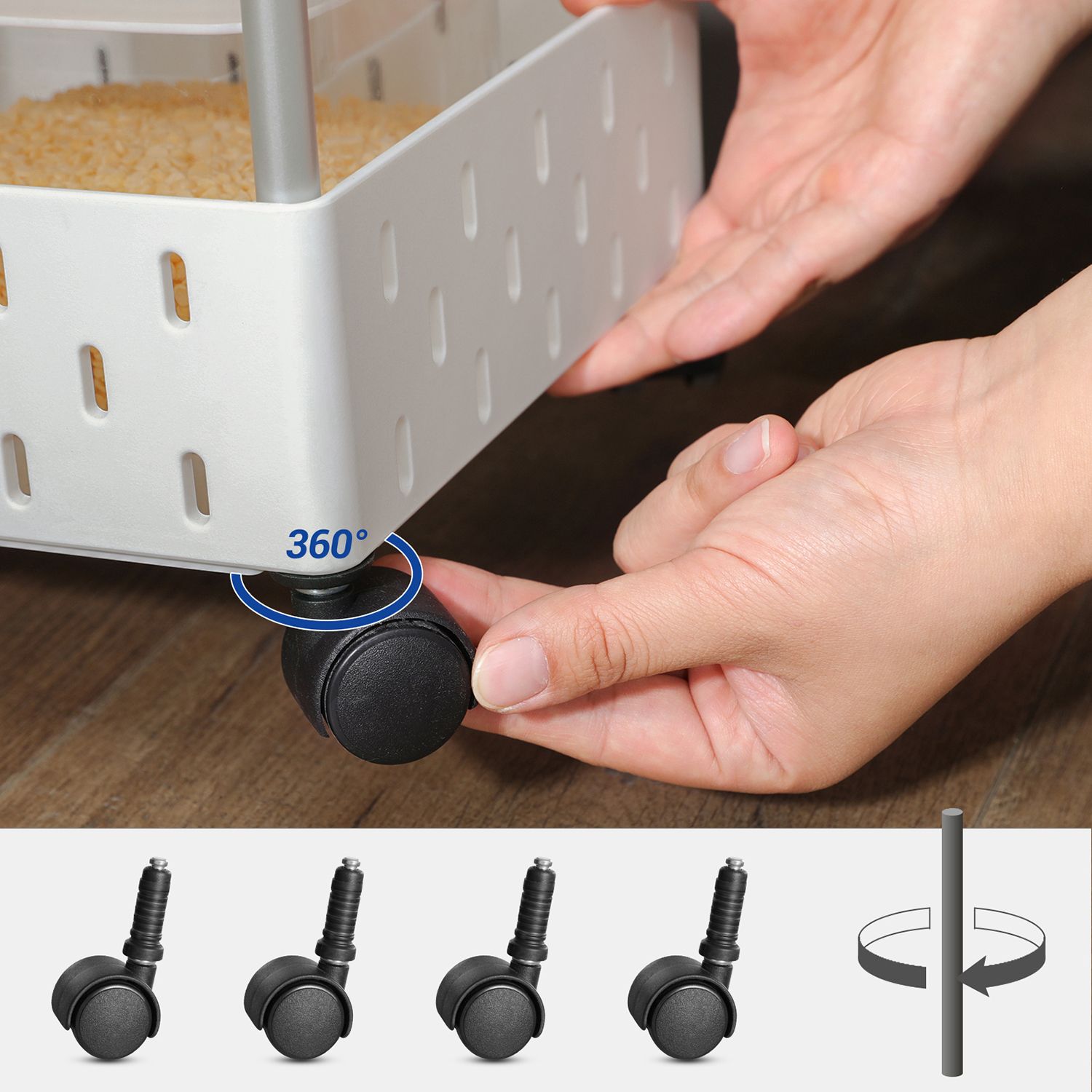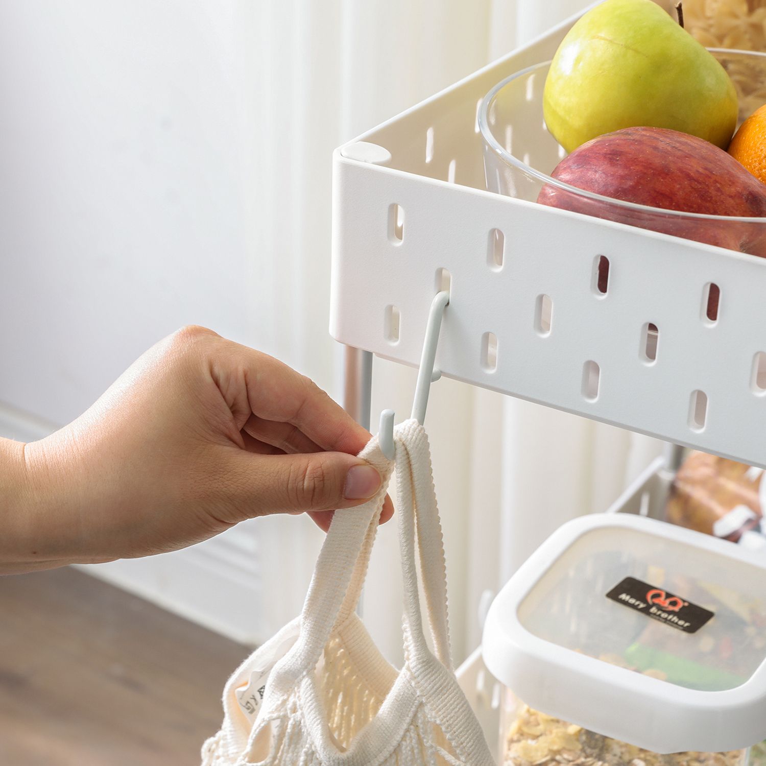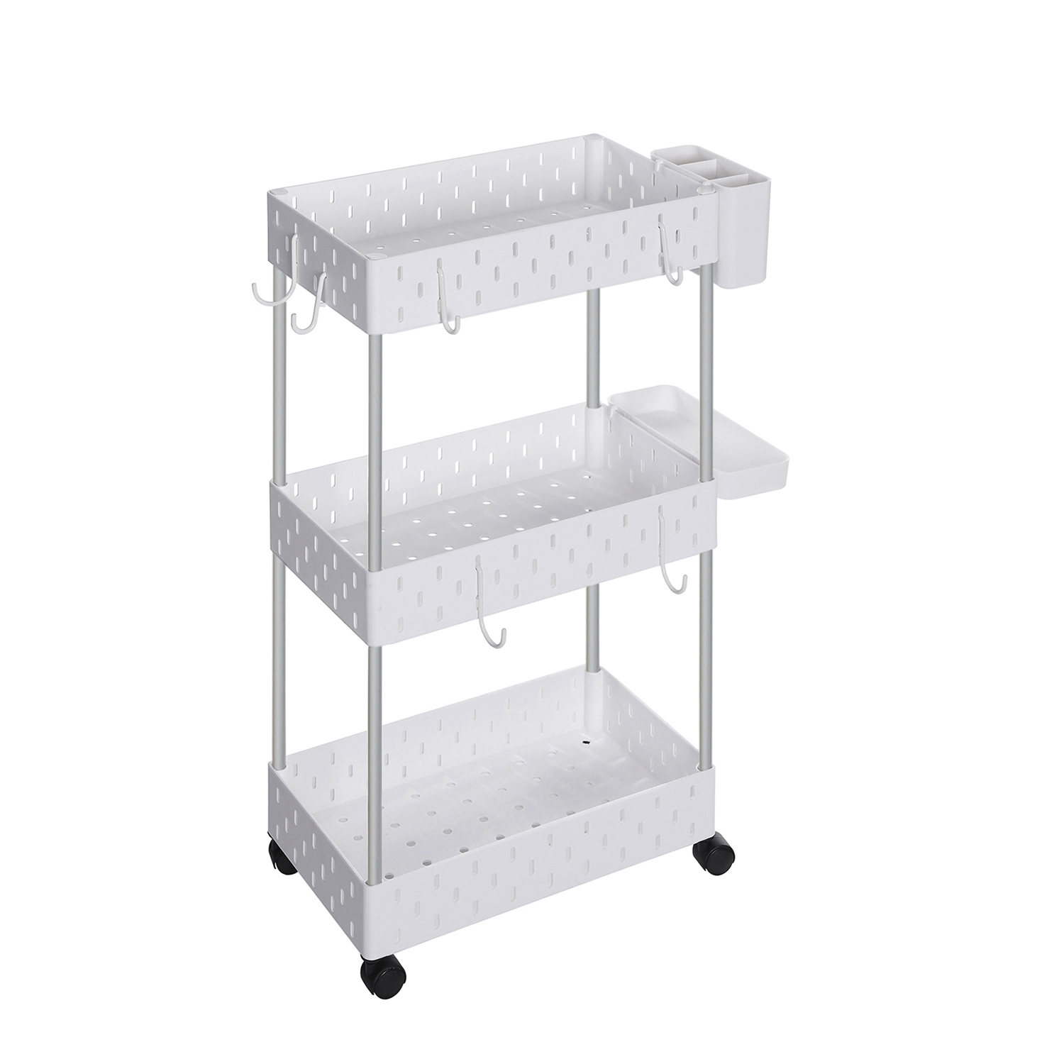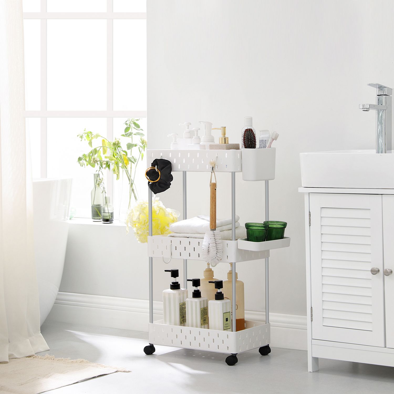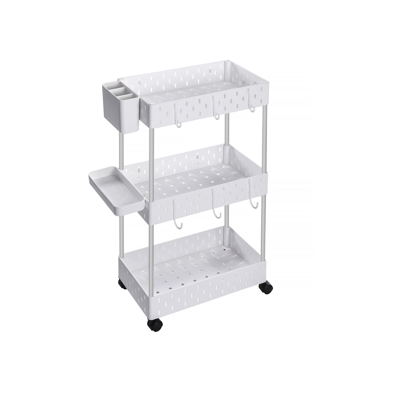 Are some of the items you used yesterday already missing today, forcing you to spend a lot of time looking for them? Don’t worry, this trolley from SONGMICS will help you put an end to this annoying game of hide and seek! Everything within reach: Equipped with 3 high-quality PP plastic shelves and supported by sturdy aluminum tubes, this trolley offers enough space for all those items that have not yet found a permanent place in your home. This multi-talented trolley can also easily withstand heavy weights. Thanks to its compact size, the serving trolley fits perfectly in the bathroom for storing beauty products, in the kitchen for storing kitchen utensils, or in the office for storing documents. If you want to have frequently used items always at hand, this product from SONGMICS is just right for you! Product details:- Color: White – Material: PP (polypropylene), aluminum – Size: 38 x 22 x 72 cm (L x W x H) – Weight: 2.7 kg – Max. total static load capacity: 30 kg – Max. static load capacity per shelf: 10 kg Scope of delivery:- 1 x rolling cart – 6 x hooks – 1 x tray – 1 x organizer with 3 compartments – 1 x instructions SONGMICS notes: – Only assemble the product as described in these instructions. Please do not disassemble it by force. – Each shelf can hold up to 10 kg. Please do not store any heavier items on the product. – When assembling, please do not press directly on the ends of the tubes with your hands to avoid injury.