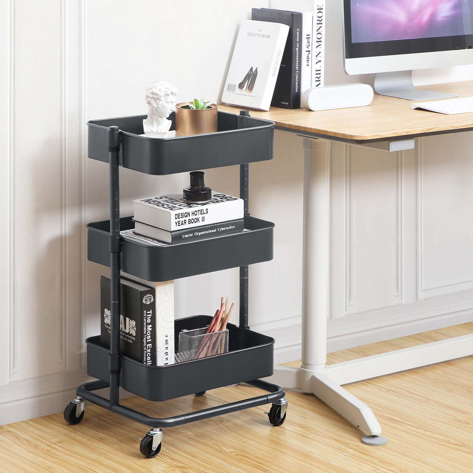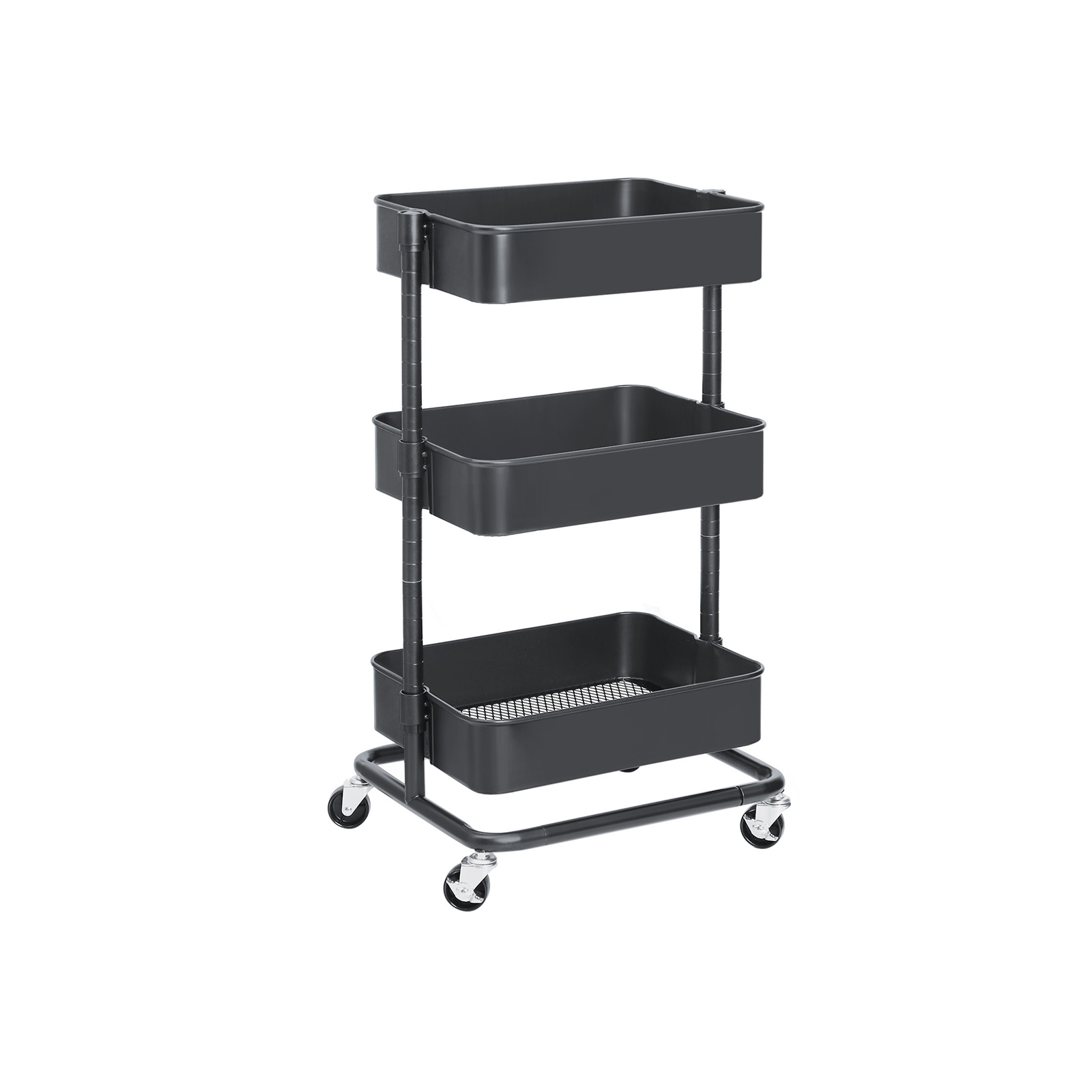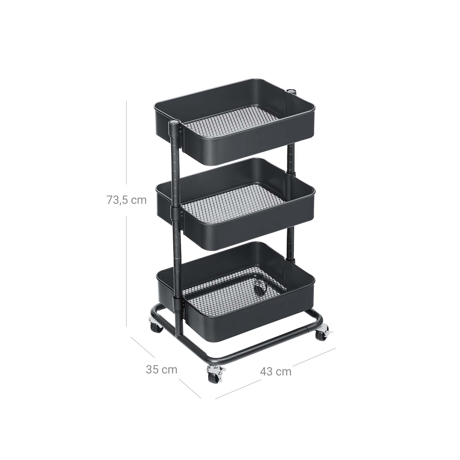 Versatile and spacious – this trolley from SONGMICS is a faithful defender against chaos in your home, classroom, and office. It has 4 high-quality casters, 2 of which are lockable, so it can be moved back and forth or kept in one place.Why choose the SONGMICS trolley? Because of its long service life: Thanks to its sturdy, powder-coated steel tubes and high-quality plastic connectors, this shelf is particularly durable. Because of its easy access: This trolley can be easily moved from one room to another, making it easy to transport small items. The open storage compartments also allow you to quickly access these items. Because of the additional storage space: With 3 height-adjustable storage compartments (37.5 x 29.5 x 8.5 cm, 38 x 30 x 8.5 cm, and 38.5 x 30.5 x 8.5 cm), this shelf offers spacious storage for frequently used everyday items, your children’s toys, etc. If you need a versatile, spacious trolley, this all-purpose trolley from SONGMICS is just right for you! Product details:Color: Gray Material: Steel Size: 43 x 35 x 73.5 cm (L x W x H) Weight: 4.7 kg Max. static load capacity per level: 10 kg Scope of delivery: 1 x rolling cart 1 x container with accessories 1 x instructions (DE, EN, FR, ES, IT)