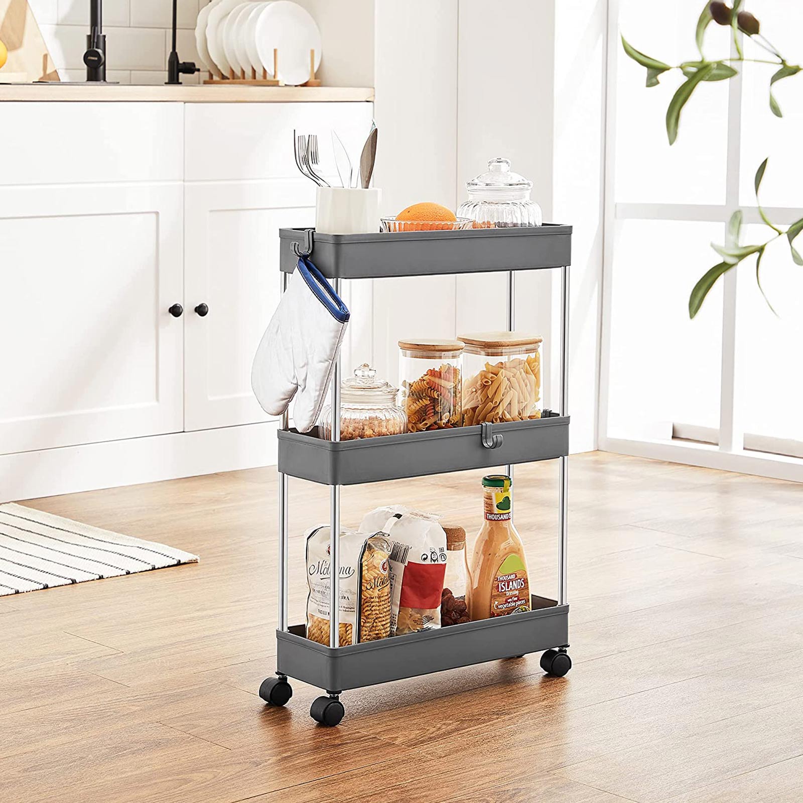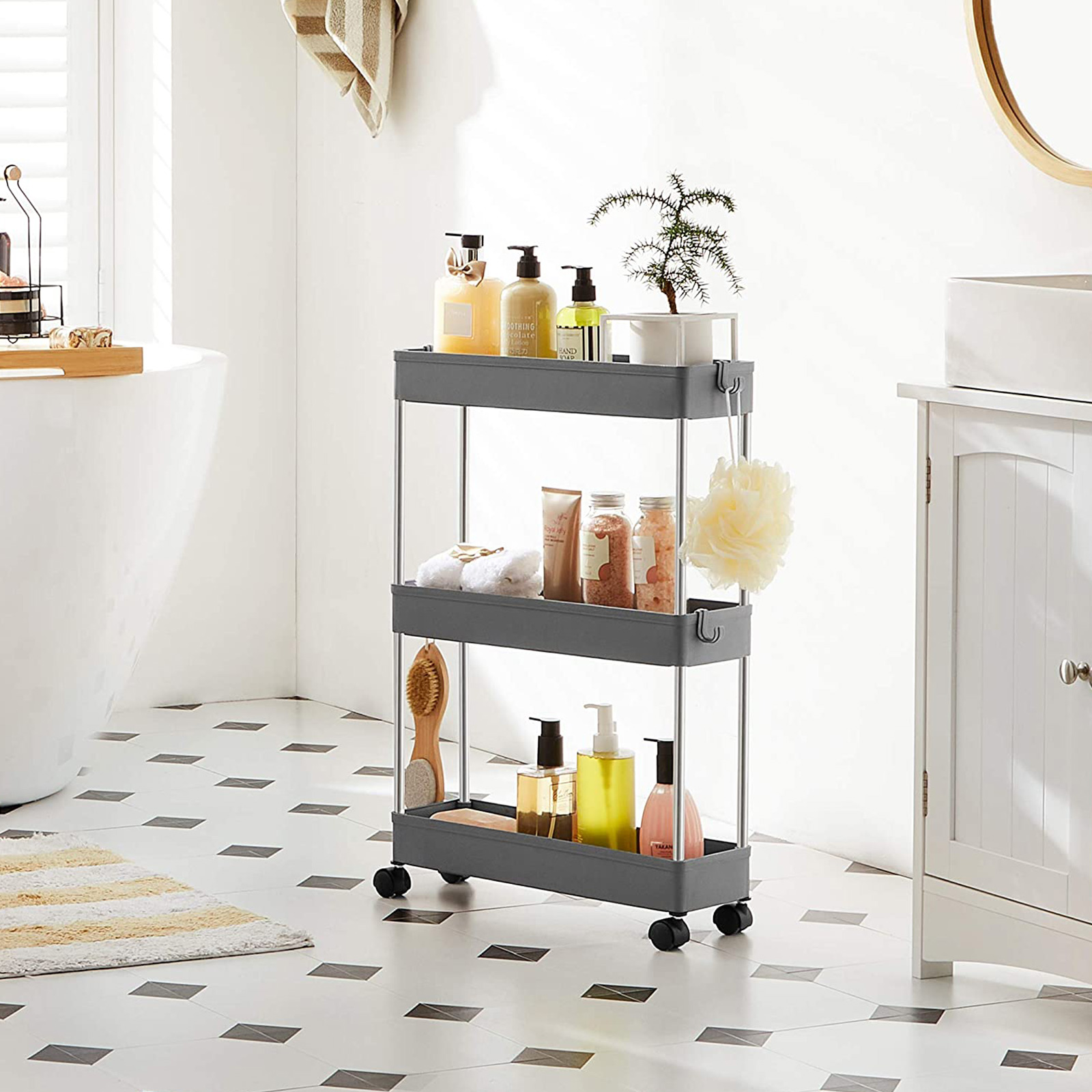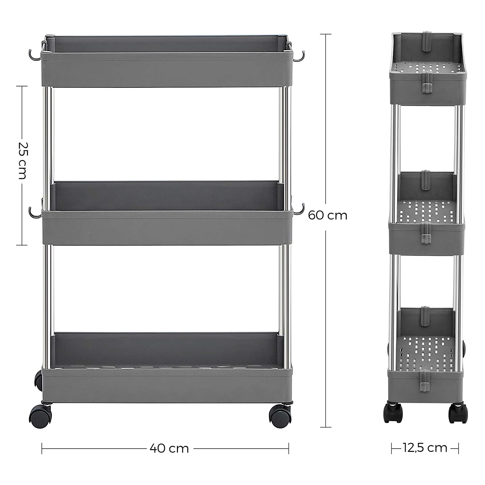 Are some of the items you used yesterday already missing today, and do you have to spend a lot of time looking for them? Don’t worry, this trolley from SONGMICS will help you put an end to this annoying game of hide and seek! Everything within reach: Equipped with 3 high-quality PP plastic shelves and supported by sturdy metal tubes, this trolley offers enough space for all those items that have not yet found a permanent place in your home. This multi-talented trolley can also easily withstand their weight. Thanks to its compact size (40 x 13.5 x 60 cm), the serving trolley fits perfectly in the bathroom for storing beauty products, in the kitchen for storing kitchen utensils, or in the office for storing documents. If you want to have frequently used items always at hand, this product from SONGMICS is just right for you! Product details:Color: Gray Material: PP (polypropylene), metal tubes Size: 40 x 13.5 x 60 cm (L x W x H) Weight: 0.9 kg Max. total static load capacity: 15 kg Max. static load capacity per shelf: 5 kg Scope of delivery: 1 x trolley 3 x hooks 1 x instructions SONGMICS notes:Assemble the product only as described in these instructions. Please do not disassemble it by force. Each shelf can hold up to 5 kg. Please do not store heavier items on the product. When assembling, please do not press directly on the ends of the tubes with your hands to avoid injury.