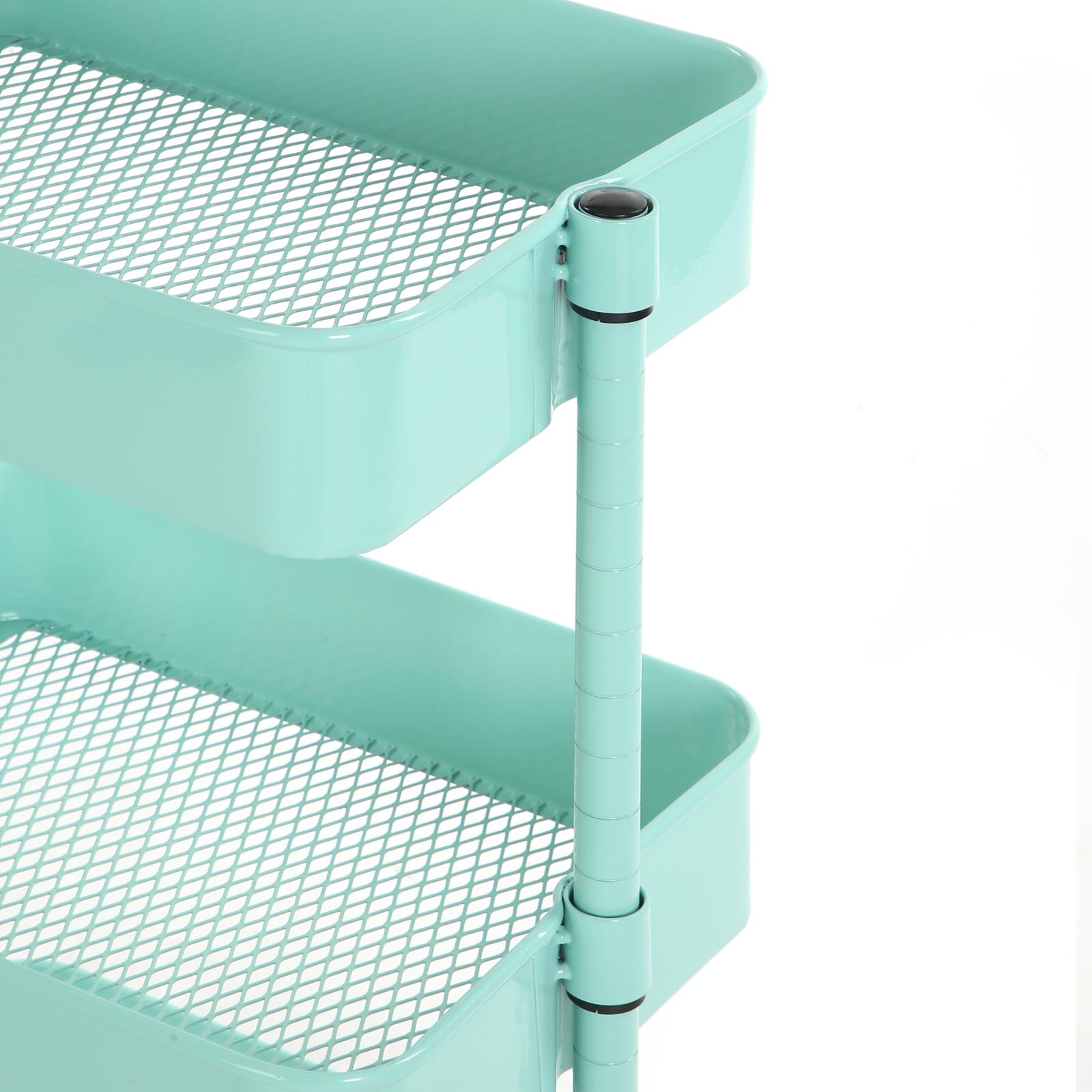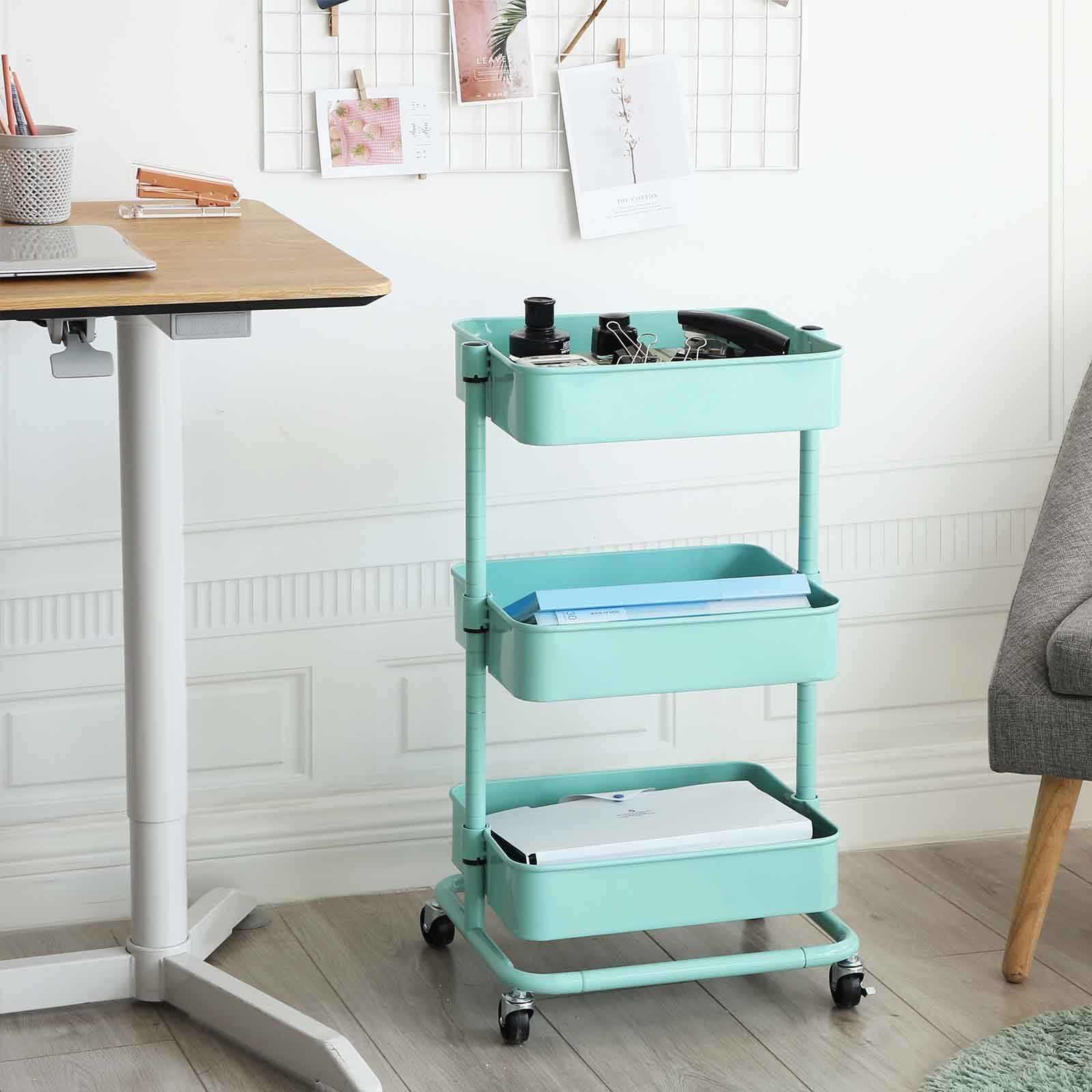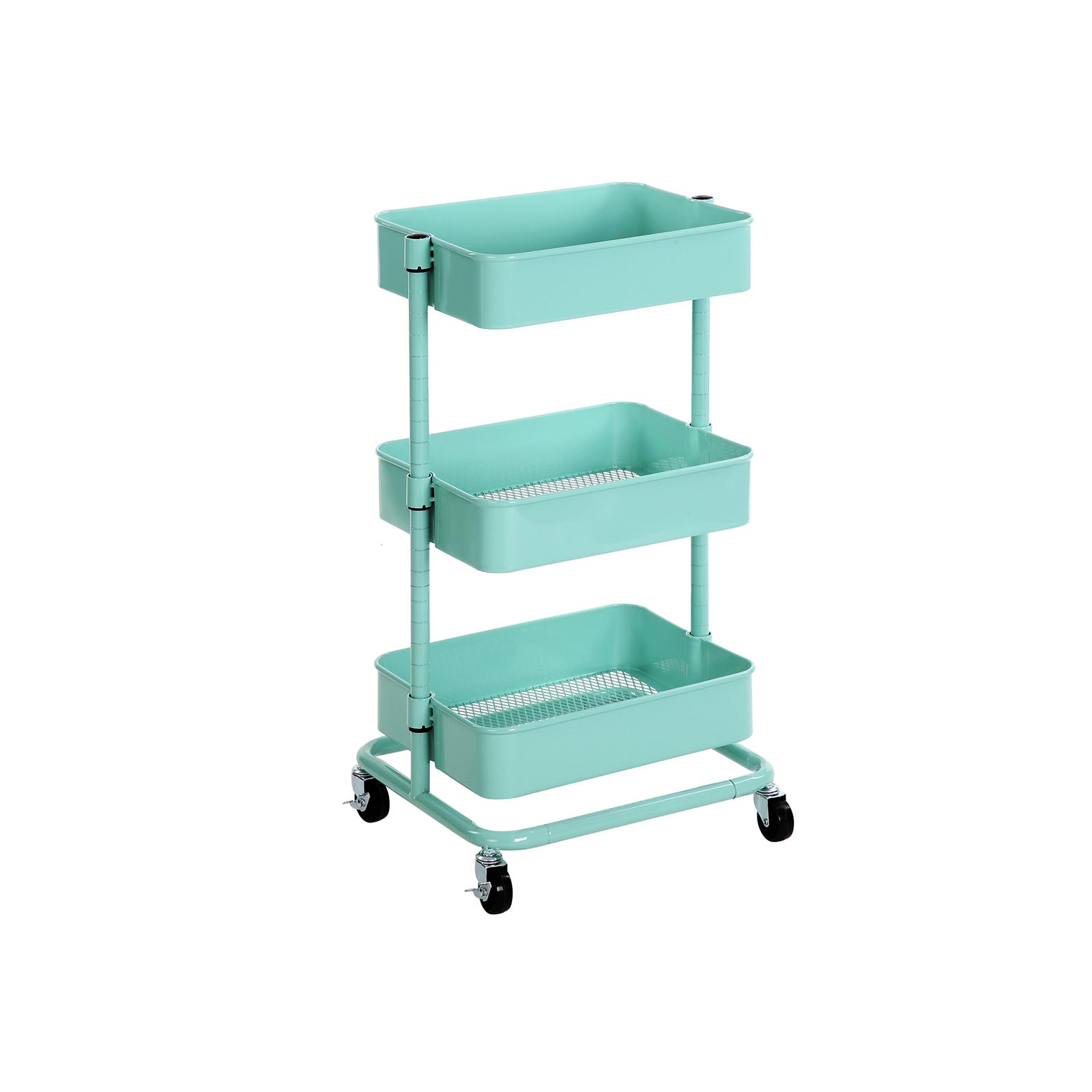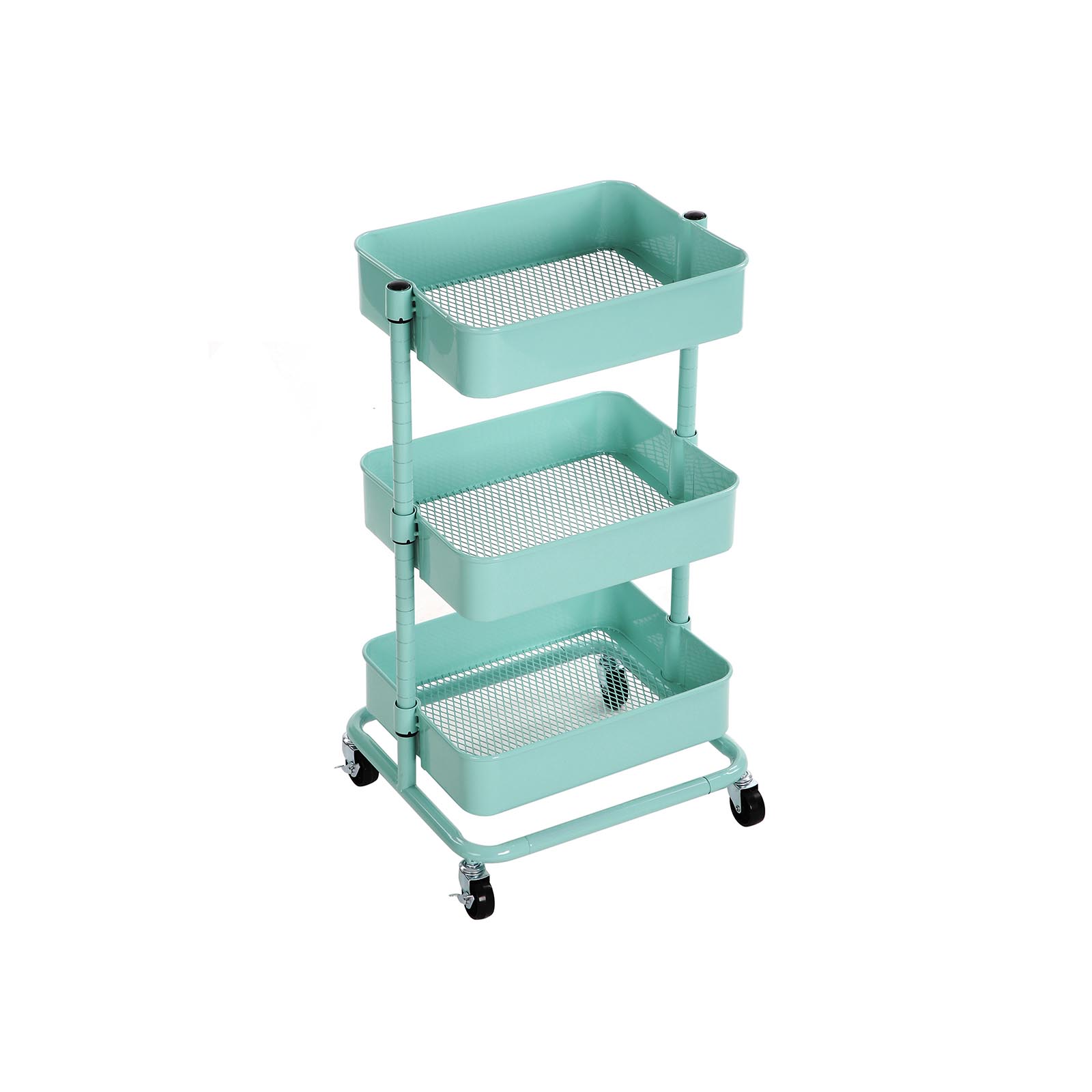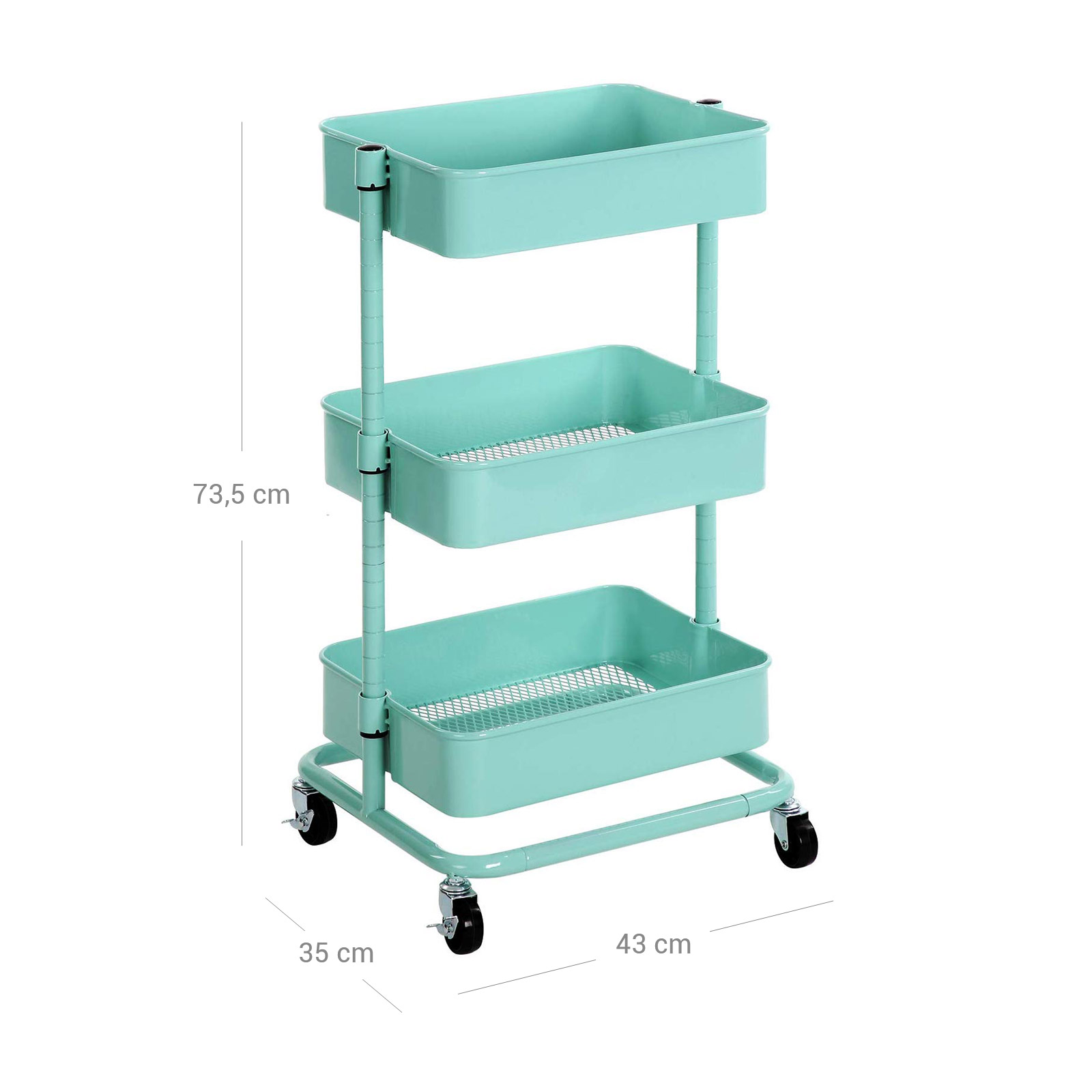 Versatile and spacious – this trolley from SONGMICS is a faithful defender against chaos in your home, classroom, and office. It has 4 high-quality casters, 2 of which are lockable, so it can be moved back and forth or kept in one place. Why choose the SONGMICS trolley? Long service life Thanks to its sturdy, powder-coated iron tubes and high-quality plastic connectors, this shelf is particularly durable. Easy access This trolley can be easily moved from one room to another, making it easy to transport small items. Thanks to the open storage compartments, you can also quickly access these items. Due to the additional storage space With 3 height-adjustable storage compartments (37.5 x 29.5 x 8.5 cm, 38 x 30 x 8.5 cm, and 38.5 x 30.5 x 8.5 cm), this shelf offers spacious storage for frequently used everyday items, your children’s toys, etc. If you need a versatile, spacious trolley, this all-purpose trolley from SONGMICS is just right for you! Product details:- Color: Mint green – Material: Iron – Size: 43 x 35 x 73.5 cm (L x W x H) – Weight: 4.7 kg – Max. static load capacity per level: 10 kg Scope of delivery: – 1 x rolling cart – 1 x container with accessories – 1 x instructions (DE, EN, FR, ES, IT)
