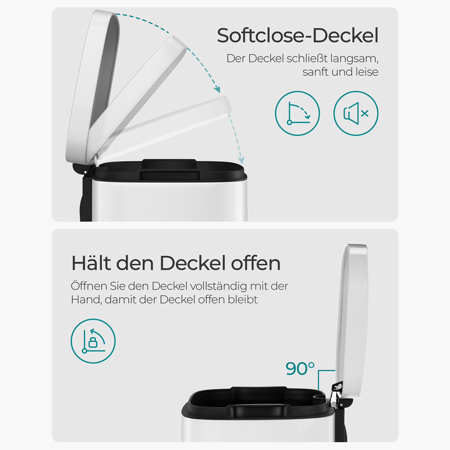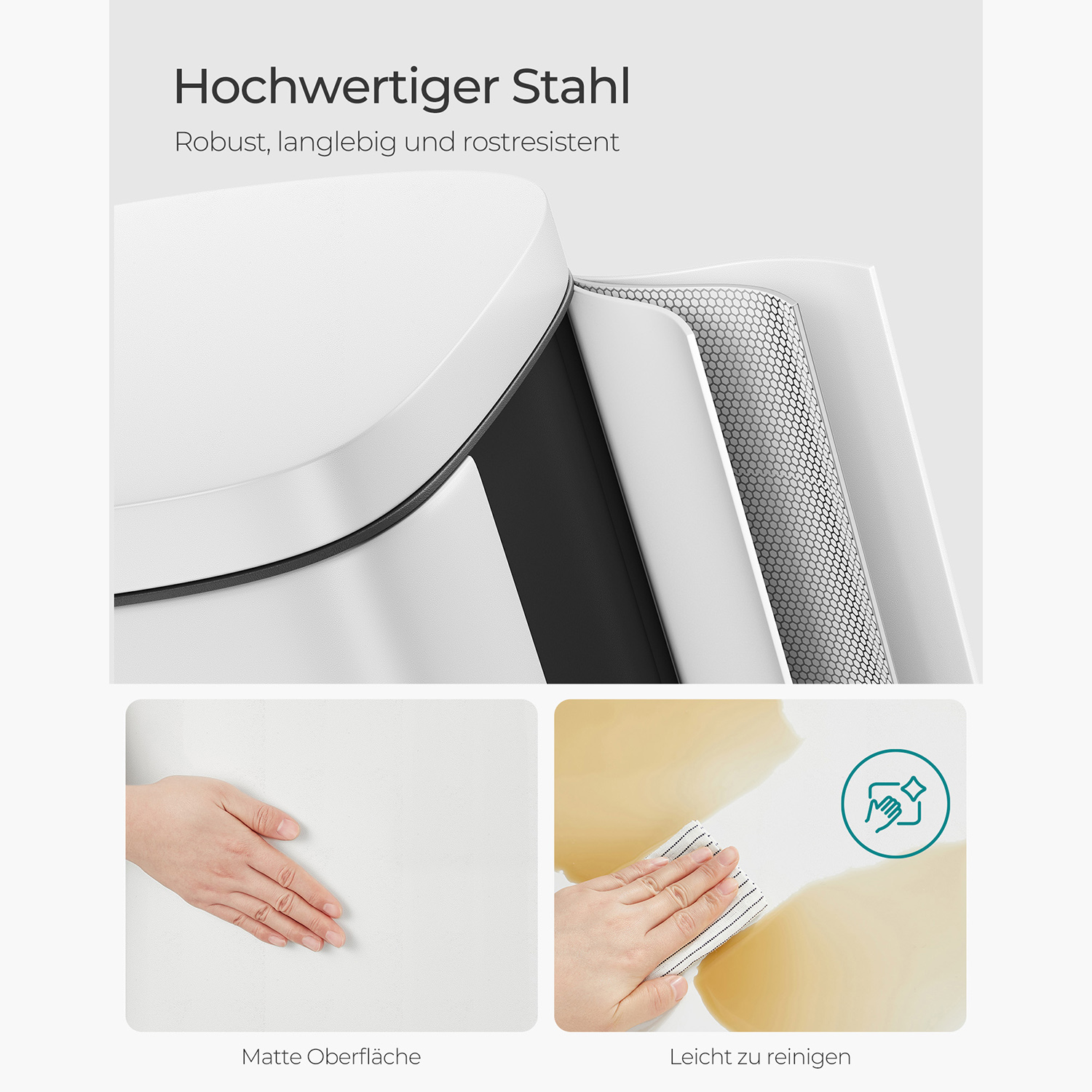Recycling can be easy: this trash can has a capacity of 30 L and protects your family from bacteria and unpleasant odors thanks to its airtight seal. But the best thing about this trash can is that you don’t have to touch it with your hands when disposing of waste, ensuring a high level of hygiene.A “puppy- and child-proof” trash can: Does your dog often rummage through the trash can? Do your little ones frequently reach into the open container? If so, you’ll definitely want to put a stop to that. That’s where our pedal trash can comes in! The lid only opens when you press the pedal. With its high-quality material and practical design, this trash can offers a smart solution for waste disposal.Product details: Color: White Material: Steel, plastic (inner bucket) Size: 35 x 23.8 x 63 cm (L x W x H) Inner bucket size: 35 x 23.5 x 57.5 cm (L x W x H) Total height (with lid open): 85.5 cm Weight: 3.8 kg Scope of delivery: 1 x trash can SONGMICS Notes: To clean the product, please wipe it with a soft, damp cloth and use mild cleaning agents if necessary.