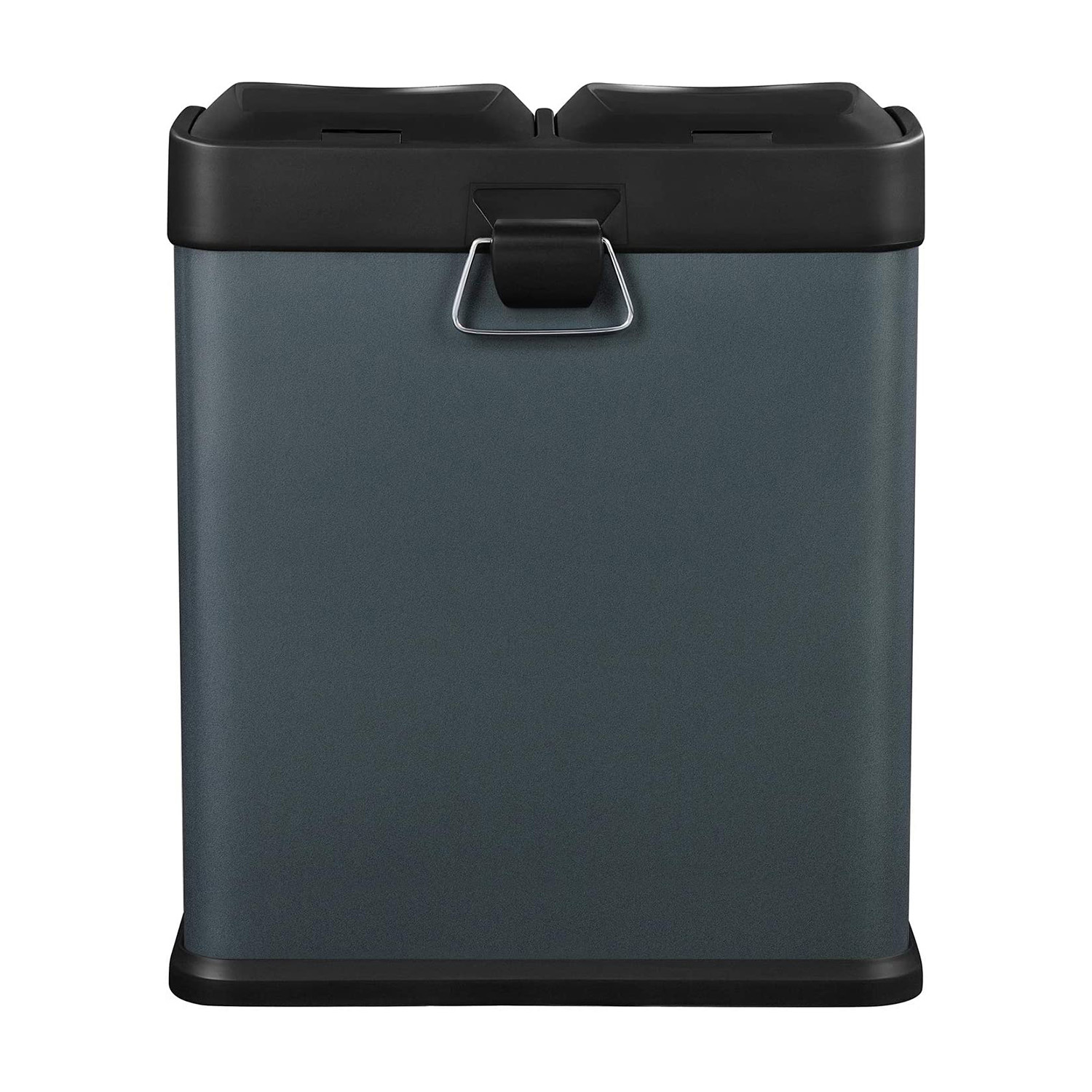 Recycling can be easy: this pedal bin with 2 separate compartments makes it easy to sort your waste, e.g., residual waste and organic waste. All you have to do is press the pedal and throw the waste into the inner bin. You don’t even have to touch the trash can with your hands, which ensures hygiene. A “puppy- and child-proof” trash can: Does your dog often rummage through the trash can? Do your little ones often reach into the open bin? If so, you’ll definitely want to put a stop to that. That’s where our pedal bin comes in! The lid only opens when you press the pedal. Product details: Color: Smoke gray-black Material: Stainless steel, ABS plastic Overall size: 39.9 x 30 x 47 cm (L x W x H) Size of each inner bin: 18.4 x 26.3 x 40 cm (L x W x H) Total height (with lid open): 72 cm Weight: 4.3 kg Scope of delivery: 1 x trash can
