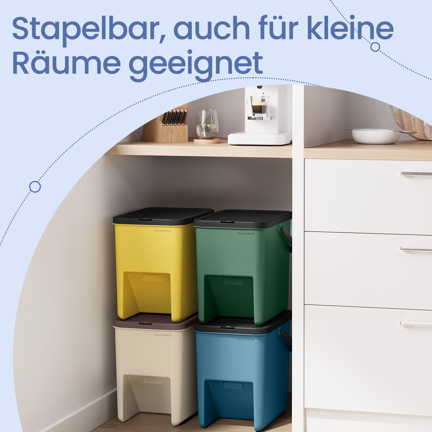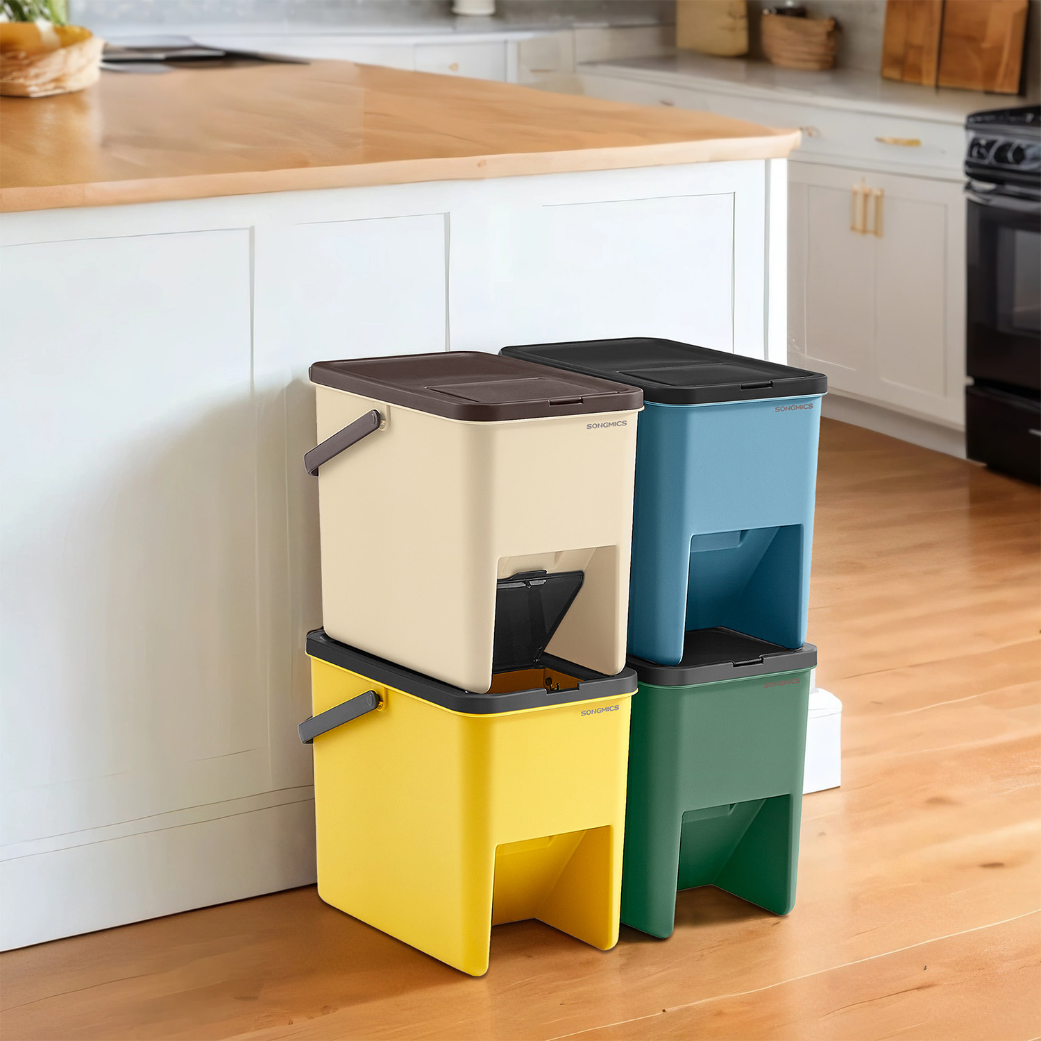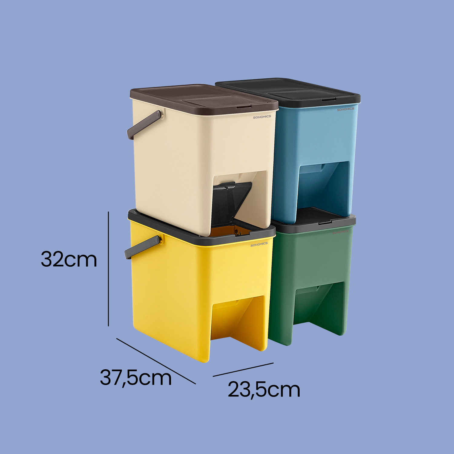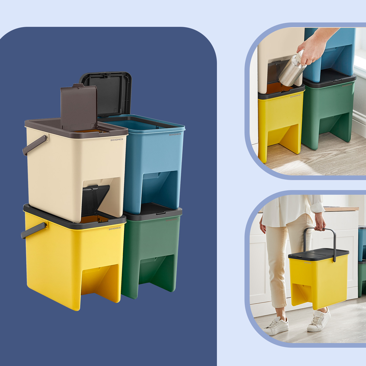 SONGMICS Kitchen Trash Can, Set of 4 Stackable Trash Cans, 20 L Each, Waste Separation System, Hinged Lid, with Stickers, Storage Box, Yellow, Blue, Beige, and Green LTB760Q01