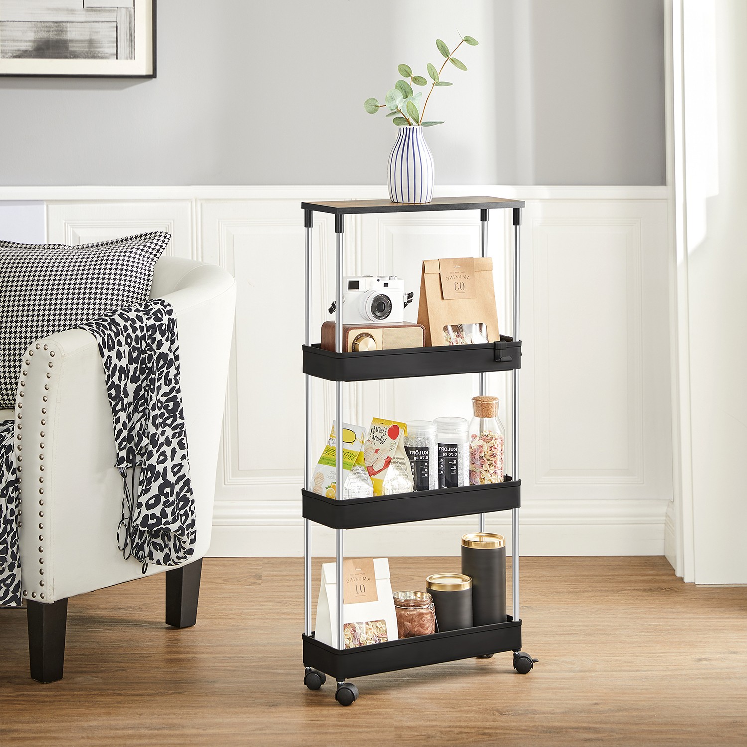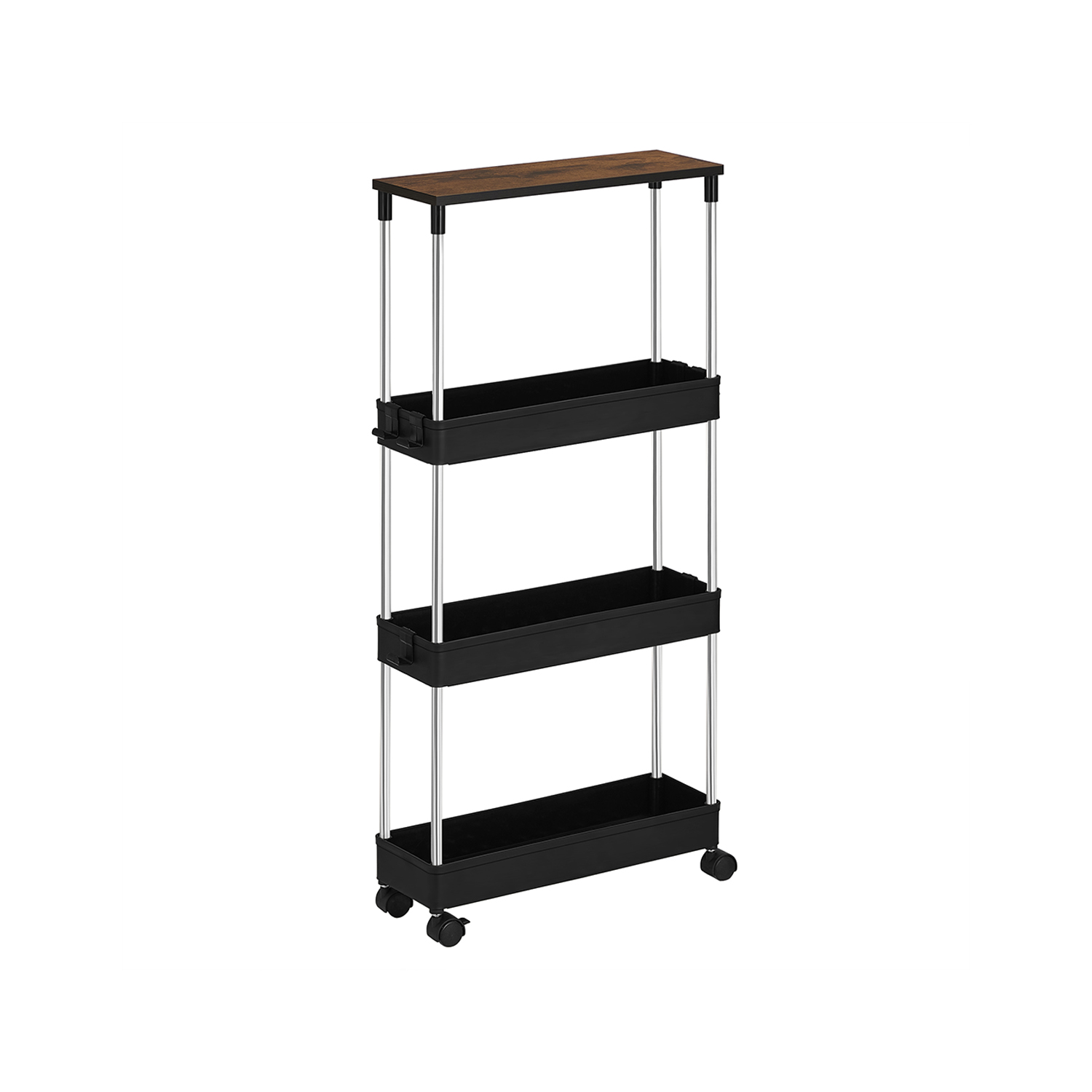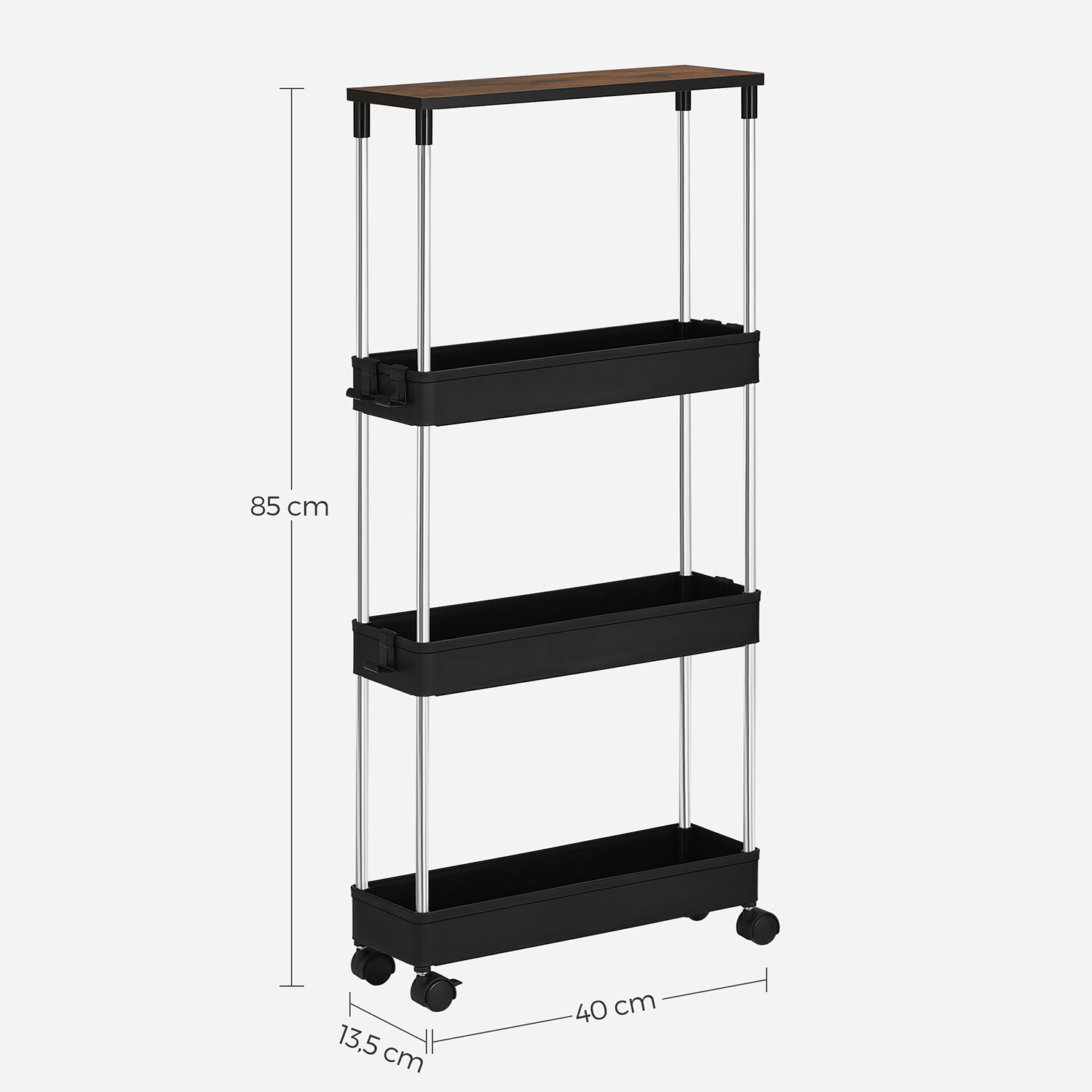 A chic storage solution: An overflowing dresser? Limited space in your kitchen? A small niche next to your refrigerator? Then it’s time for our SONGMICS kitchen shelf. It takes up very little space but offers plenty of room for your belongings and proves its worth even in narrow niches or small corners. Functional and flexible: the top shelf provides additional storage space when you want to prepare a meal, for example. Three baskets ensure that you have everything you need at your fingertips, and the six hooks offer additional storage space for hanging items. The sturdy structure and 4 smooth-running casters make it easy to roll the cart around and use it as needed. Product details: Color: Vintage brown-black Material: PP (polypropylene), stainless steel, chipboard Size: 40 x 13.5 x 85 cm (L x W x H) Weight: 1.4 kg Max. total static load capacity: 15 kg Max. static load capacity per basket: 5 kg Scope of delivery: 1 x trolley 6 x hooks 1 x instructions SONGMICS Notes: Only assemble the product as described in these instructions. Please do not disassemble it by force. Please do not store heavy items on the product to prevent it from tipping over. This niche shelf should be used in narrow gaps or small corners. When assembling, please do not press directly on the ends of the tubes with your hands to avoid injury.