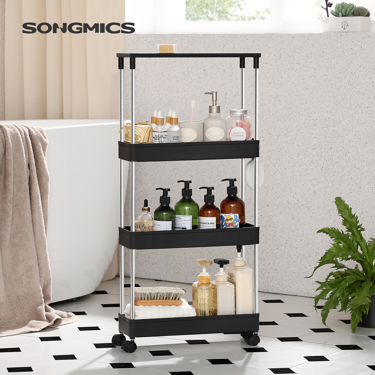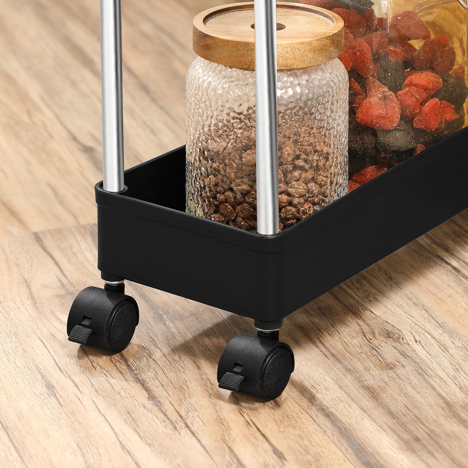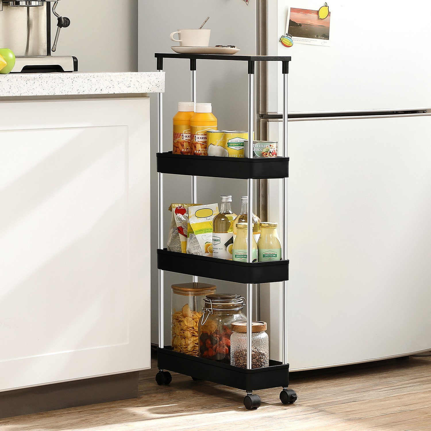 A chic storage solution: An overflowing dresser? Limited space in your kitchen? A small niche next to your refrigerator? Then it’s time for our SONGMICS kitchen shelf. It takes up very little space but offers plenty of room for your belongings and proves its worth even in narrow niches or small corners. Functional and flexible: the top shelf provides additional storage space when you want to prepare a meal, for example. Three baskets ensure that you have everything you need at your fingertips, and the six hooks offer additional storage space for hanging items. The sturdy structure and 4 smooth-running casters make it easy to roll the cart around and use it as needed. Product details: Color: Vintage brown-black Material: PP (polypropylene), stainless steel, chipboard Size: 40 x 13.5 x 85 cm (L x W x H) Weight: 1.4 kg Max. total static load capacity: 15 kg Max. static load capacity per basket: 5 kg Scope of delivery: 1 x trolley 6 x hooks 1 x instructions SONGMICS Notes: Only assemble the product as described in these instructions. Please do not disassemble it by force. Please do not store heavy items on the product to prevent it from tipping over. This niche shelf should be used in narrow gaps or small corners. When assembling, please do not press directly on the ends of the tubes with your hands to avoid injury.
