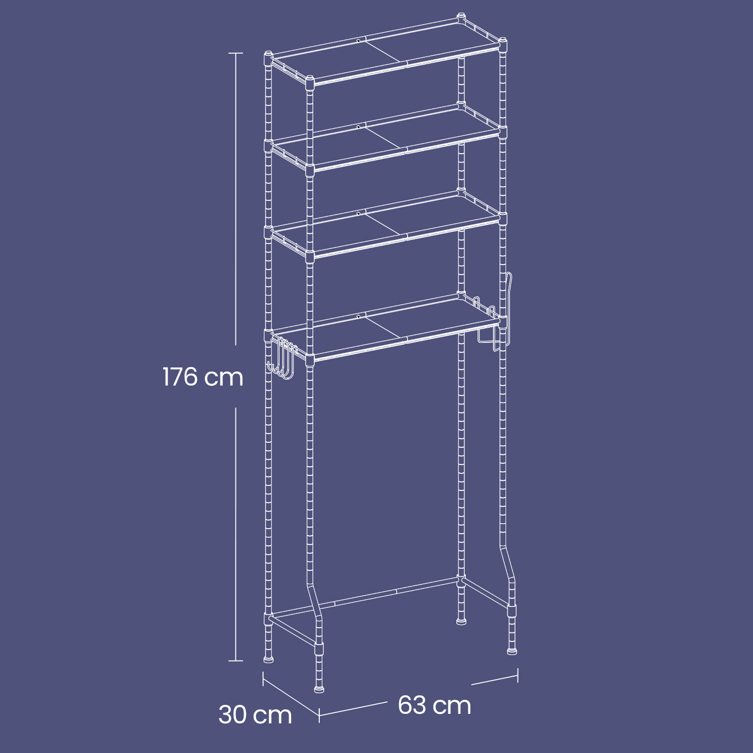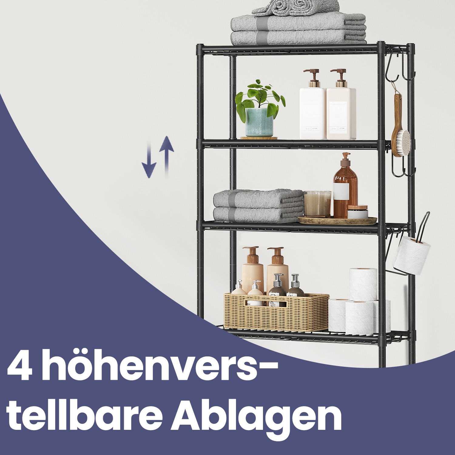 SONGMICS 4-tier toilet shelf, bathroom shelf, washing machine shelf, adjustable shelves, with hooks, toilet paper holder, space-saving