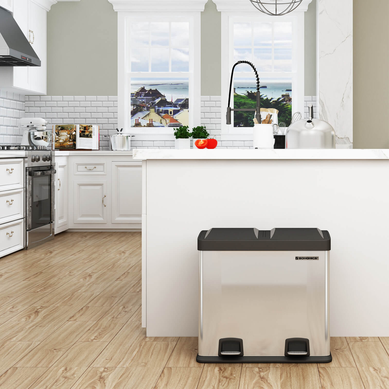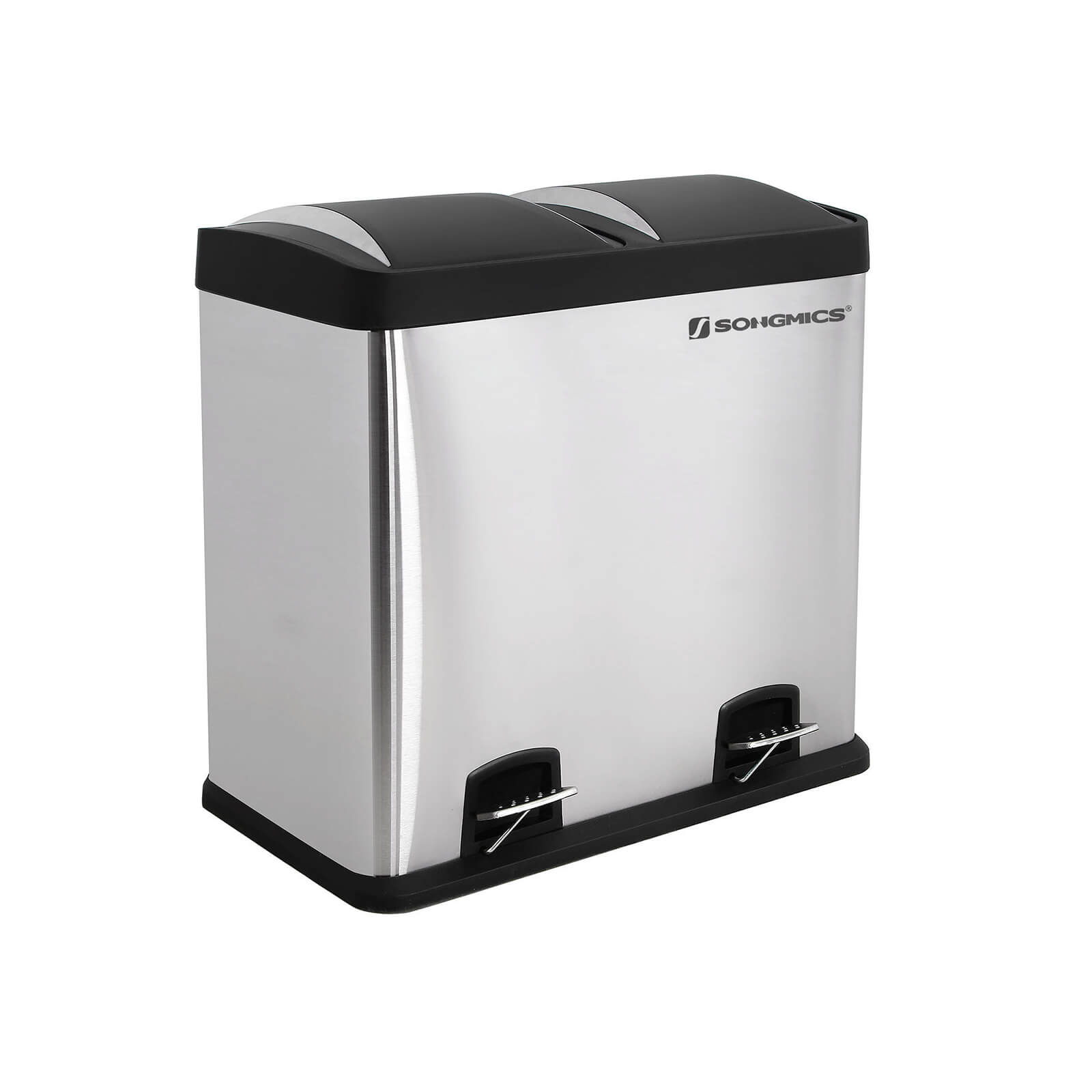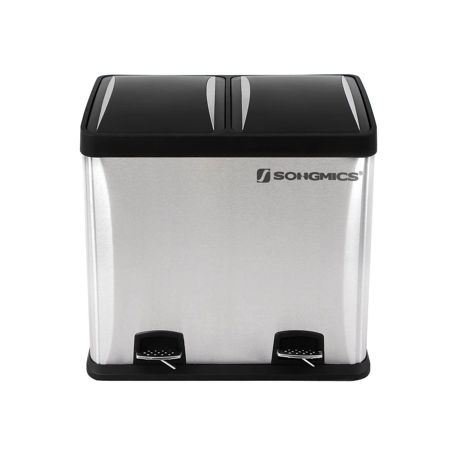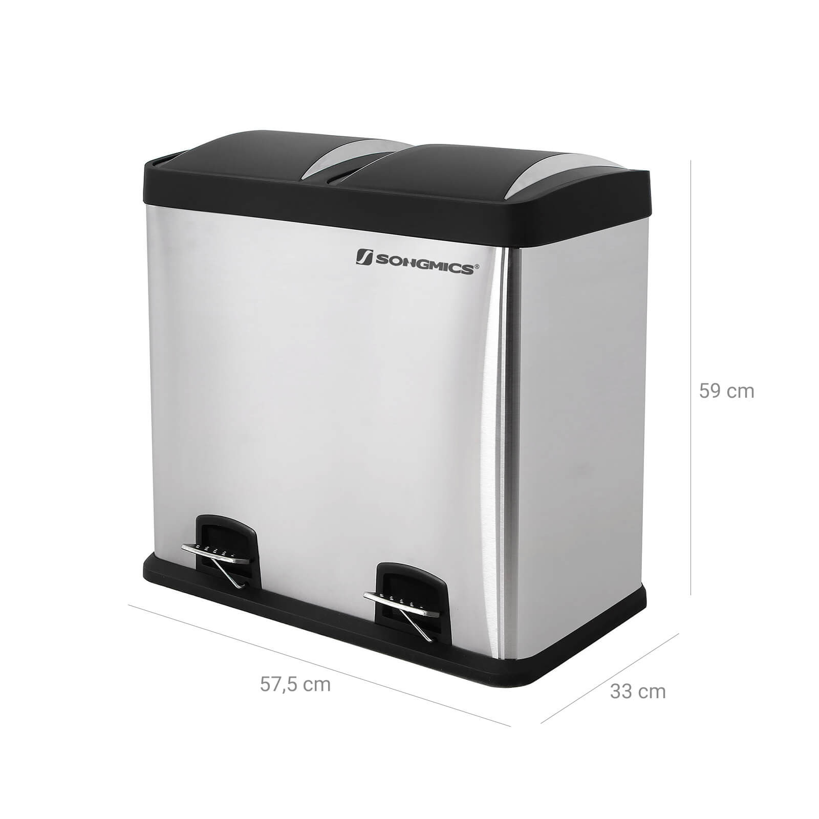 The Songmics waste bin has a classic separation system and a stylish look. Protect the environment and separate your waste optimally with this waste bin for waste separation. Simple, practical, and optimal! The two removable inner bins have handles for quick and easy emptying. Intelligent separation system with high capacity (24 L each) and compact dimensions. The pedal function allows for hygienic use of the bin. This Songmics stainless steel pedal bin fulfills its purpose perfectly. Its attractive and modern design makes it ideal for all rooms in the house, as well as for elevators, gardens, etc. A must-have for every household! Product details: – Material: stainless steel (housing); plastic (inner bucket) – External dimensions: 57.5 x 59 x 33 cm (W x H x D) – Inner bucket dimensions: 25 x 48 x 25 cm (W x H x D) – Color: silver – Net weight: 6.7 kg – Gross weight: 9.15 kg Scope of delivery: – 1 x waste separator