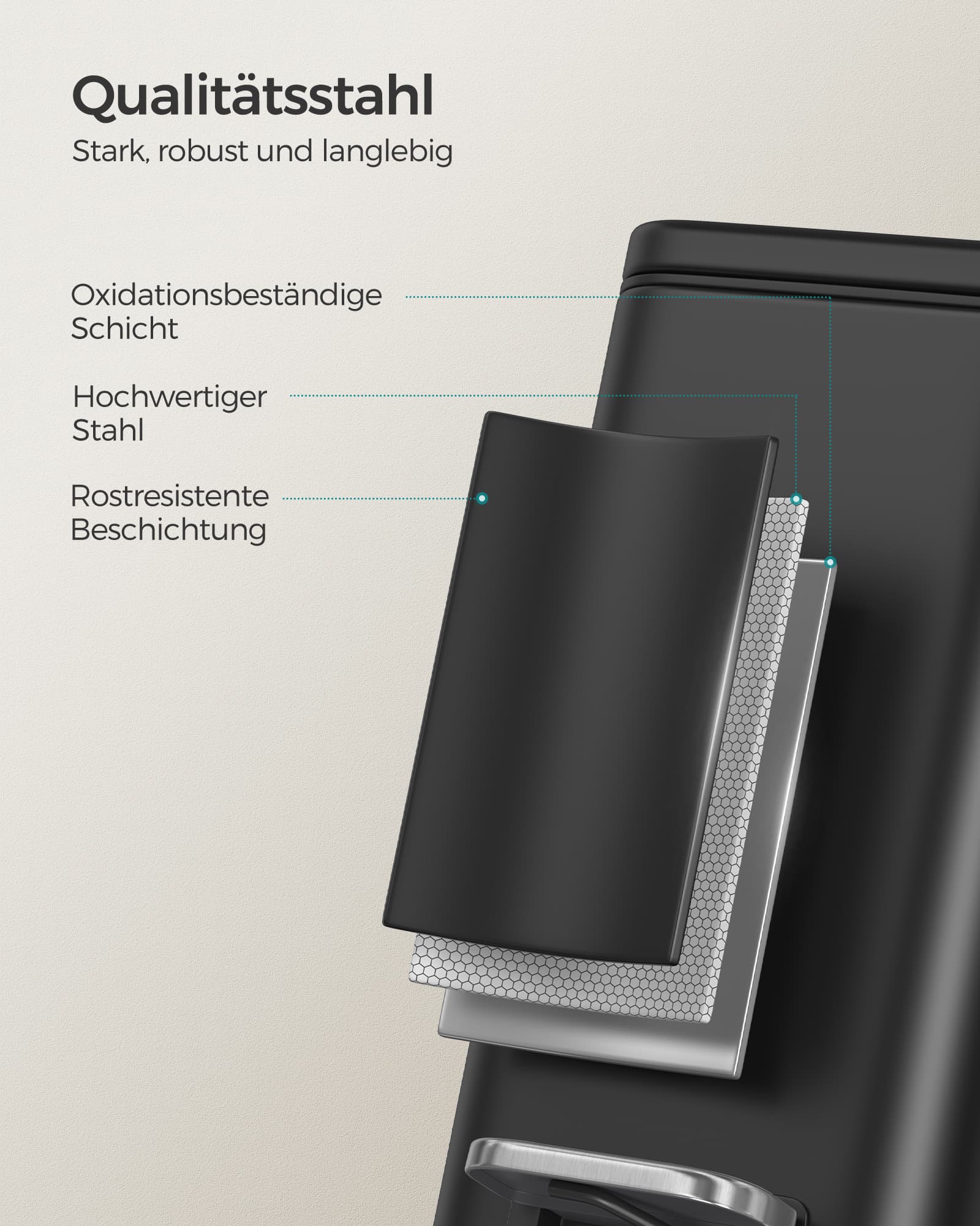 Material: Outer container made of steel, inner bucket made of PP plastic, base made of ABS plastic