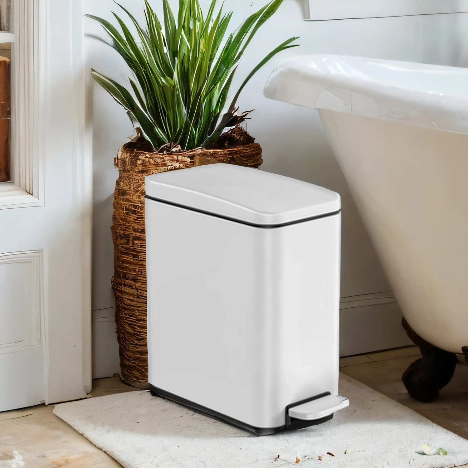 SONGMICS Cosmetic Bin and Toilet Brush Set, Bathroom Trash Can, with Lid, Pedal Bin, Small Trash Can, Narrow for Small Spaces, Steel, Soft Close