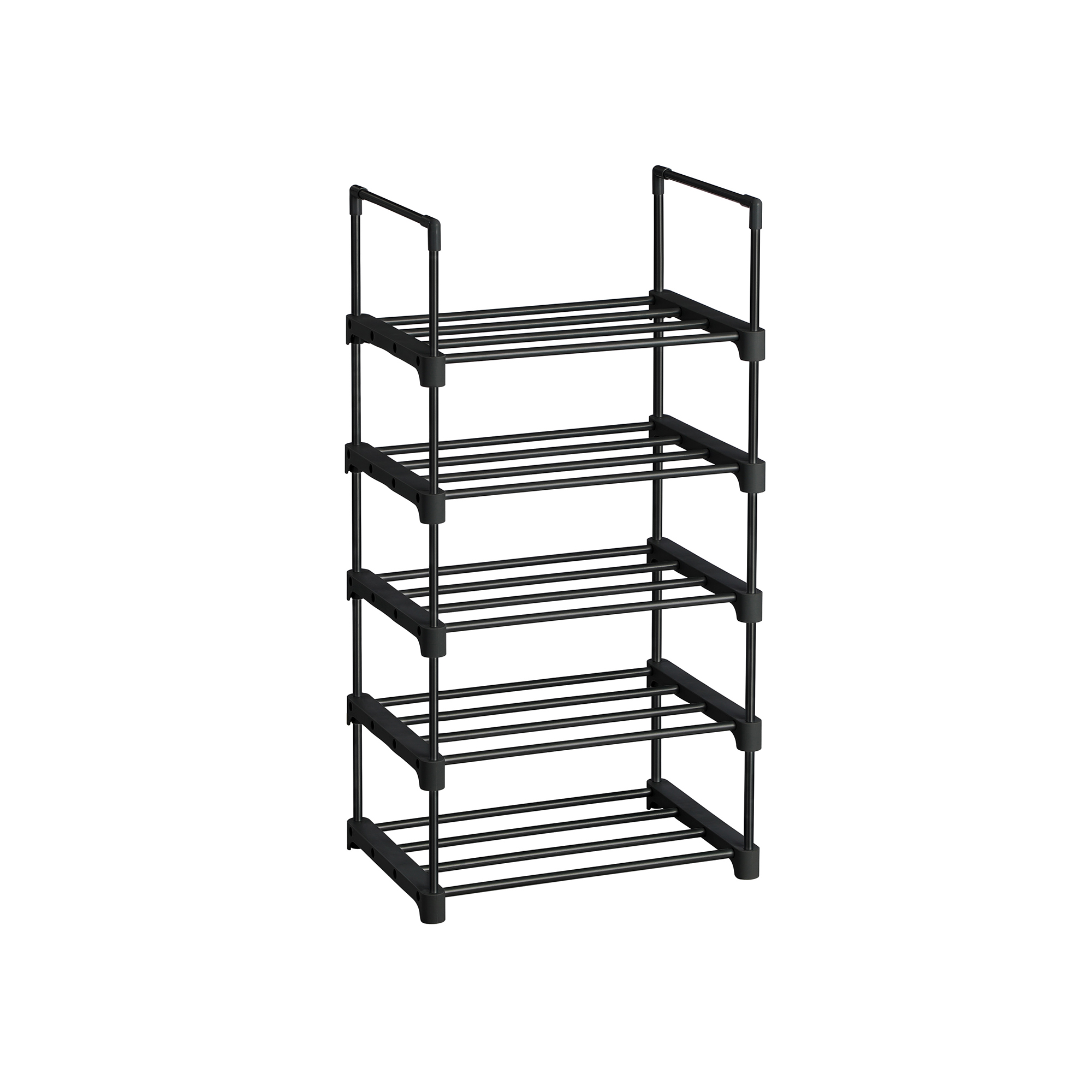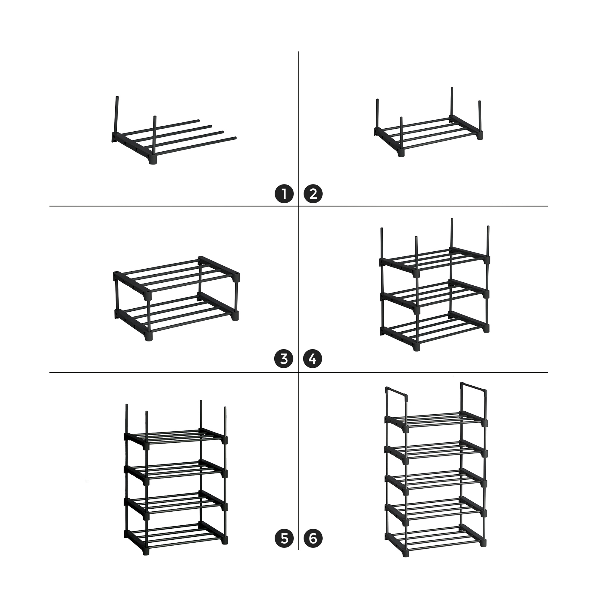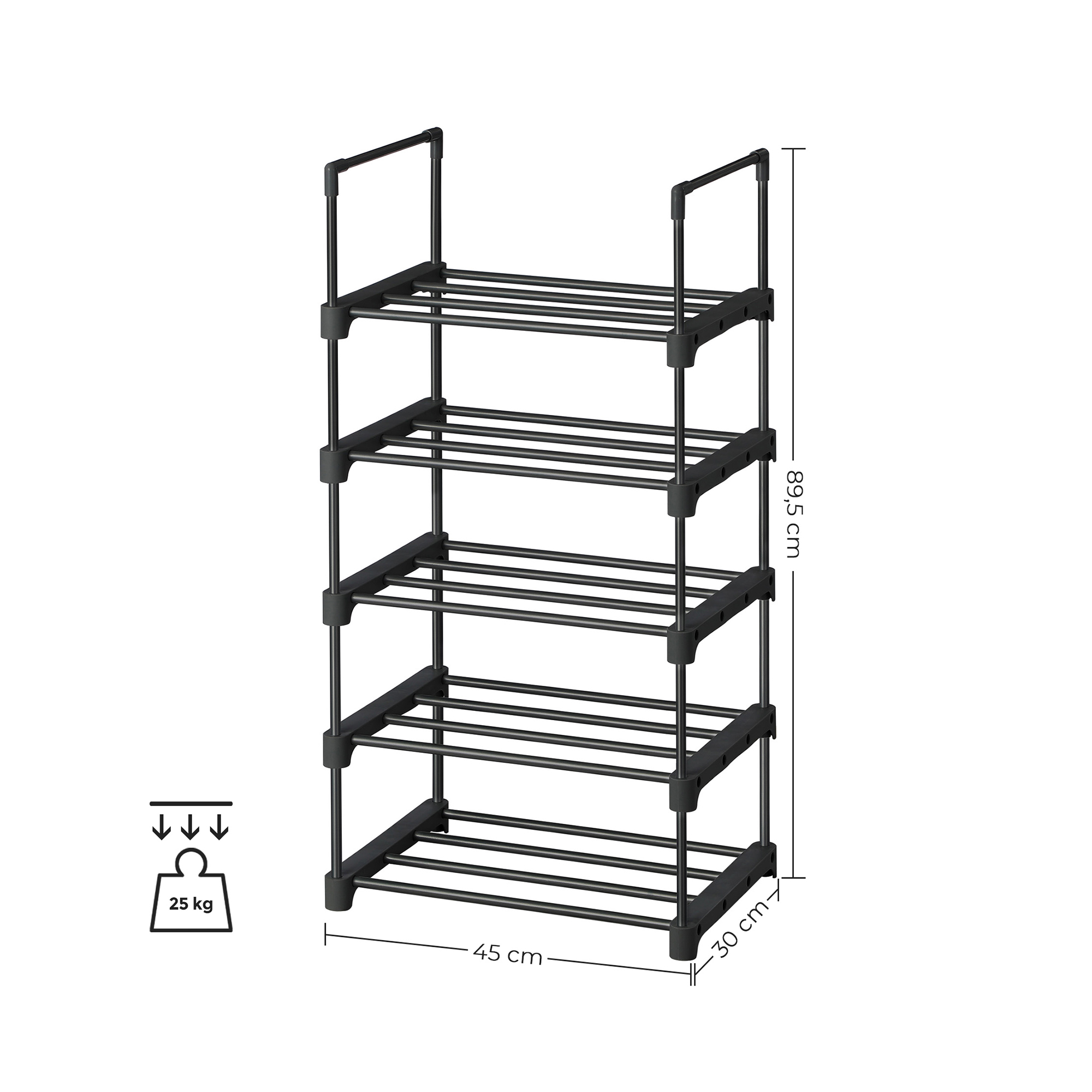Tidiness makes you happy! Every day when you come home, are you overwhelmed by the chaos of shoes in your hallway? Who can be in a good mood with that? This shoe rack with 5 shelves from SONGMICS helps you eliminate the chaos and find your inner peace. Made of reinforced metal tubes and high-quality plastic connectors, this rack provides strong support for your shoes (each shelf can hold up to 5 kg). It also impresses with its clever DIY design and easy assembly. When you master chaos, you master life! Treat yourself to this space-saving standing rack with 5 shelves and keep your shoe chaos under control. Product details: – Color: Black – Material: Metal tubing, plastic connectors – Size: 45 x 30 x 89.5 cm (L x W x H) – Weight: 1.5 kg – Max. static load capacity per shelf: 5 kg – Max. static load capacity total: 25 kg Scope of delivery:- 1 x shoe rack with 5 shelves – 1 x anti-tip bracket – 1 x instructions (DE, EN, FR, ES, IT) SONGMICS notes: – For safety reasons, children are not allowed to climb on or play with the product. – Please attach this product to the wall using the included anti-tip bracket to ensure safe use.