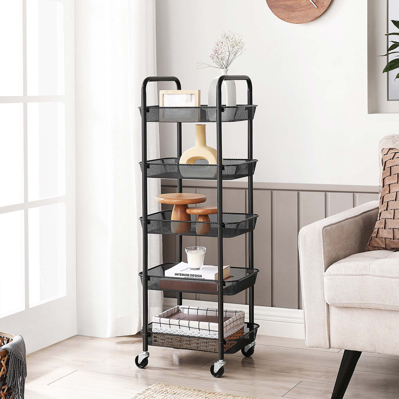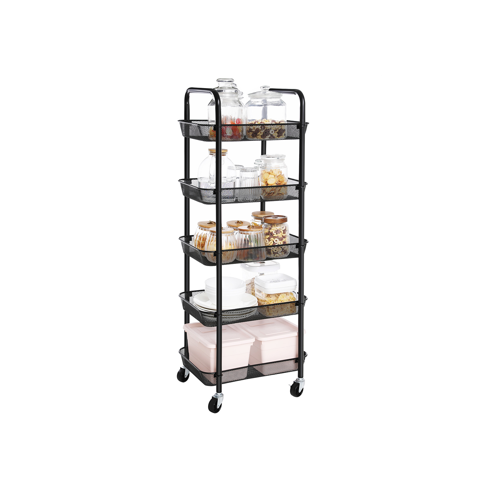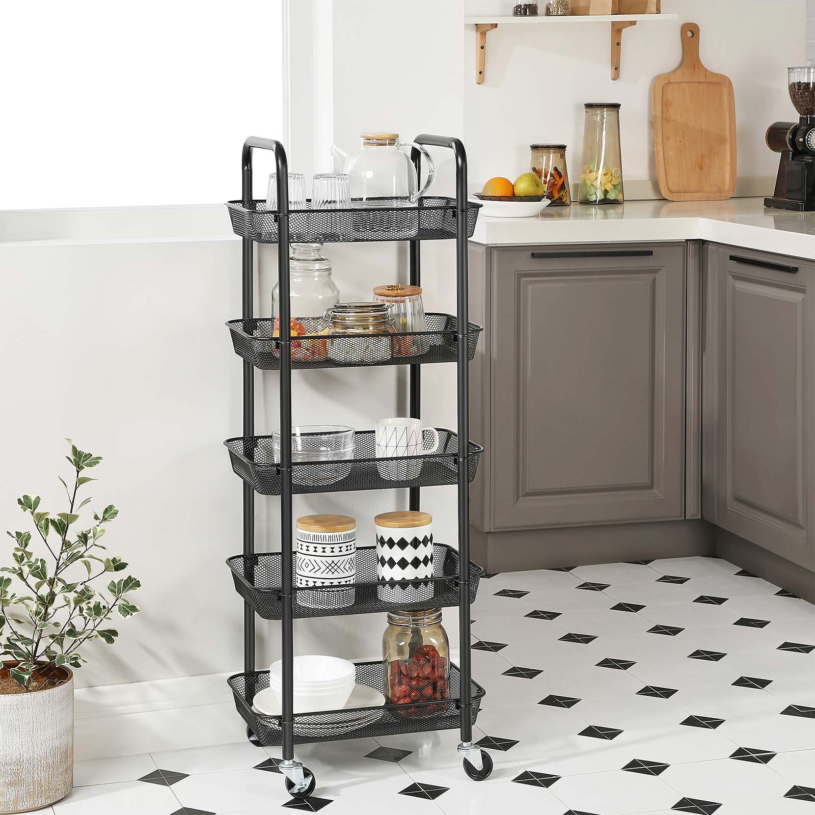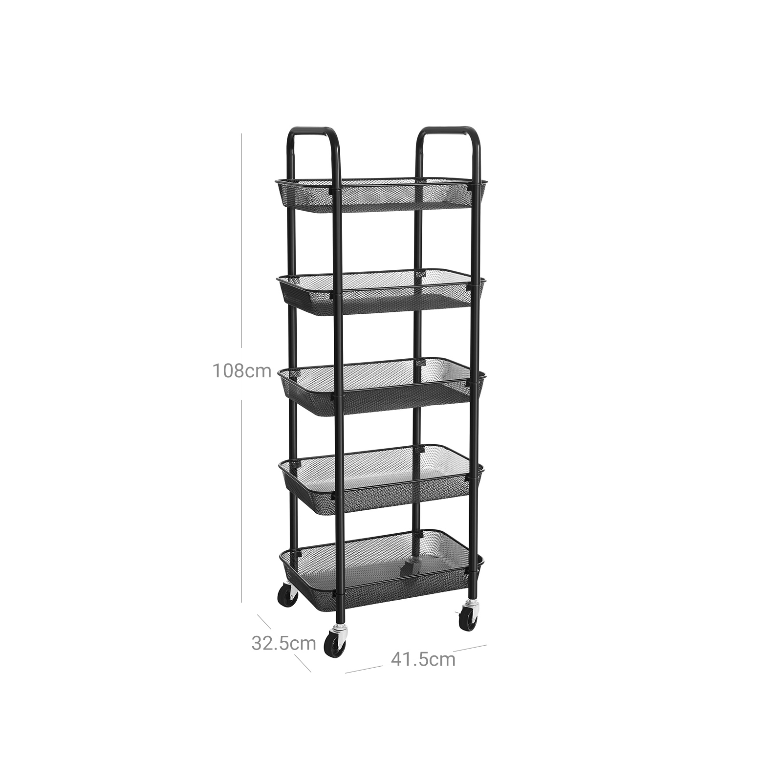Sturdy steel frame, 5 metal wire baskets, and 4 high-quality wheels (2 of which are lockable) – roll this shelf from SONGMICS to wherever you need more storage space.In the bathroom: Push this shelf next to the bathtub to keep shampoo, shower gel, towels, and other bathroom essentials within easy reach when you’re relaxing in the tub. In the kitchen: Spices in the top shelf, fruit in the middle, and vegetables in the bottom – everything has its own place! Finally, you can free your work surfaces from clutter and use them sensibly again. In the office: You can store your office supplies on this shelf and tidy up your desk. A tidy workplace is essential for productive work! If your office needs a little greenery, you can place a few small succulents on the top shelf of this shelf. Think outside the box! This trolley has endless uses! Rolling cakes and birthday presents out of the kitchen as a surprise? Transporting books? Or storing wine bottles for a cocktail party… What else? All kinds of items fit in this serving trolley.Product details: Color: Black Material: Steel Size: 41.5 x 32.5 x 108 cm (L x W x H) Weight: 4.4 kg Max. static load capacity per level: 10 kg Scope of delivery: 1 x rolling cart 1 x accessory package 1 x instructions (DE, EN, FR, ES, IT)