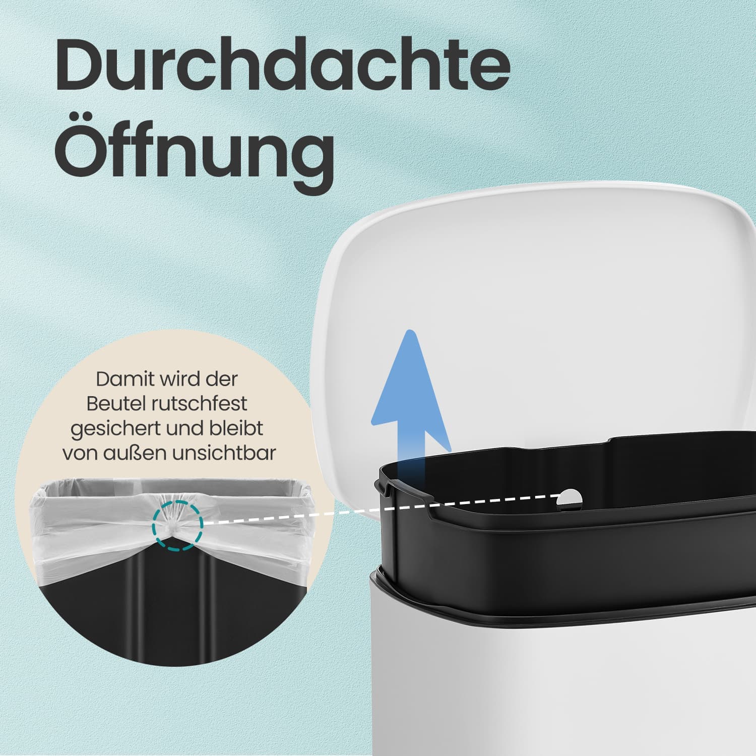 Check out the highlights of this pedal bin: – It has a capacity of 50 liters. – You can simply press the pedal to open the lid. – The lid can remain open for a longer period of time. – It closes slowly and gently without making any noise. – It comes with a removable plastic inner bucket. – The inner bucket has an opening for the plastic bag.Product details:- Color: White- Material: Steel, PP plastic (inner bucket)- Overall size: 42.4 x 32 x 65 cm (L x W x H)- Inner bucket size: 40.4 x 27.4 x 58.4 cm (L x W x H)- Total height (with lid open): 93 cm – Weight: 6.2 kg Scope of delivery: – 1 x trash can SONGIMC Notes: – To clean the product, wipe it with a soft, damp cloth and use mild cleaning agents if necessary.