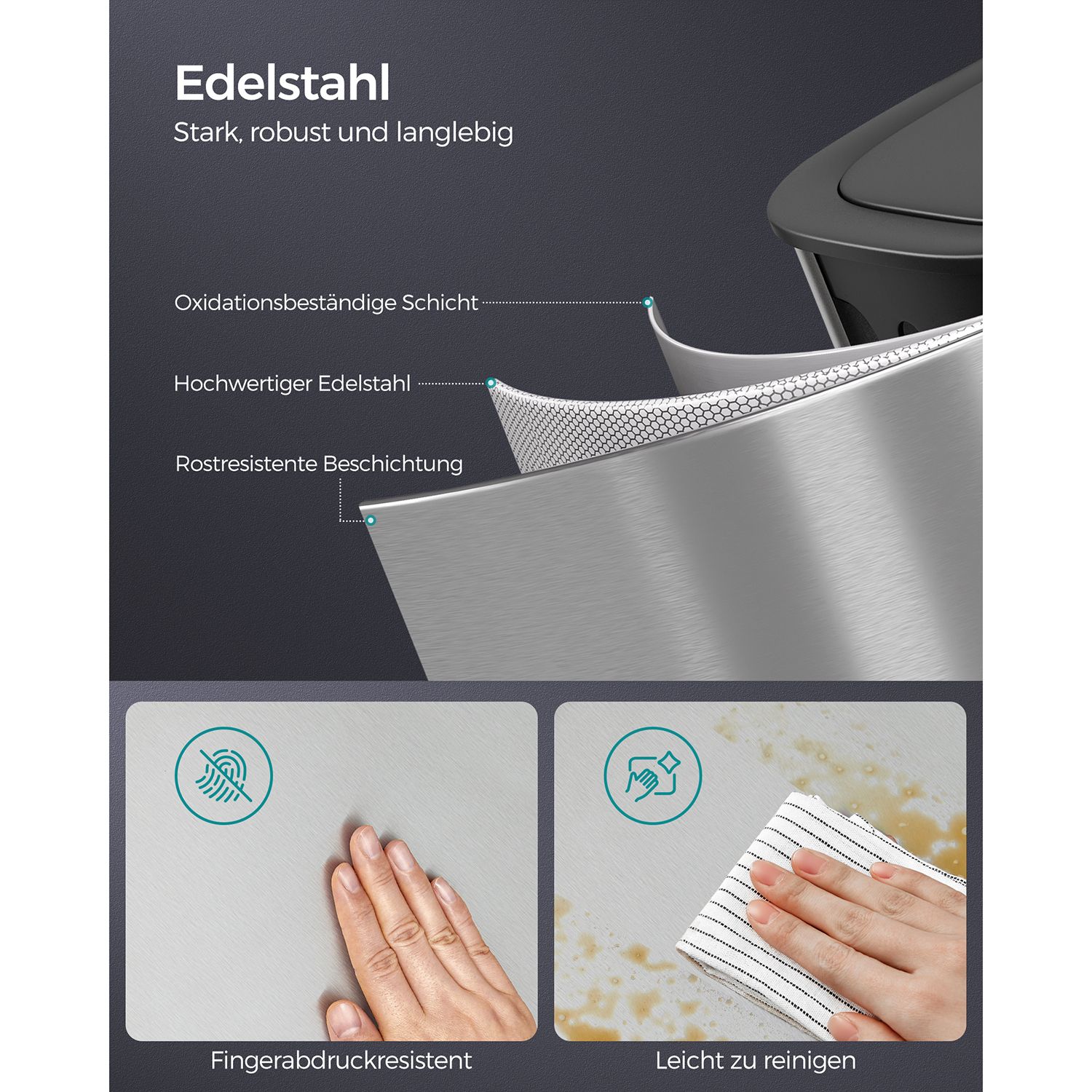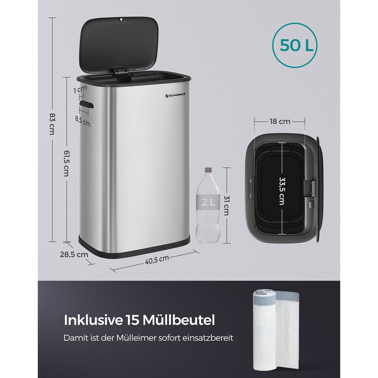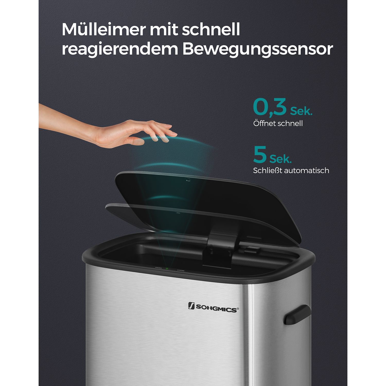 SONGMICS 50-liter kitchen trash can, sensor trash can, automatic, touchless, with soft-close lid, clamping ring for trash bags, made of stainless steel, 15 trash bags included, silver LTB610E50