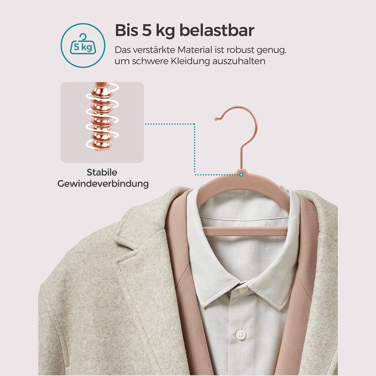 Product details:Color: Light brown Material: Velvet, ABS plastic, metal hooks Size per hanger: 43.5 x 0.6 x 22.5 cm (L x W x H) Weight of 50 hangers: 3.9 kg Max. static load capacity per hanger: 5 kg Scope of delivery: 50 x hangers SONGMICS Notes:Please do not hang wet clothes on the hangers. Do not hang clothes that are too heavy on the hangers. Do not use these hangers in a tumble dryer.