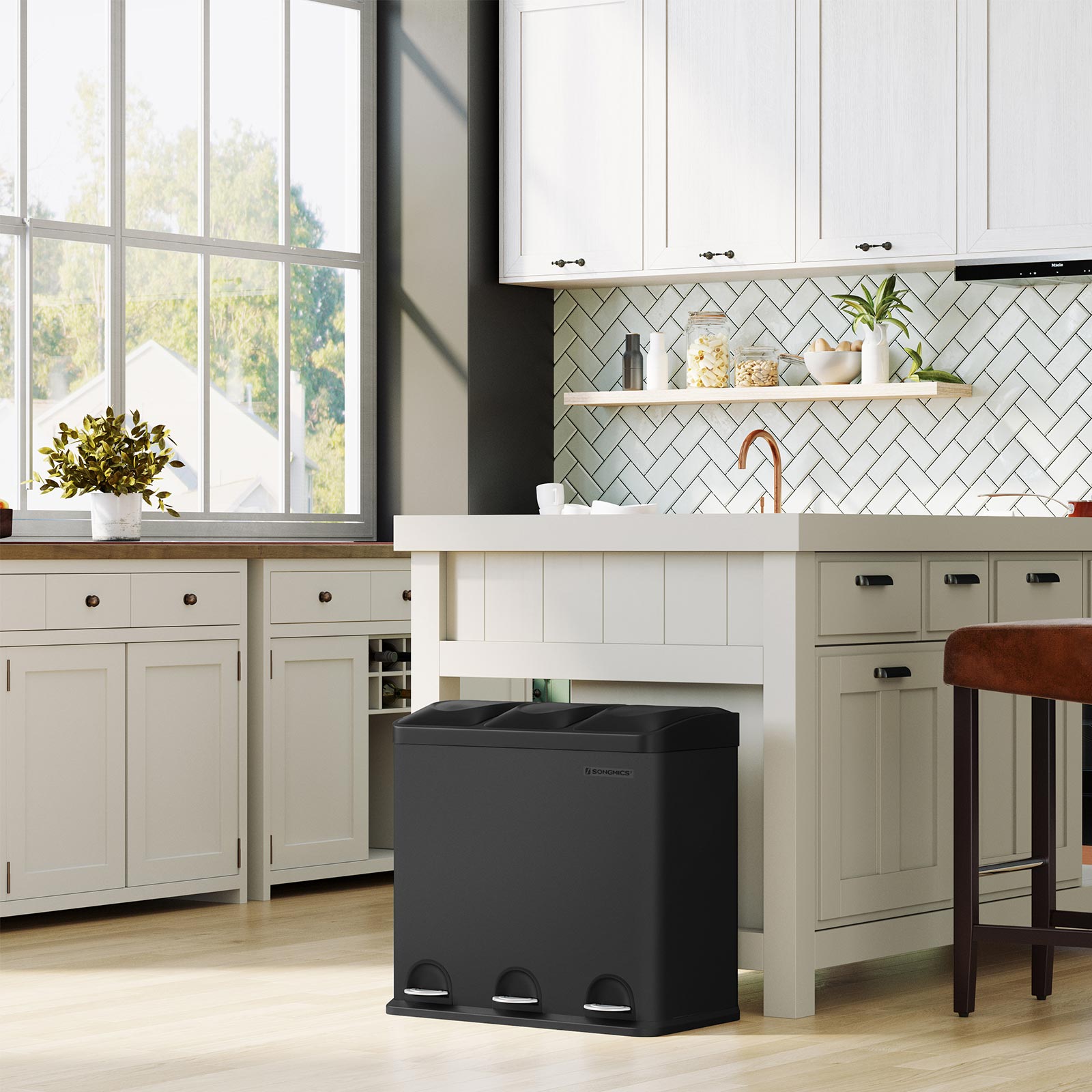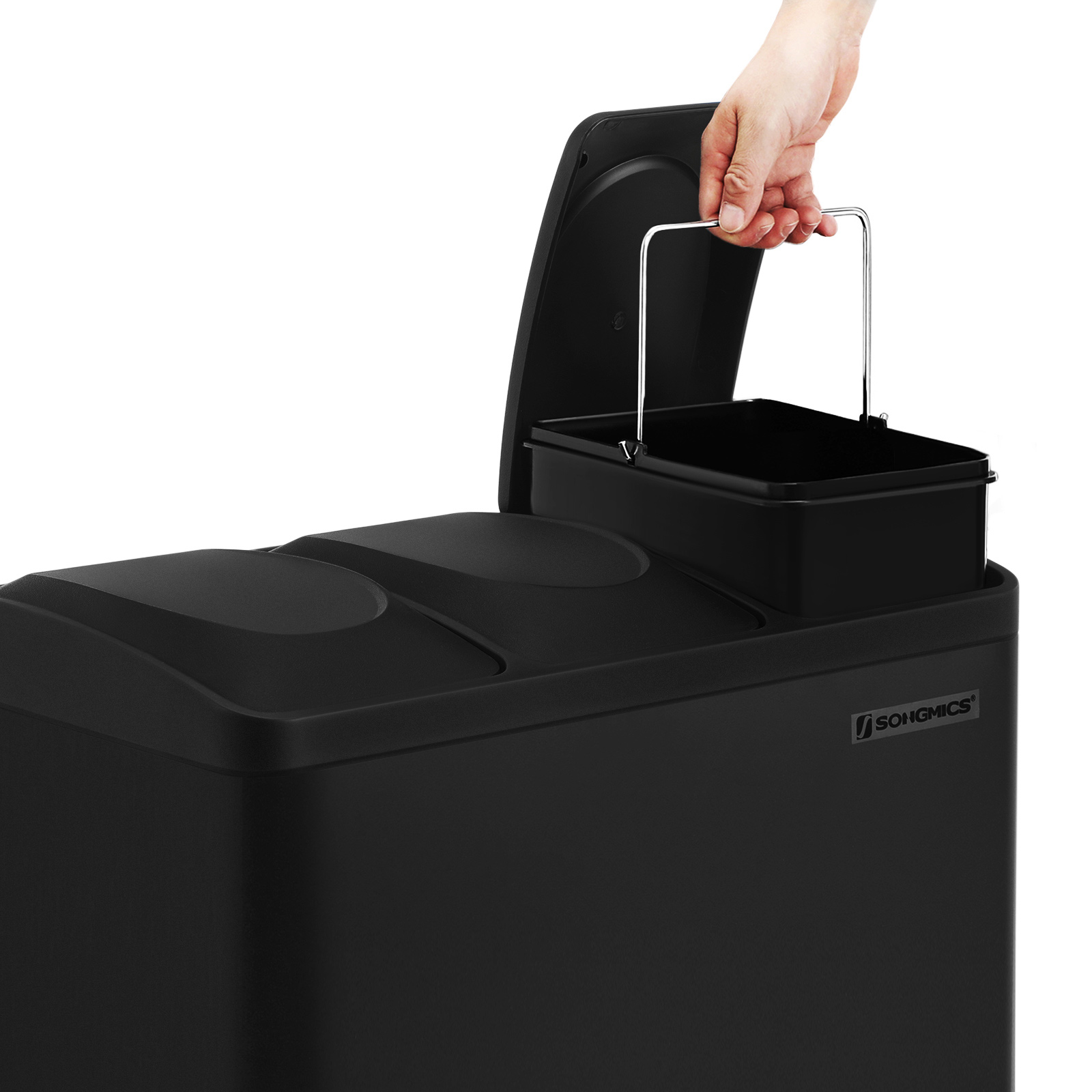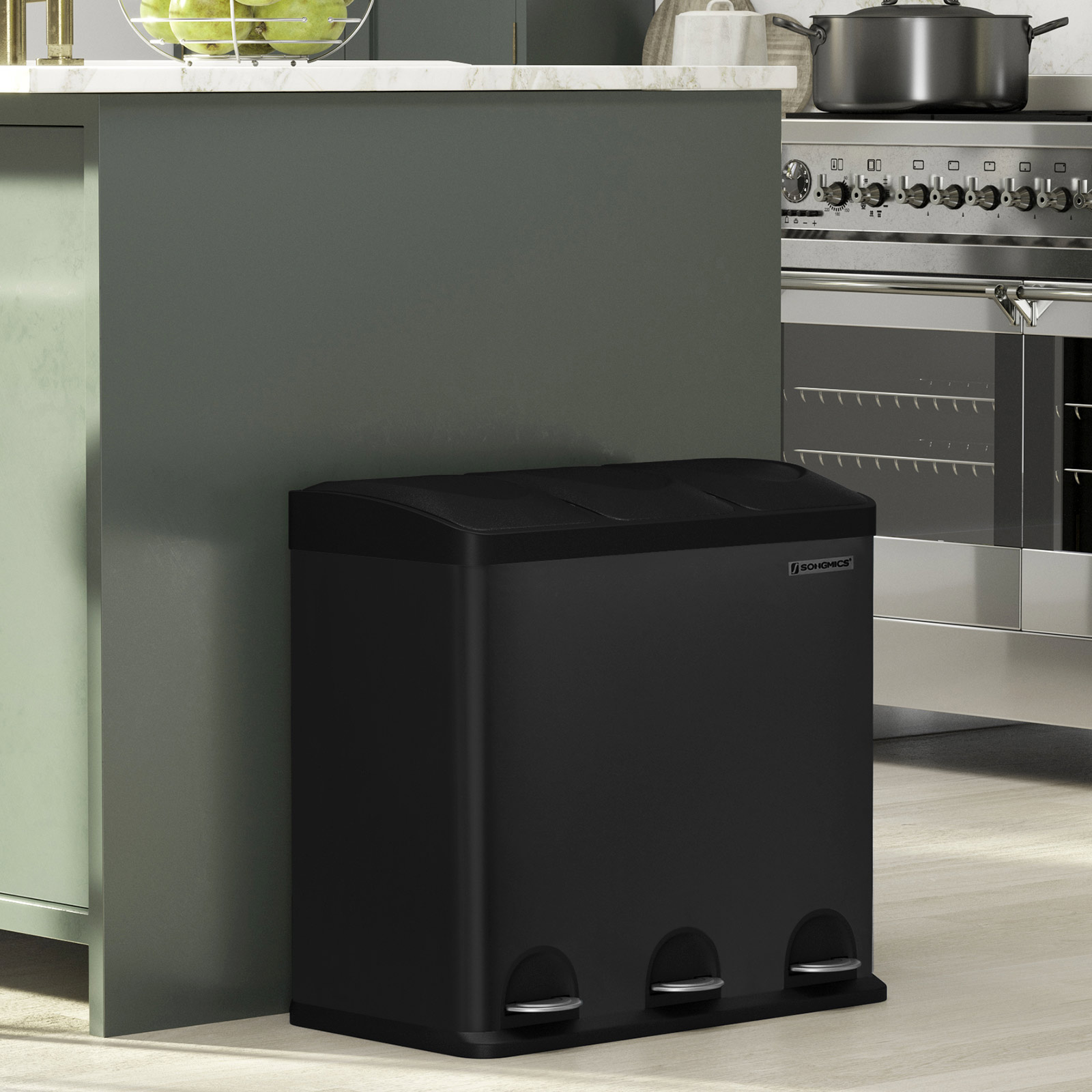 Recycling can be easy: this pedal bin with 3 separate compartments makes it easy to sort your waste, e.g., residual waste and organic waste. All you have to do is press the pedal and throw the waste into the inner bucket. You don’t even have to touch the trash can with your hands, which ensures hygiene.A “puppy- and child-proof” trash can: Does your dog often rummage through the trash can? Do your little ones frequently reach into the open container? If so, you’ll definitely want to put a stop to that. That’s where our pedal bin comes in! The lid only opens when you press the pedal. Product details: Color: Black Material: Steel, ABS plastic Overall size: 60.4 x 30 x 56.3 cm (L x W x H) Size of each inner bin: 18 x 26.4 x 49 cm (L x W x H) Total height (with lid open): 82 cm Weight: 7.5 kg Scope of delivery: 1 x trash can