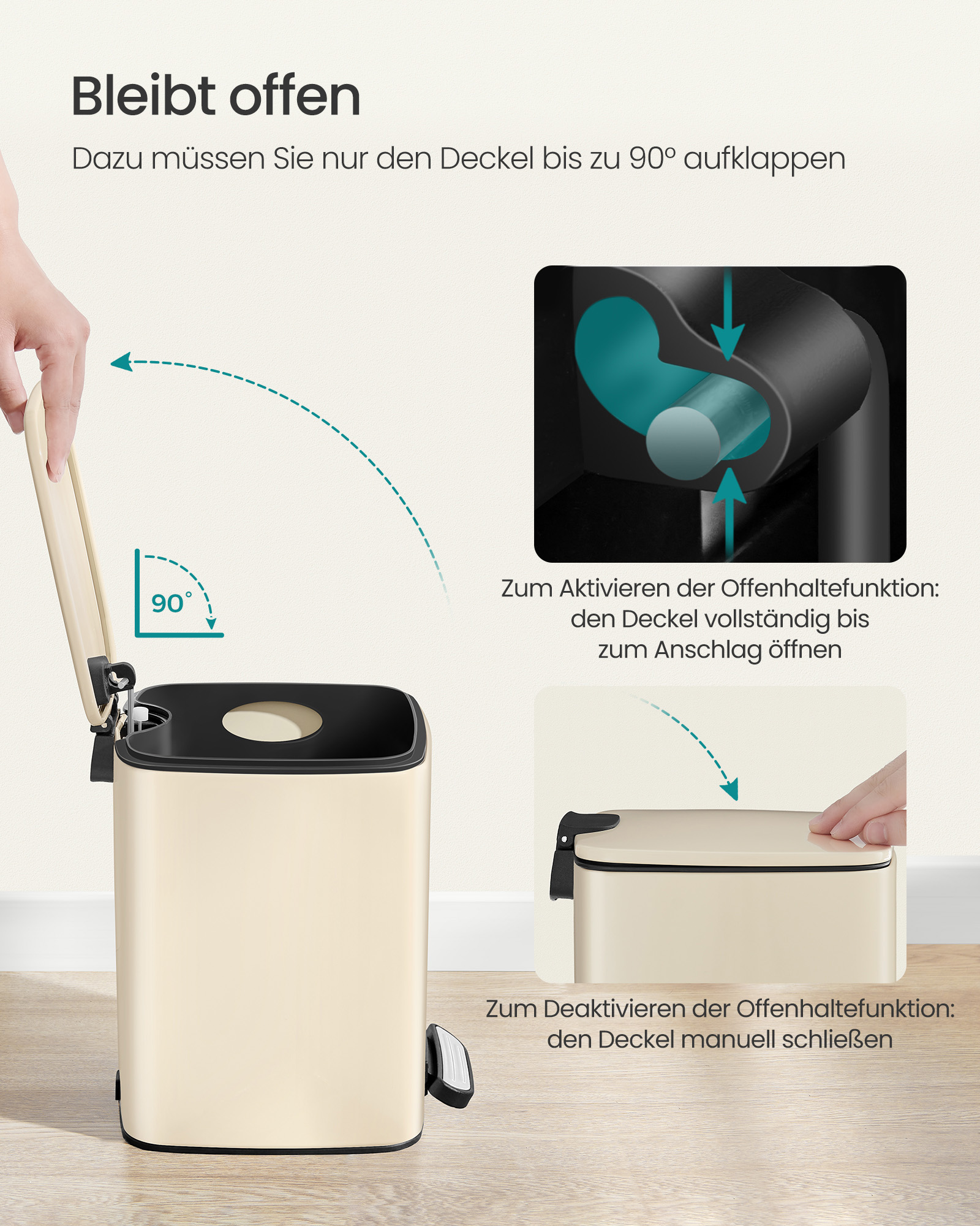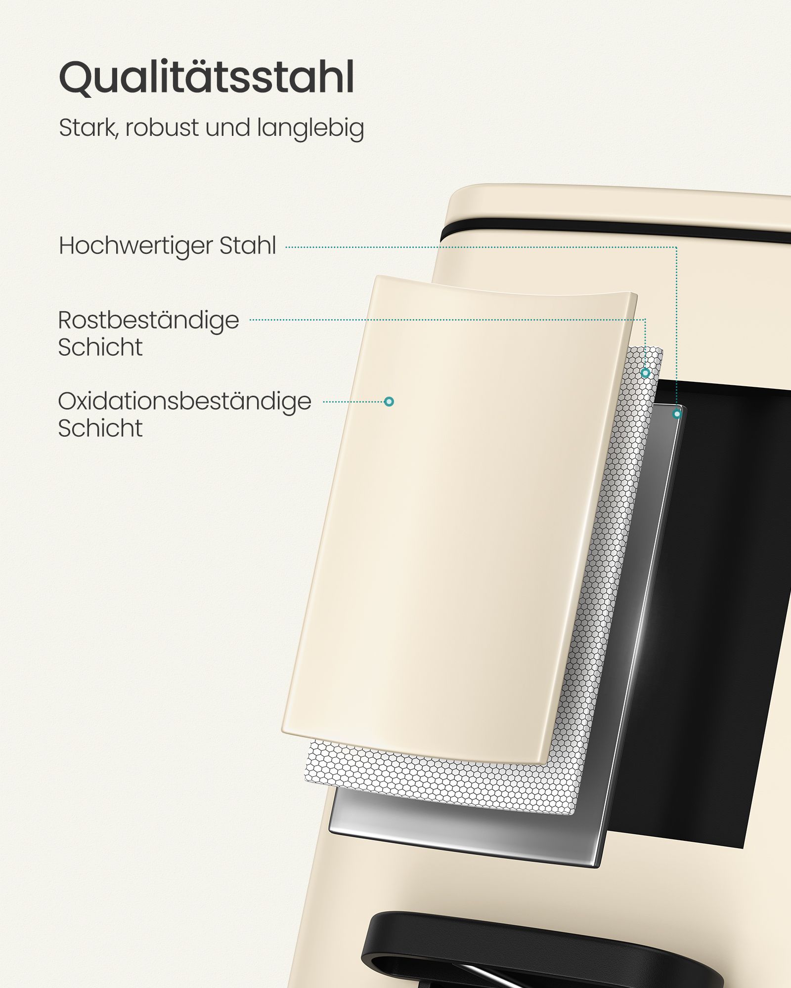 Material: Outer container made of steel, inner bucket made of PP plastic, base made of ABS plastic