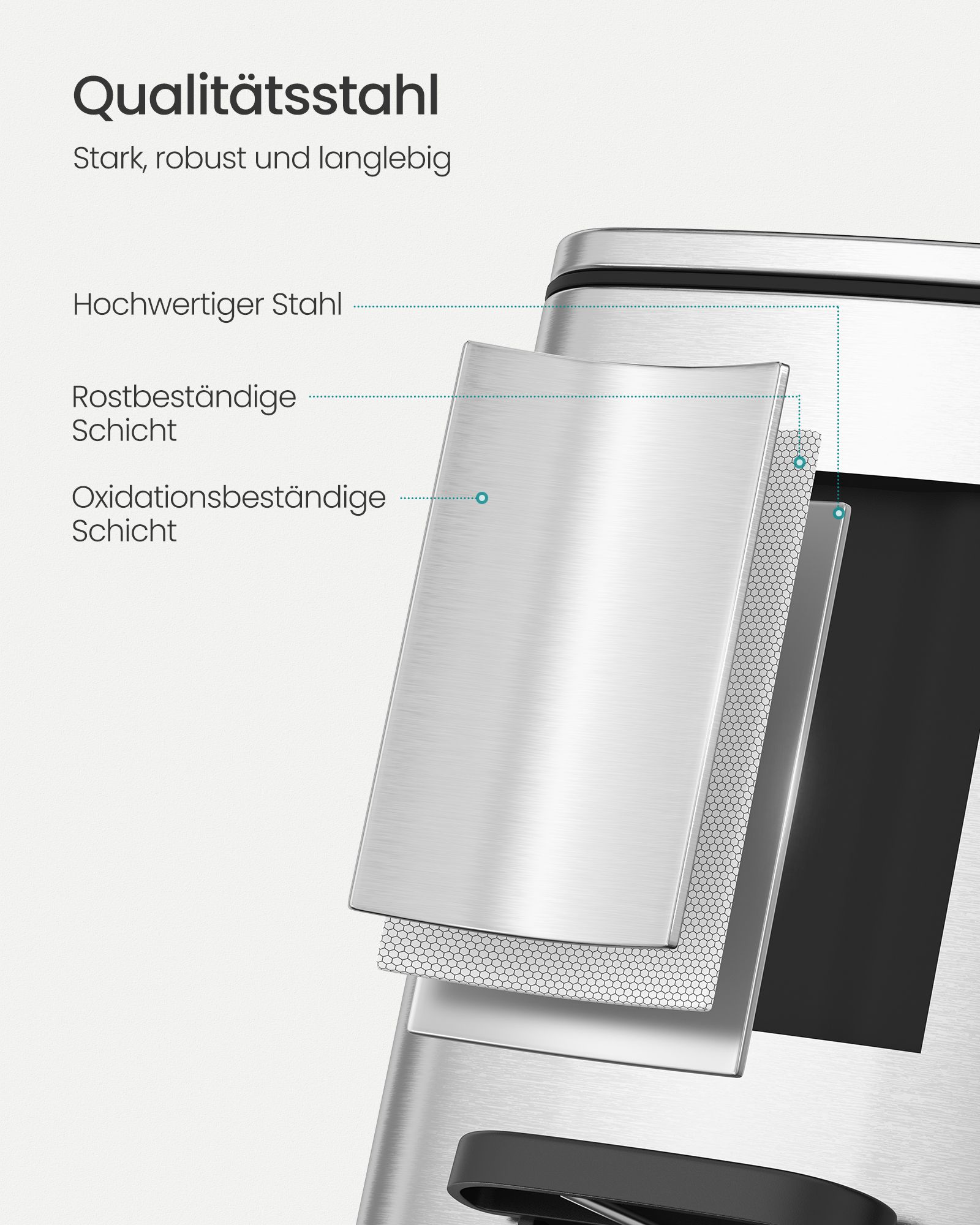 Material: Outer container made of steel, inner bucket made of PP plastic, base made of ABS plastic