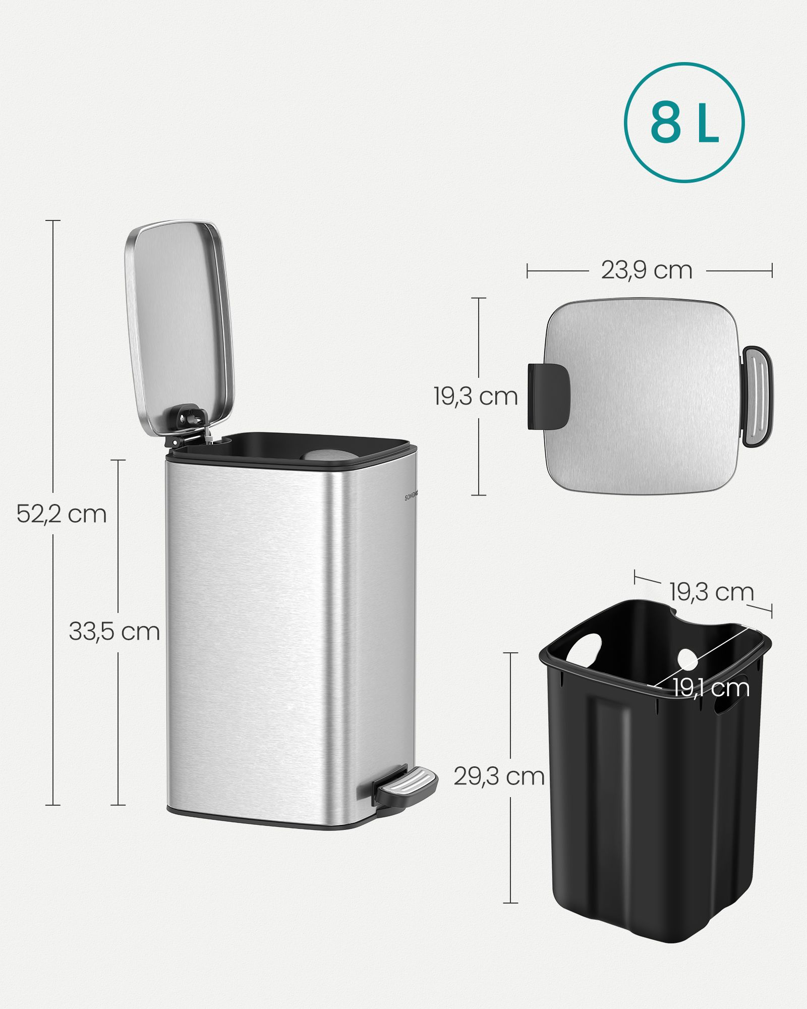 Size of inner bucket: 19.3 x 19.1 x 29.3 cm (L x W x H)