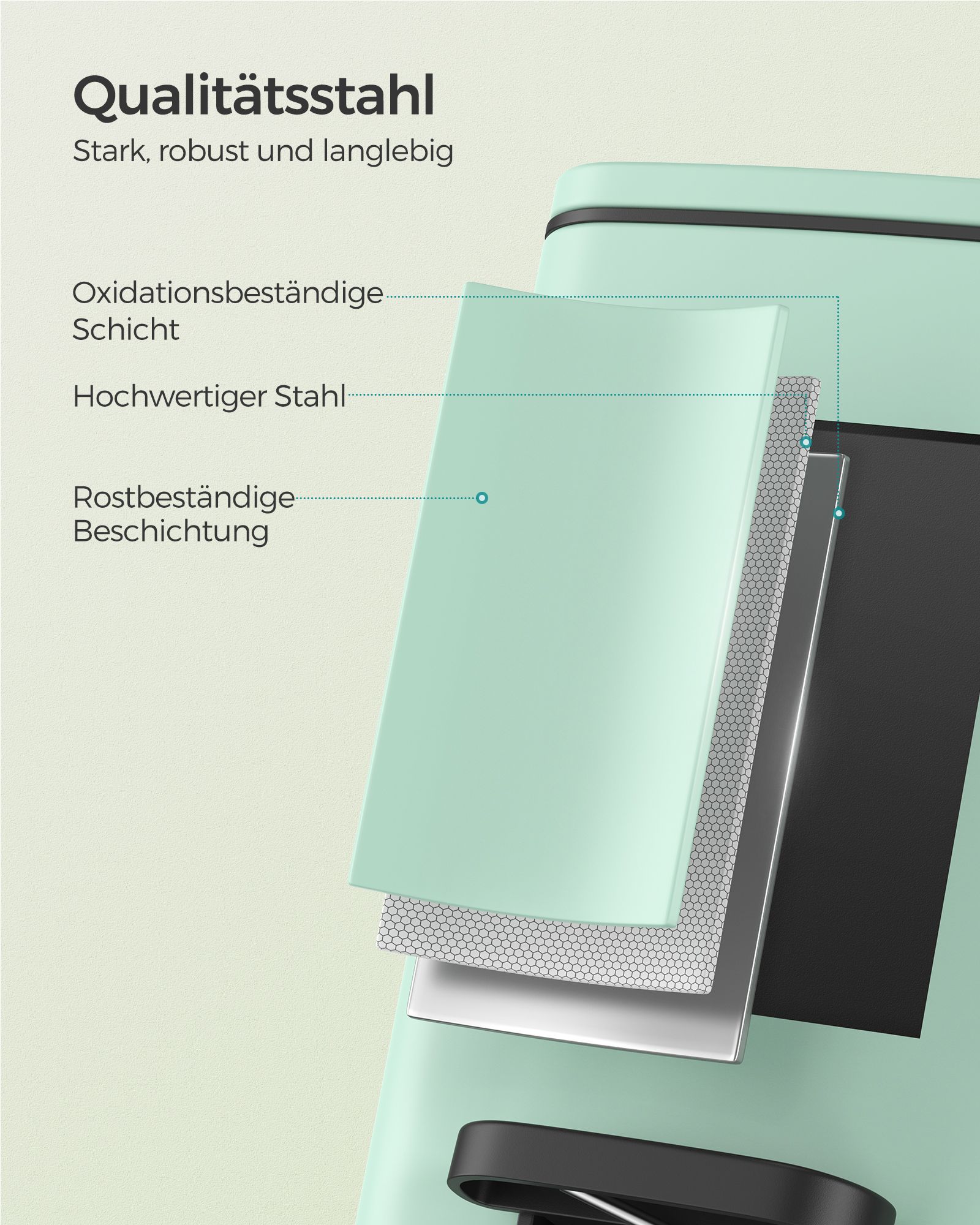 Material: Outer container made of steel, inner bucket made of PP plastic, base made of ABS plastic