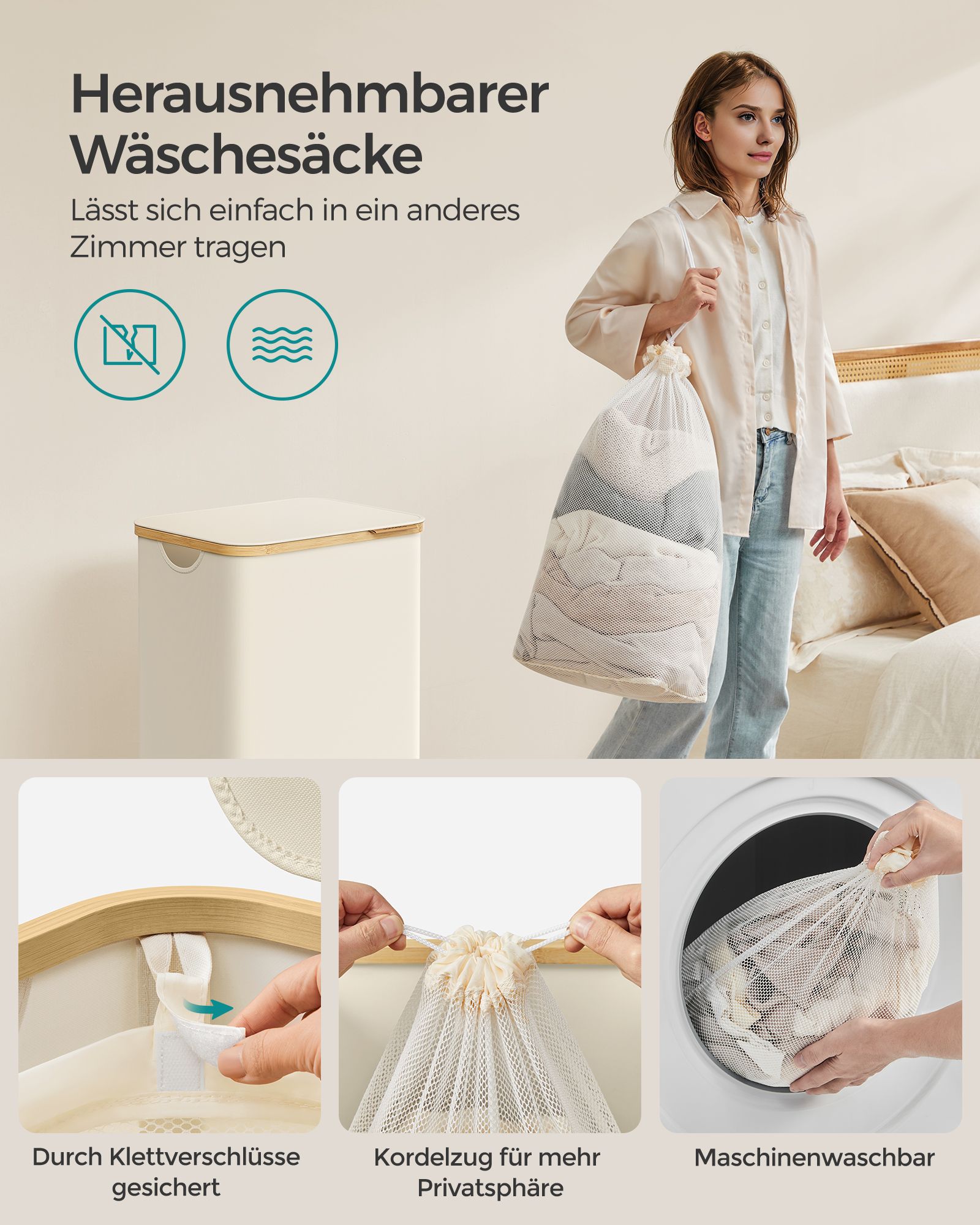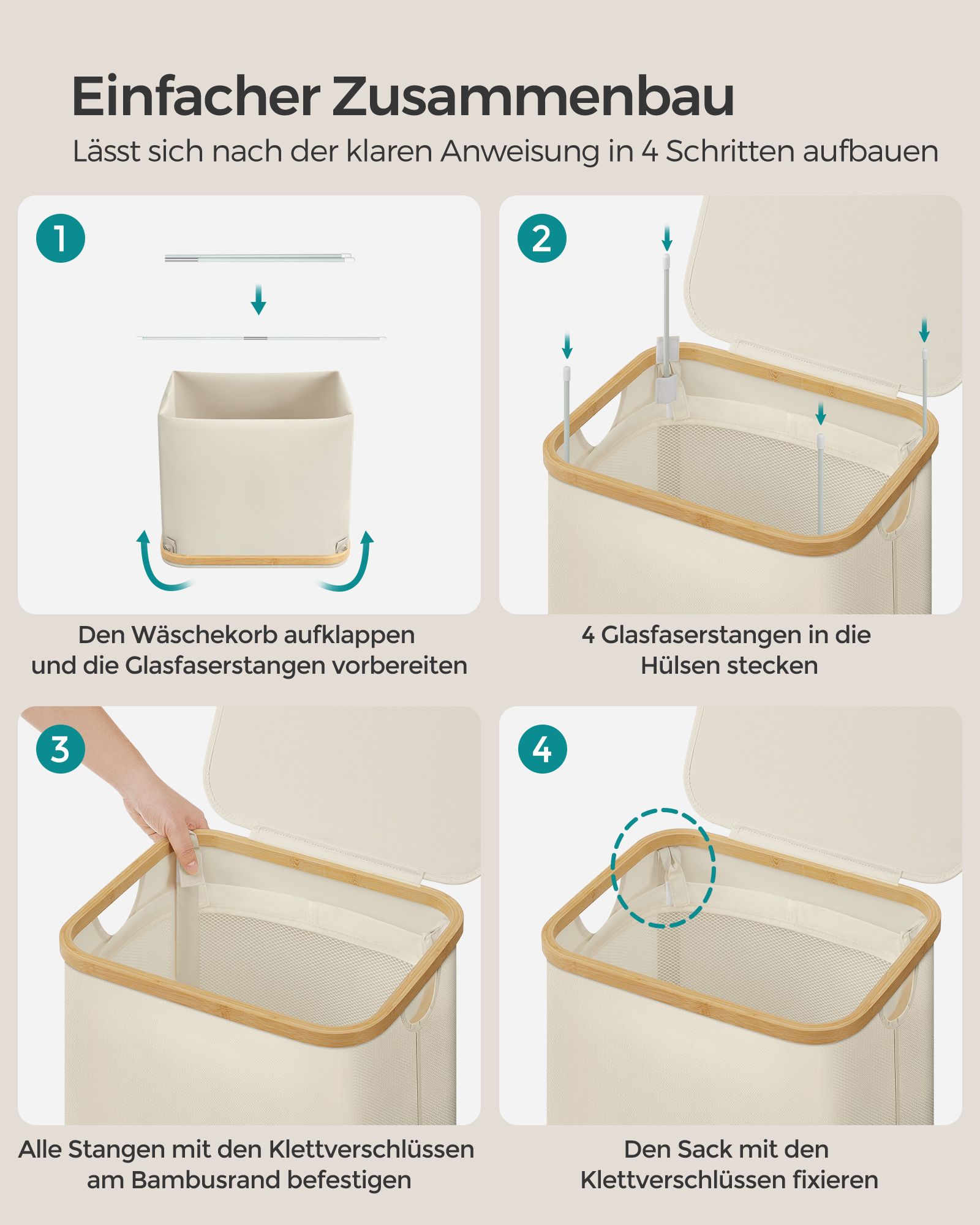 SONGMICS laundry basket, laundry collector with lid, foldable, removable laundry bag, Oxford fabric, bamboo handles, collapsible