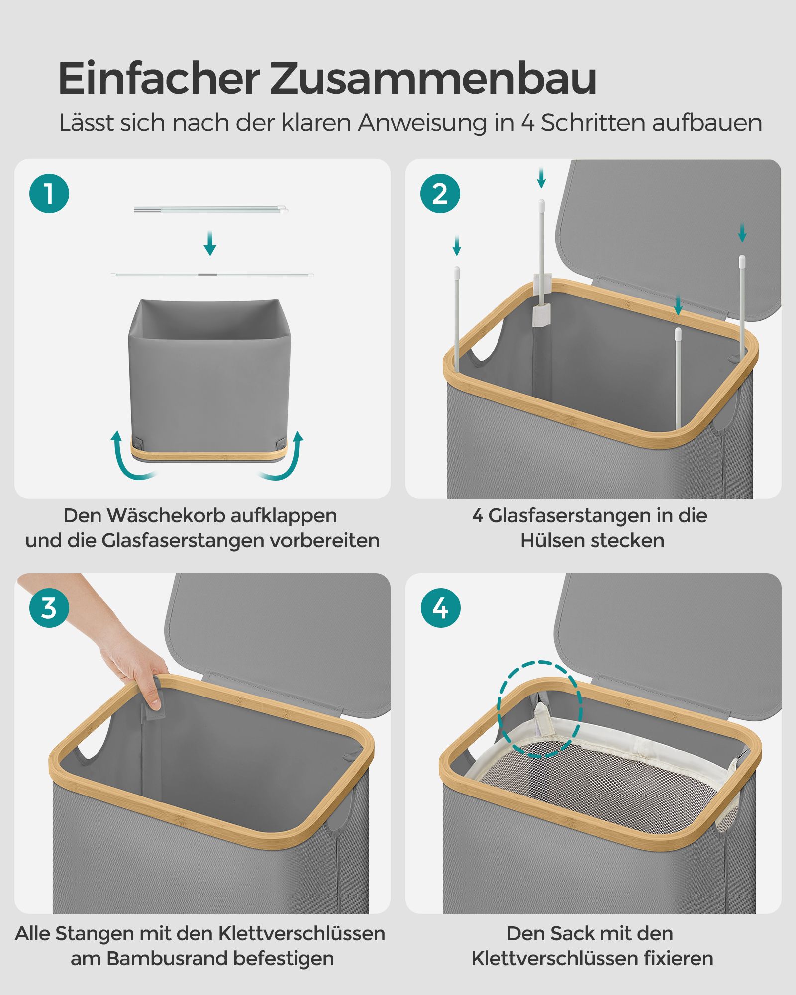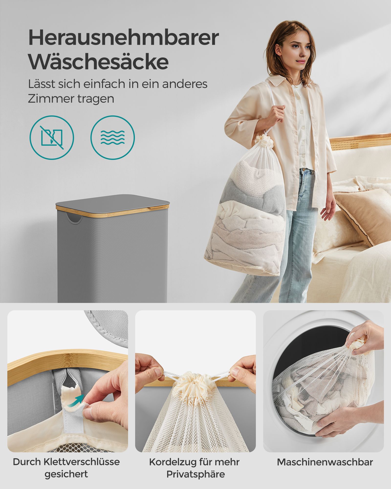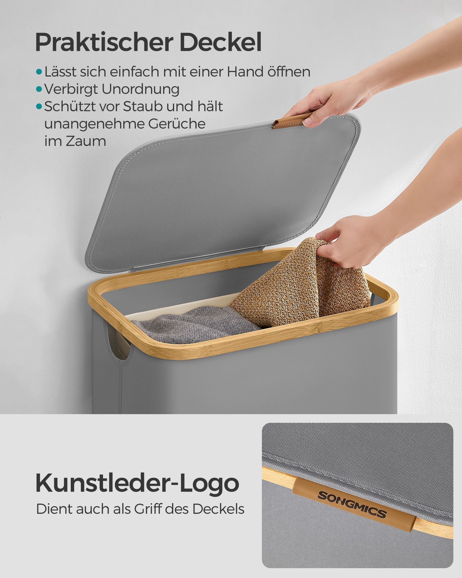 SONGMICS laundry basket, laundry collector with lid, foldable, removable laundry bag, Oxford fabric, bamboo handles, collapsible