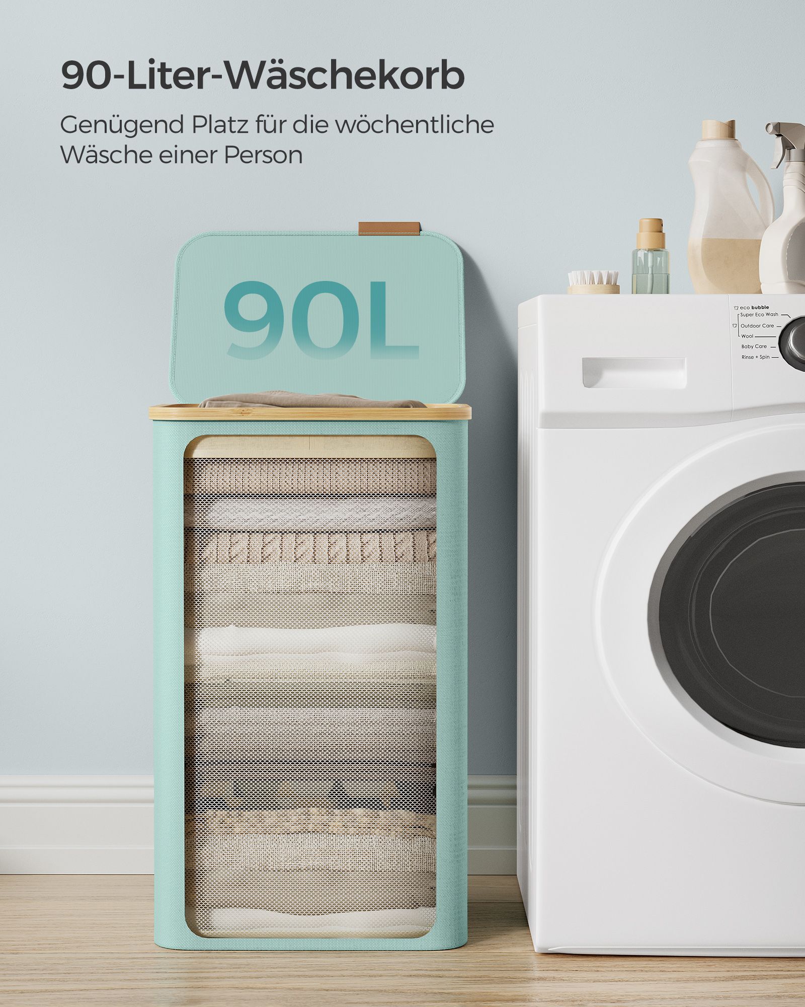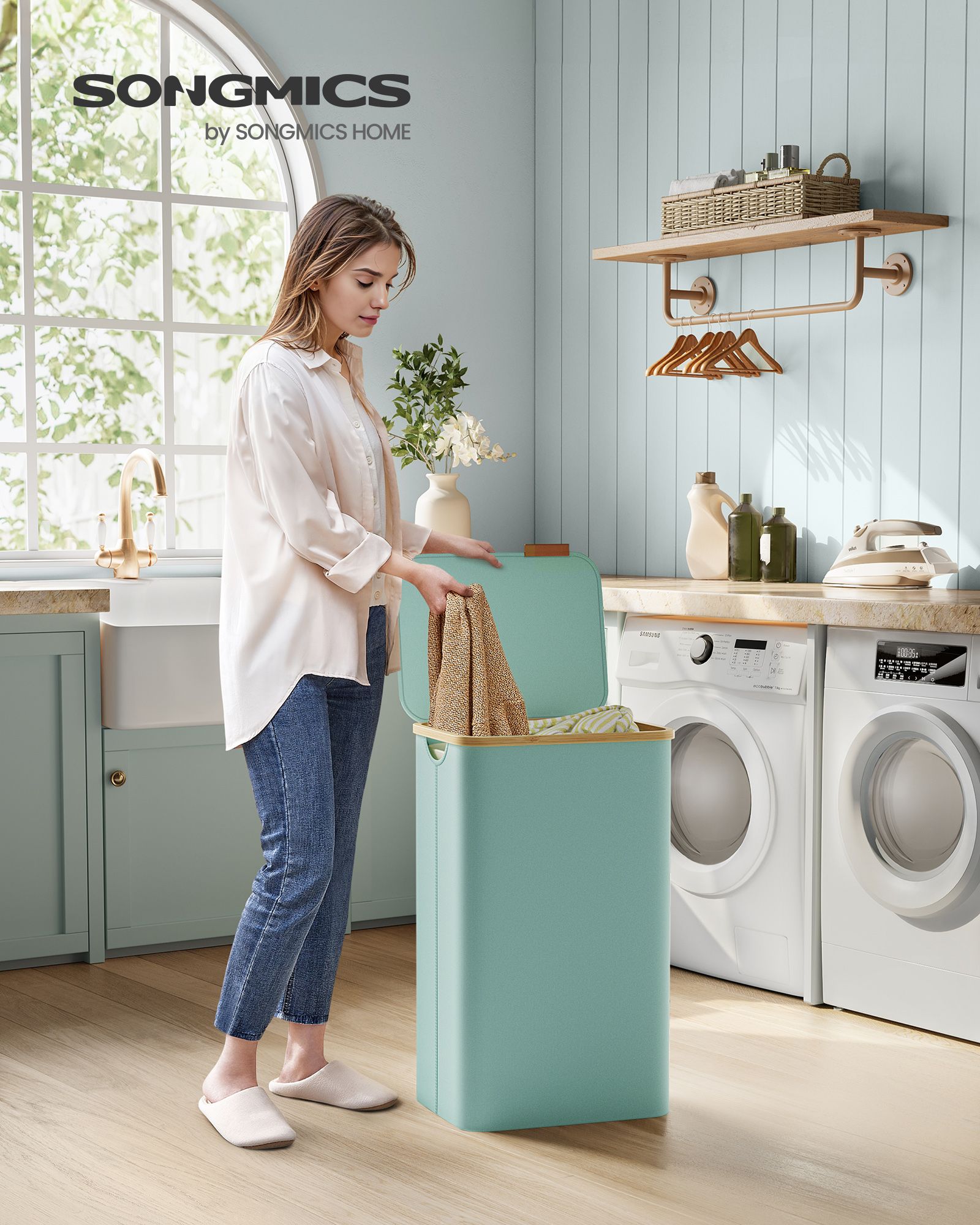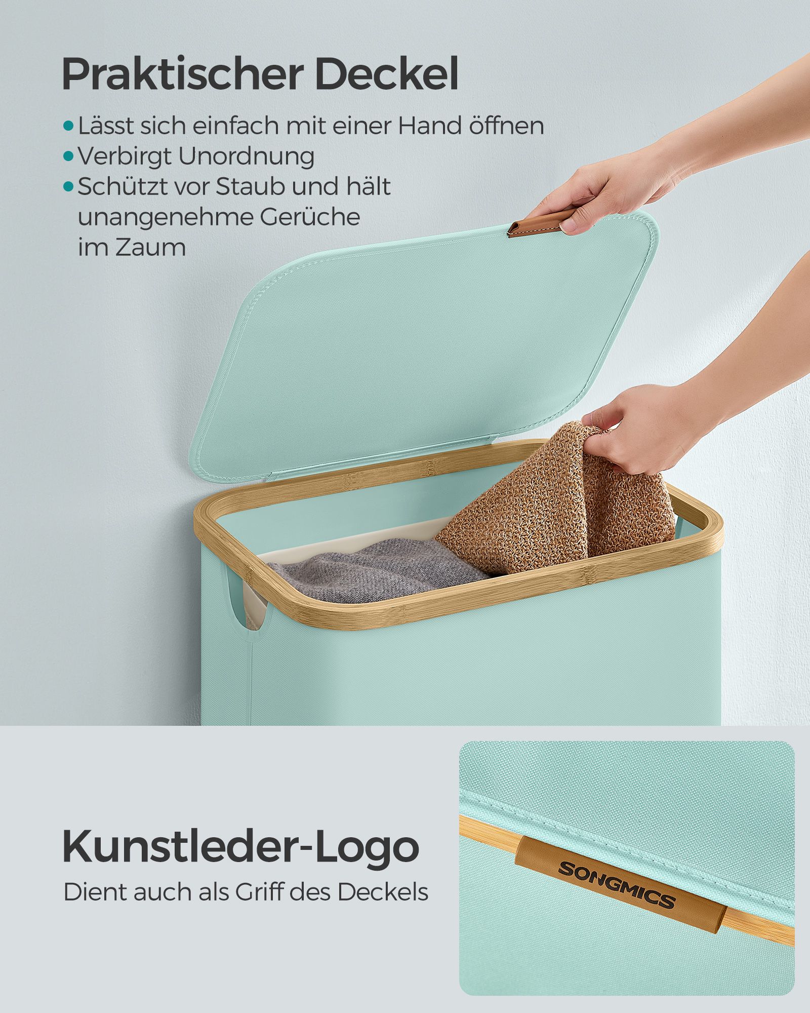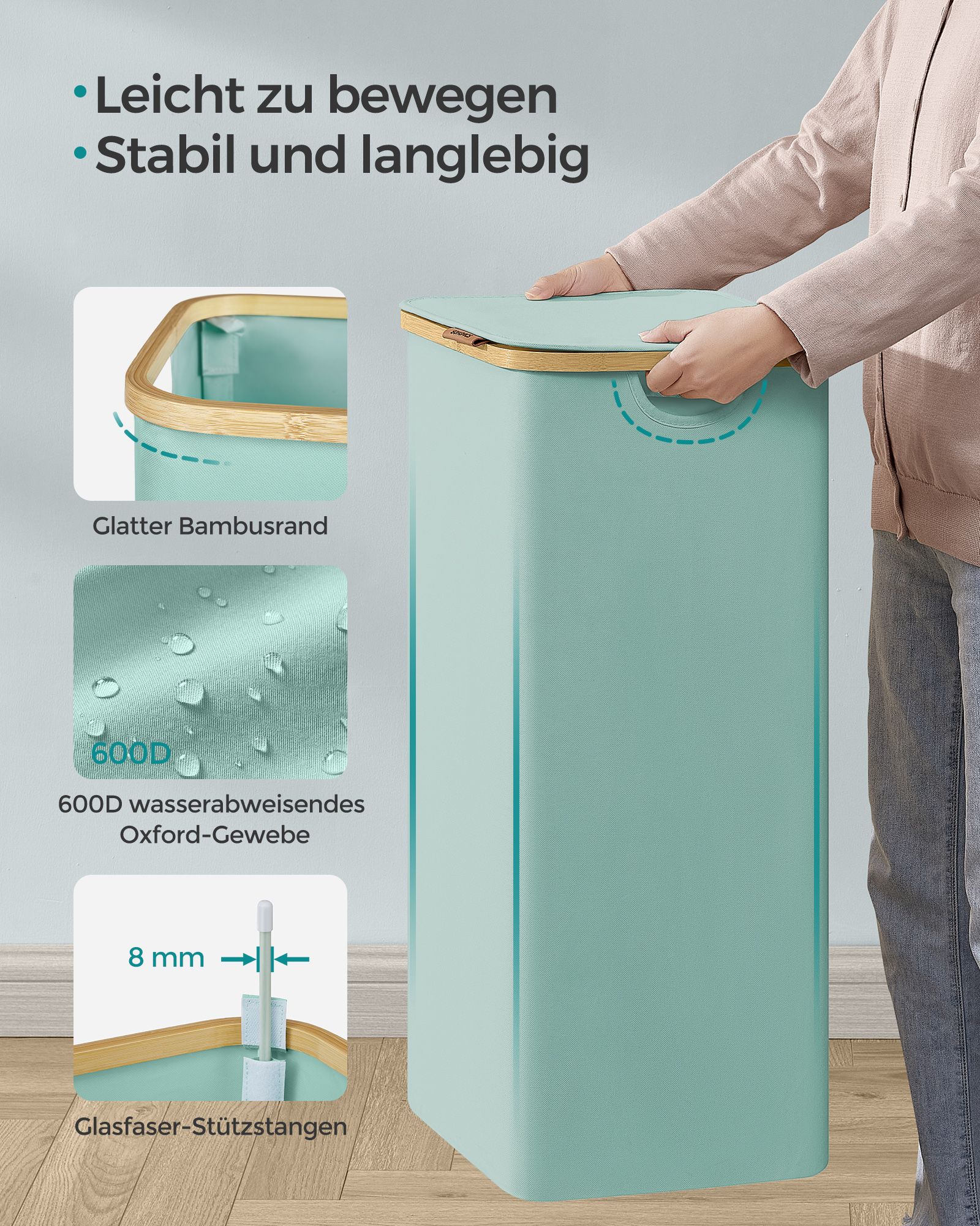 SONGMICS laundry basket, laundry collector with lid, foldable, removable laundry bag, Oxford fabric, bamboo handles, collapsible