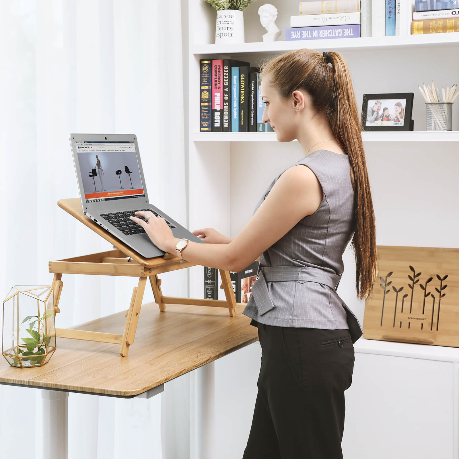 Reading and device use at eye level: Anyone who regularly works on their laptop in bed or on the sofa is familiar with the problem of the laptop becoming very warm on their thighs after a while. This is where the laptop table from SONGMICS comes in. It is ideal for watching movies, eating, reading, writing… or even for a romantic breakfast in bed. You will be delighted to have it.Gift suggestions: Perfect for students Great gift for anyone who likes to read in bed Very useful and practical for those who want to improve their posture For those who simply love having breakfast served in bed For a more efficient working environment Foldable legs allow for easy movement and storage, whether for work or household use, outdoors or indoors.Not feeling well or just lazy in bed… no problem! Made for everyone: Adjustable tabletop, no more back pain! Extra stable even on soft surfaces. The legs are height adjustable (21-29 cm), giving you more freedom to spread your legs.Rounded corners and edges. No further assembly required. Ideal for small spaces. Product details: Material: 100% bamboo Product size: 55 x (21-29) x 35 cm (W x H x D) Table height adjustable: approx. 21 – 29 cm Distance between table legs at minimum height: approx. 65 cm Distance between table legs at maximum height: approx. 75 cm Width of tiltable work surface: 36.5 cm Internal dimensions of drawer: 11 x 13.5 x 2 cm Ideal laptop size: 15.6″ Dimensions of stopper: 15 x 2 x 0.7 cmDimensions of the right panel: 35 x 18.5 cmNet weight: 2.5 kgLoad capacity: 7.5 kgSONGMICS Notes:The safety stopper is stored in the side drawer upon arrival.