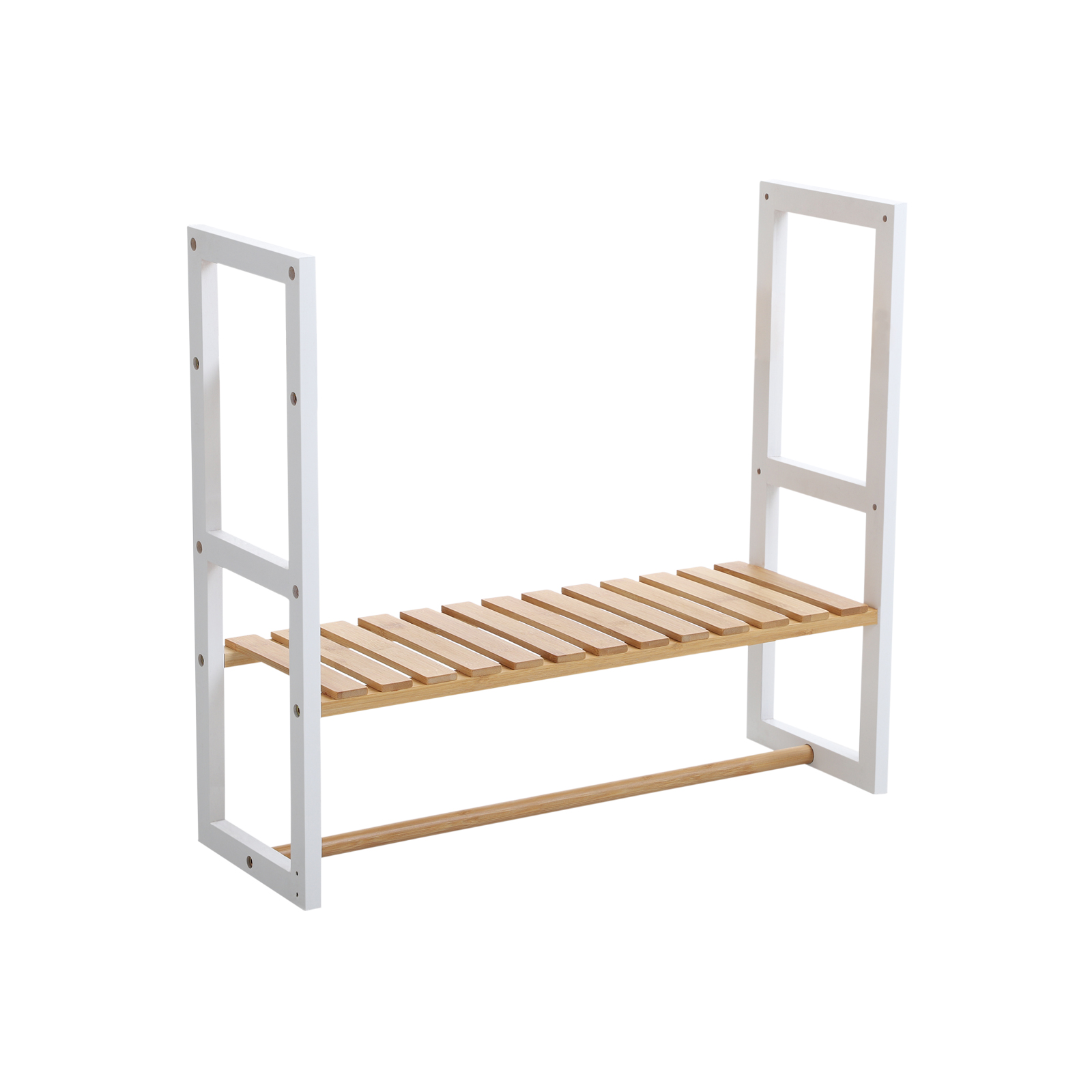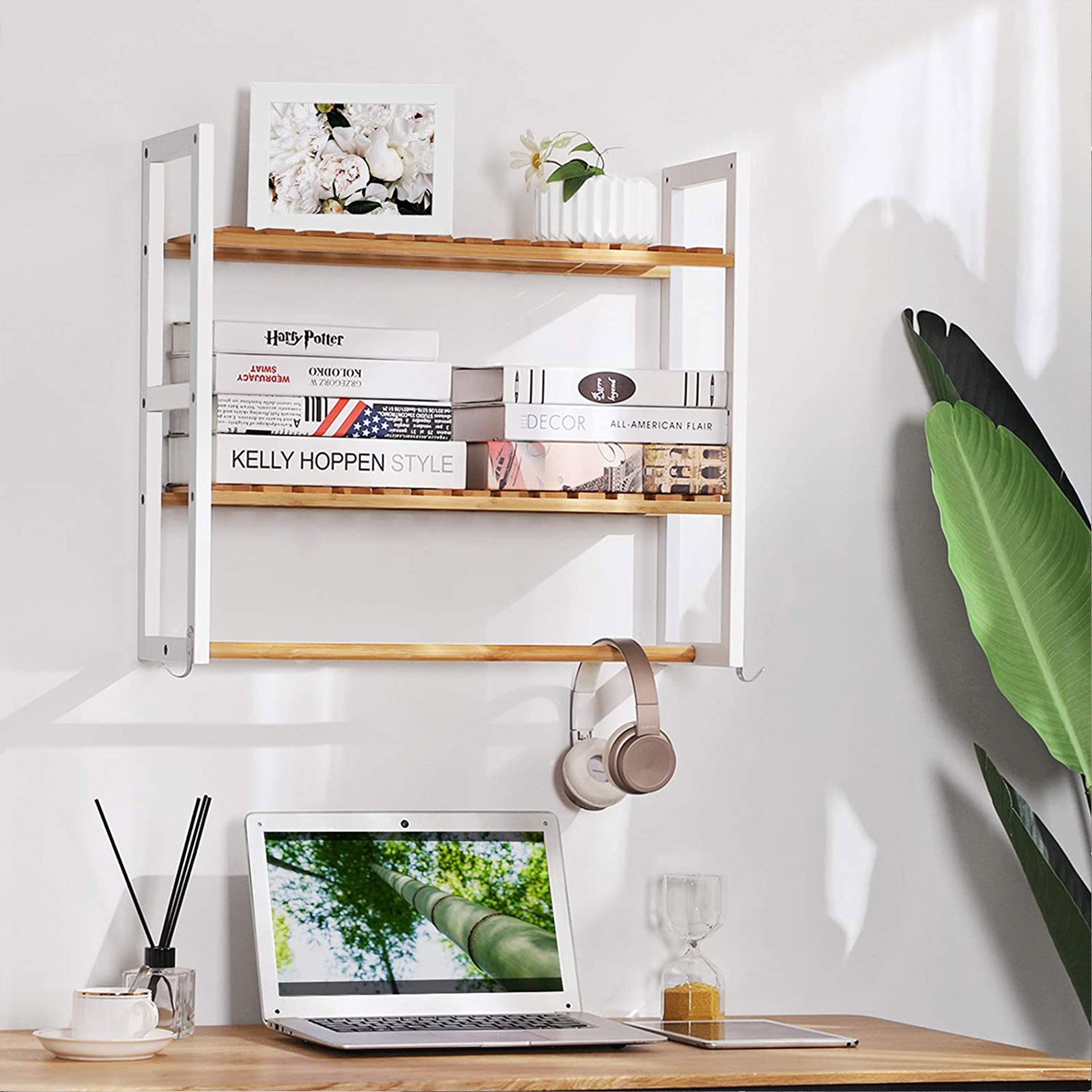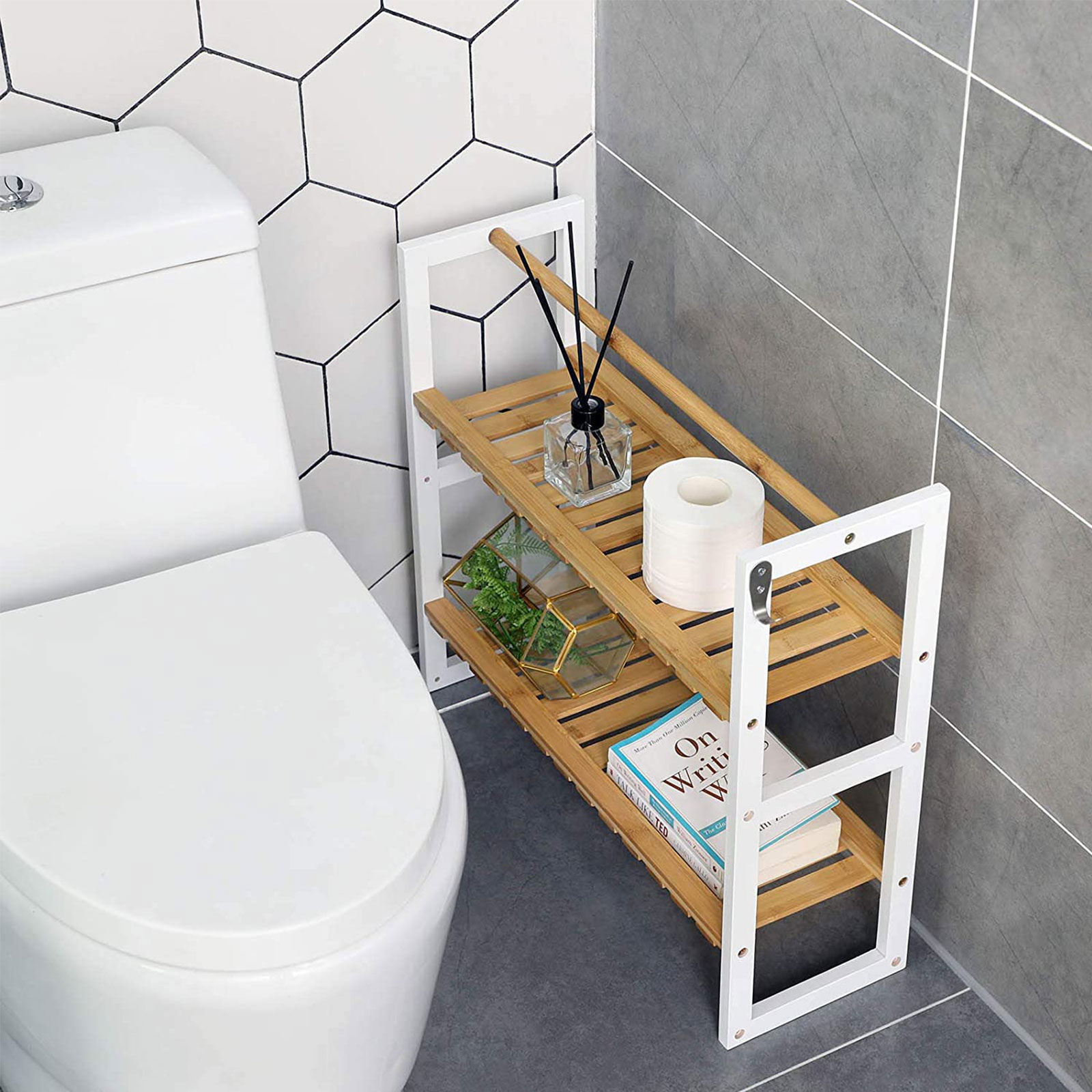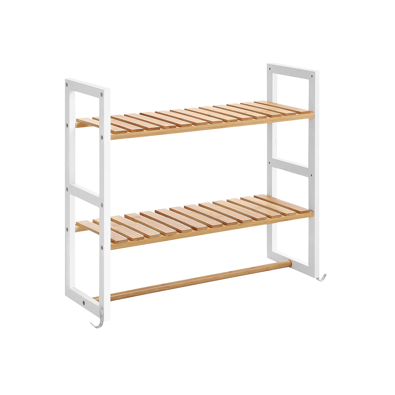 Mount it on the wall in your bathroom: this narrow and space-saving shelf transforms the empty wall in your bathroom into a storage wonder: everyday items such as facial cleansers, toothbrushes, razors, shampoos, shower gel bottles, bath bombs, and essential oils can be neatly stored here. The bar at the bottom can also be used to hang up your towels, ensuring that they dry quickly. You can also hang your bath sponges on the additional hooks. Use it in your living room: Perhaps your living room is currently lacking a sturdy storage solution – why not try this bamboo shelf from SONGMICS? It will bring a touch of nature into your home. What’s more, this organizer will fit in perfectly with the other furniture in your home. Product details:Color: White, natural Material: Bamboo, metal Dimensions: 60.5 x 54 x 20 cm (L x W x H) Weight: 1.95 kg Max. load capacity: 25 kg Scope of delivery: 1 x bamboo shelf 2 x hooks 1 x accessory bag 1 x instructions (DE, EN, FR, ES, IT) SONGMICS notes:This shelf can hold up to 25 kg. Please do not place any heavier items on the product to avoid damage. Please do not clean the shelf directly with water, but wipe it with a damp cloth. This will prevent mold.