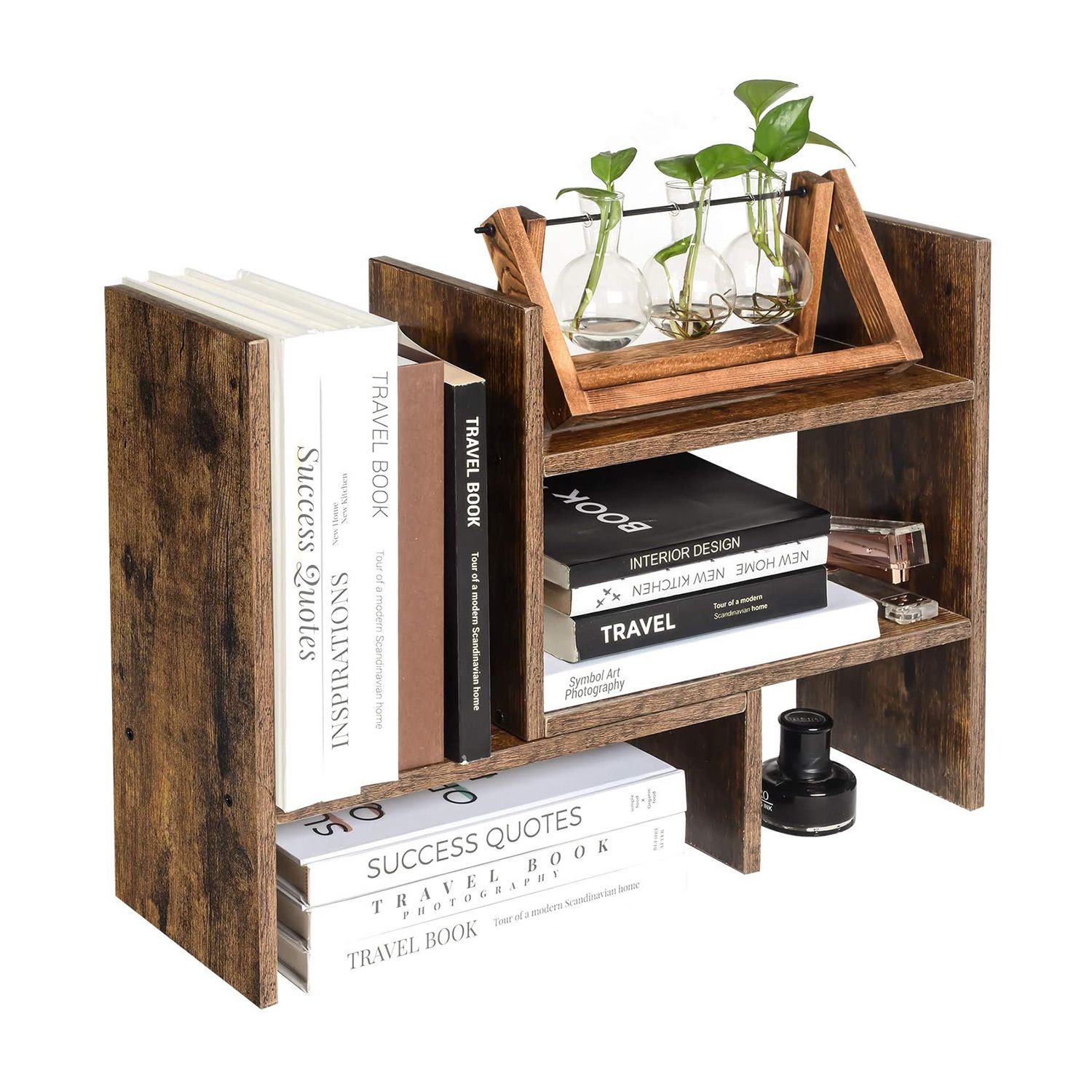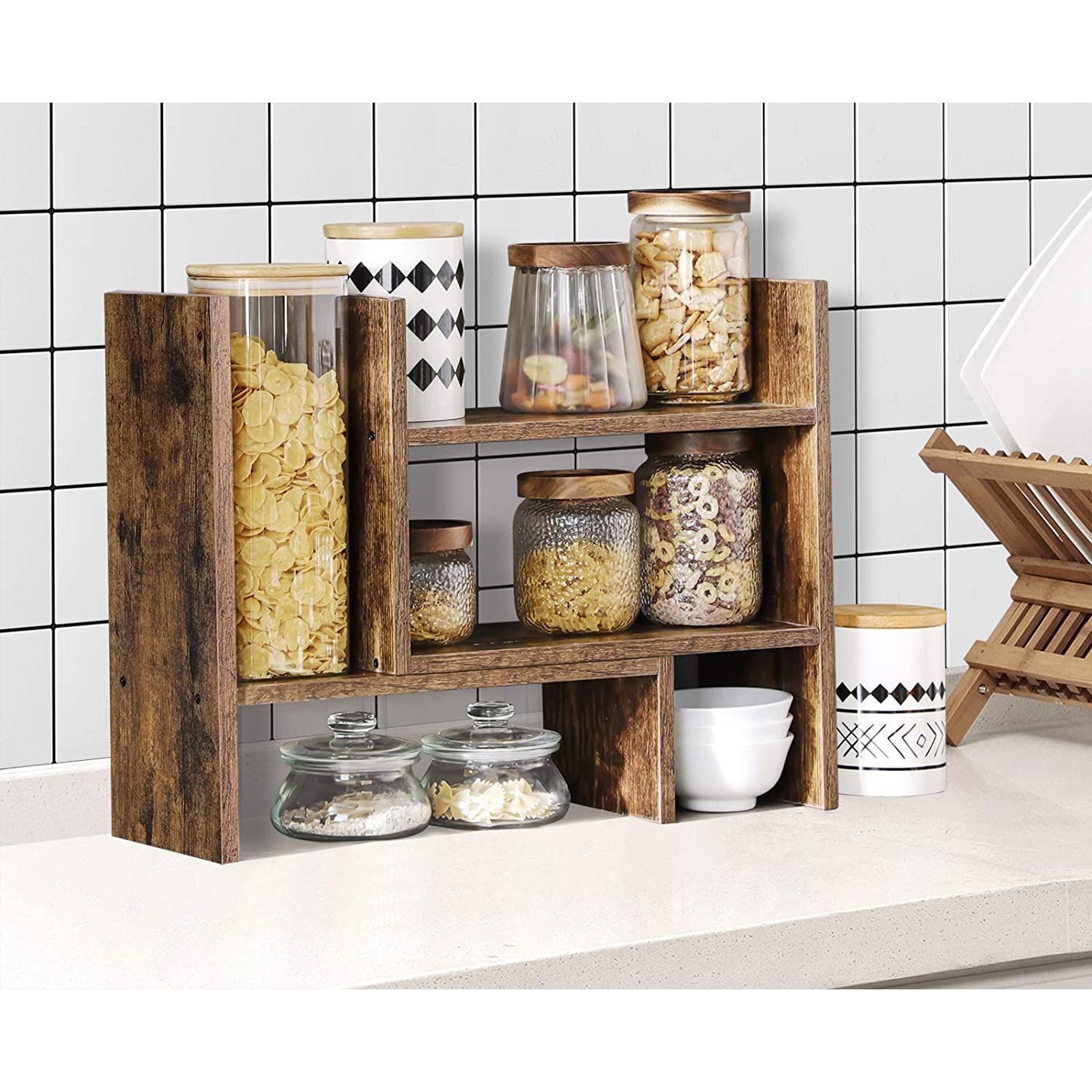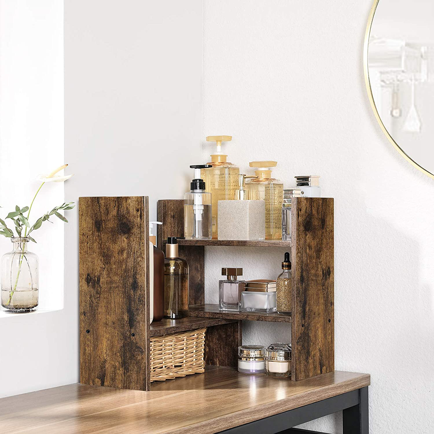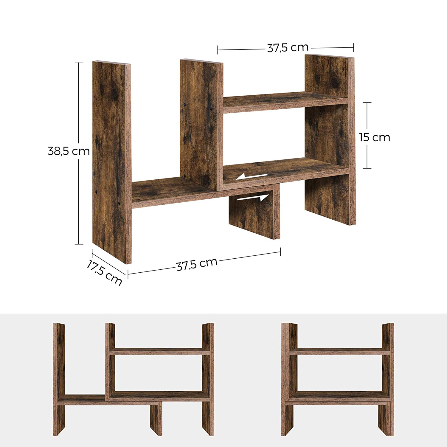 Compact, space-saving, and very practical! This table organizer from SONGMICS helps you keep things tidy and takes up little space. The two small shelves of this organizer can be combined in various ways. Where would you like to place this table organizer? In the living room, study, or office? This flexible table shelf is a perfect addition to your desk for neatly storing books, office supplies, small vases with plants, picture frames, etc.In the kitchen Use this shelf in your kitchen to create space for spice jars, coffee cups, dishwashing liquid, sponges, or dish towels. Now it’s up to you: what do you want to do with this table shelf? Product details:- Color: Vintage brown – Material: MDF (medium-density fiberboard) – Size: 37.5 x 17.5 x 38.5 cm (L x W x H) – Weight: 3.5 kg Scope of delivery: – 1 x table organizer – 1 x accessory package – 1 x instructions (DE, EN, FR, ES, IT)