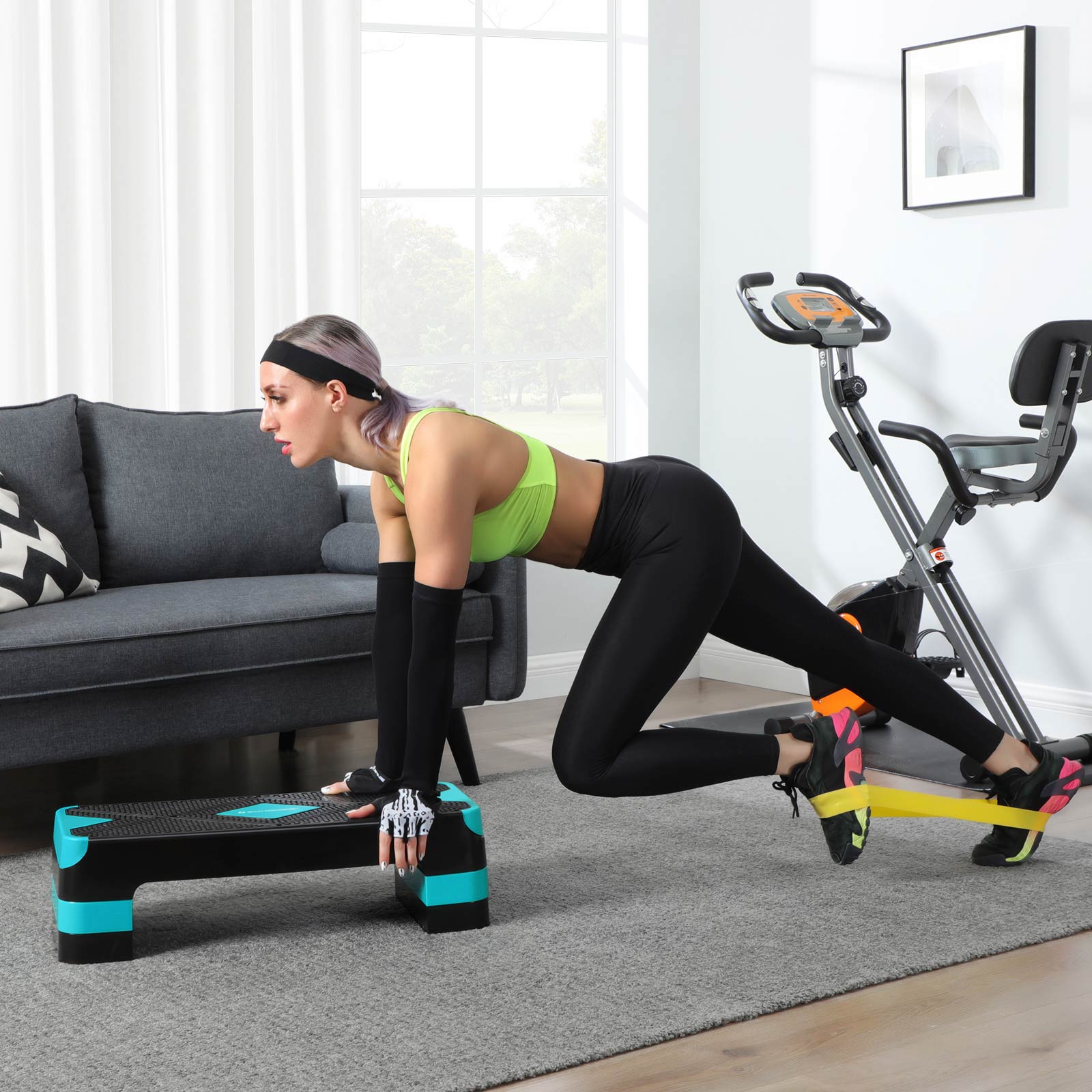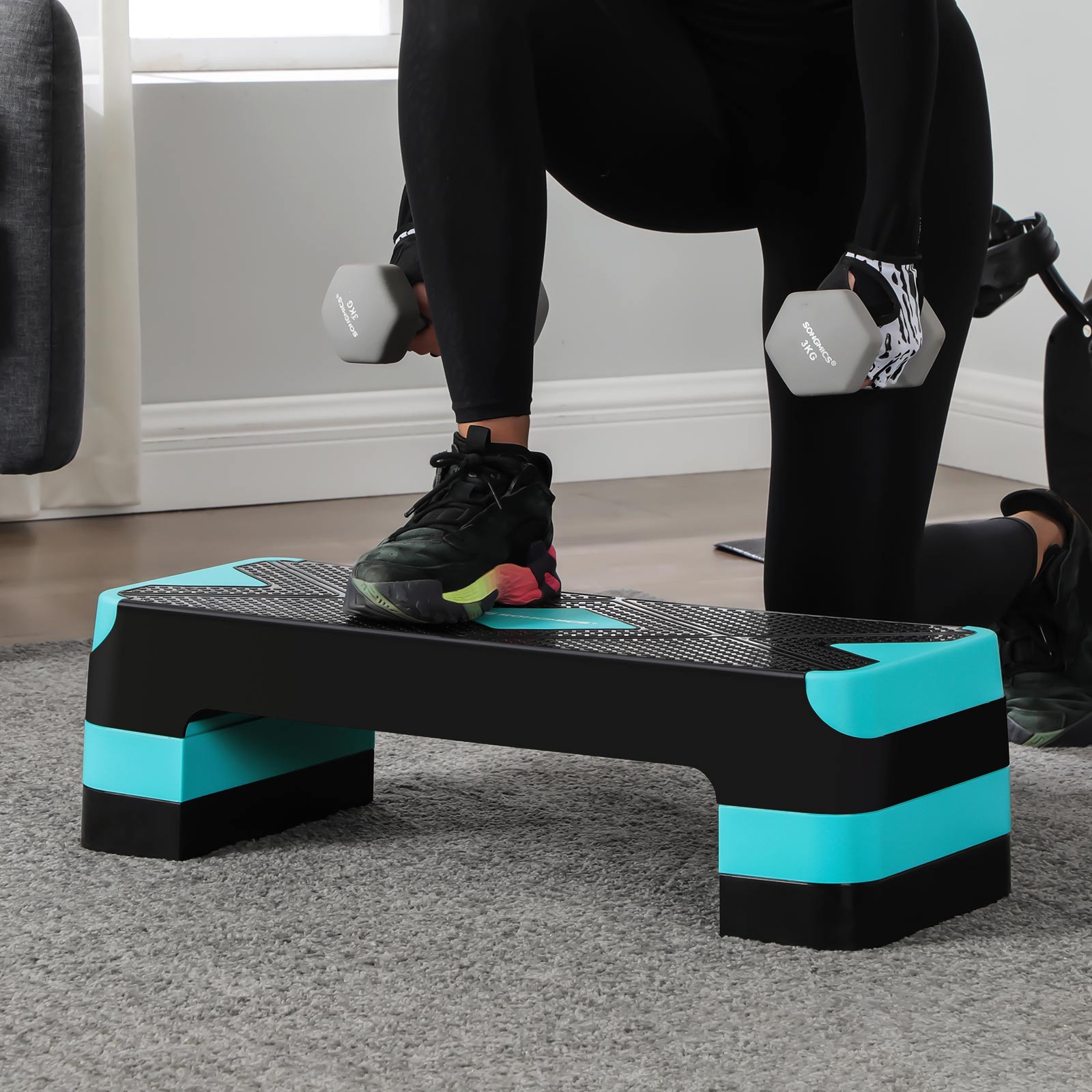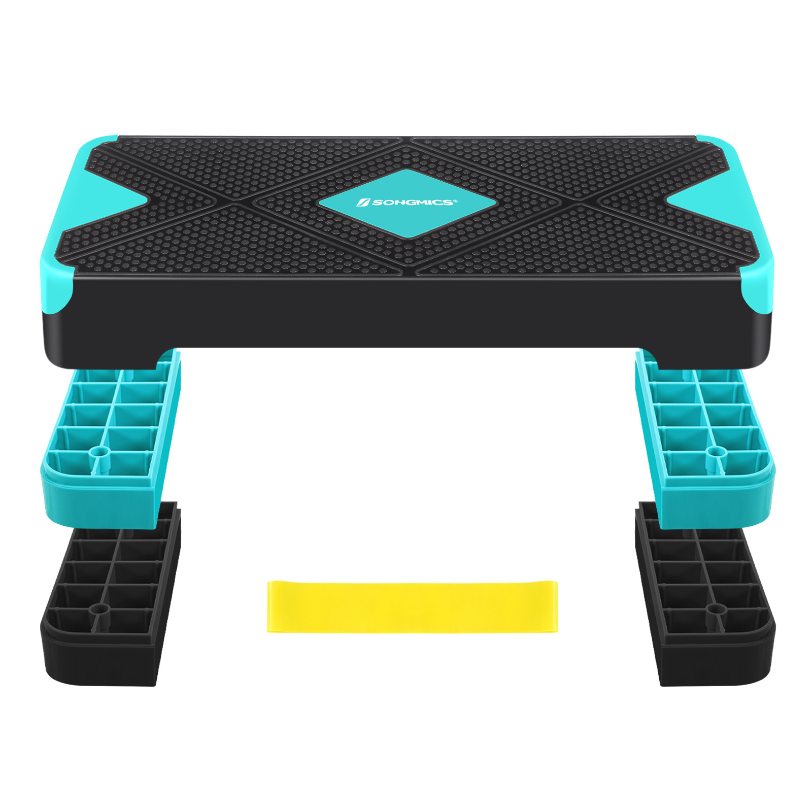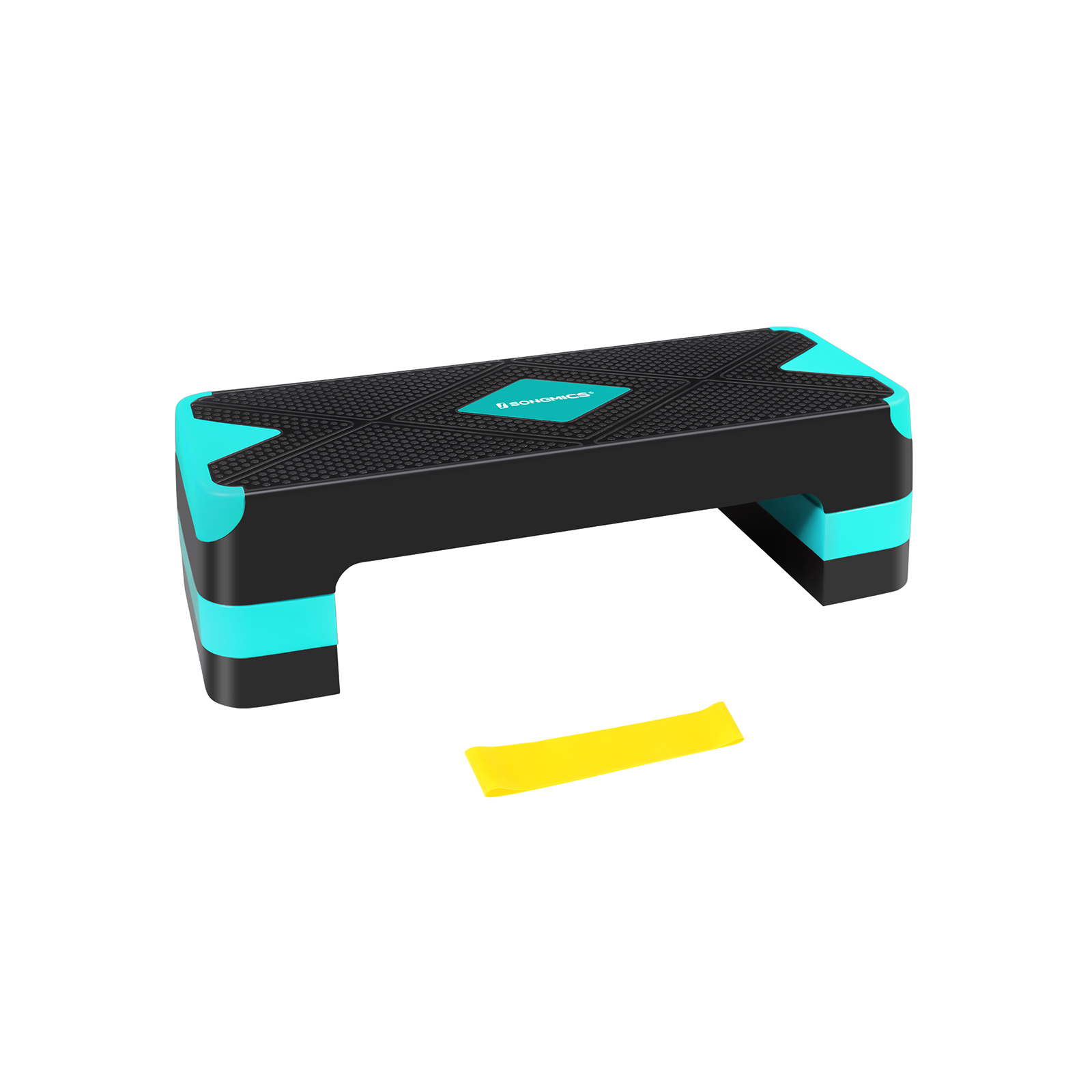 Make the most of your home workout and your limited time! Thanks to its durable material and robust structure, this step board will serve you for years to come. Assembly is a breeze—simply stack the support blocks and you’re done. Whether at the gym, at home, or in the office, this stepper is easy to take with you wherever you go.The highlights of this step board: Easy to transport and clean Non-slip, non-stick surface Load capacity up to 100 kg A large surface for intense and challenging cardio workouts Helps you improve your fitness at home, in the office, or outdoors The anti-slip pads ensure stability and protect your floor from scratches Product details:Color: Black-turquoise blue Material: PP plastic, TPE rubber pads Size: 68 x 27 x (10/15/20) cm (L x W x H) Size of support block: 28 x 11.5 cm (L x W) Resistance band dimensions: 600 (circumference) x 50 (width) x 0.65 mm (thickness) Weight: 3.5 kg Max. static load capacity: 100 kg Scope of delivery: 1 x step board 4 x support blocks 1 x resistance band SONGMICS Notes:Use the product on a flat and dry floor, never on a slippery surface with water or oil stains, to avoid injuries from slipping. Keep children and pets away from the product.