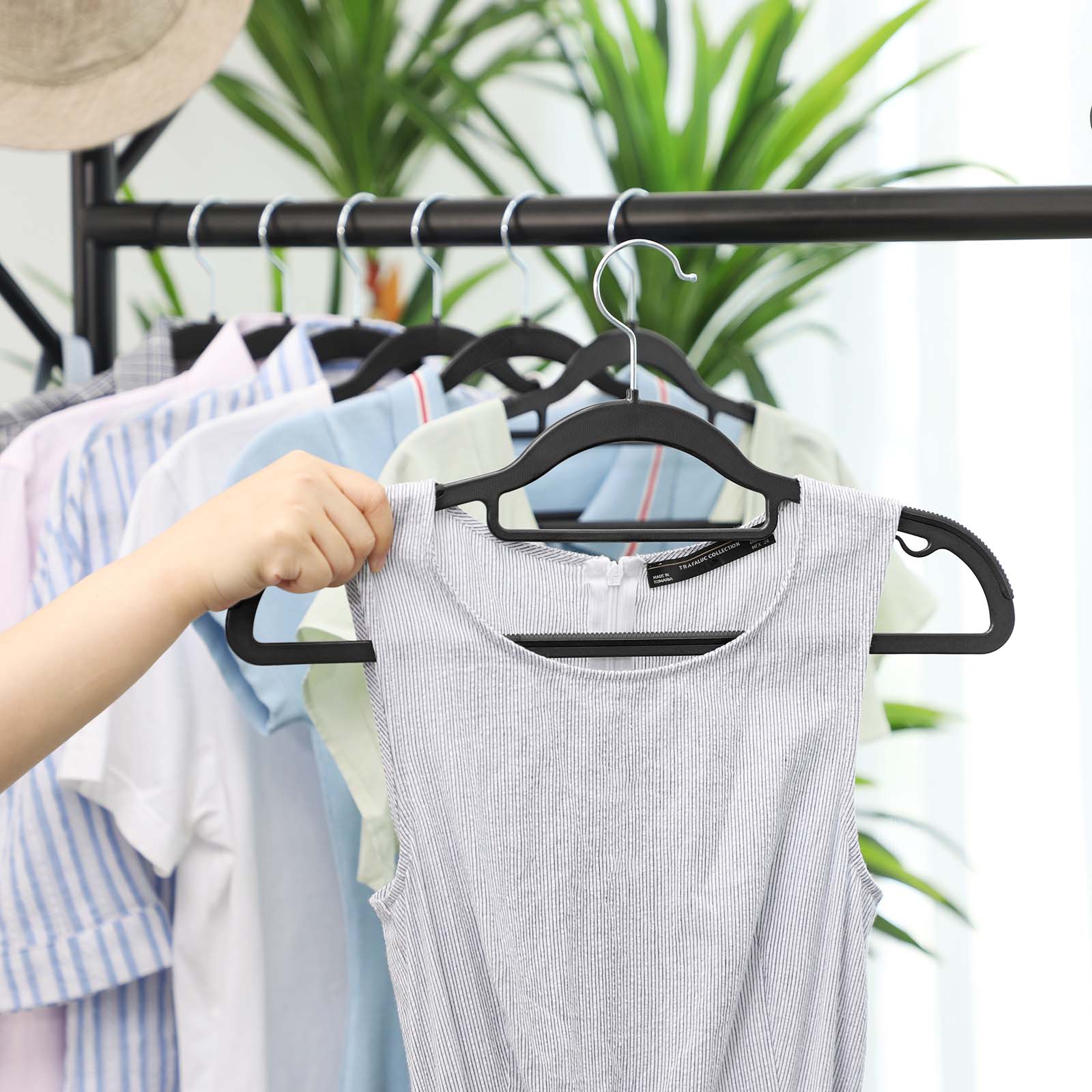 Do you find it difficult to navigate the wide selection of different types of hangers? Then why not try these classic hangers from SONGMICS to add a touch of class to your wardrobe? Sometimes a simple design is all you need. Whether it’s down jackets, wool coats, windbreakers, shirts, dresses, pants, skirts, scarves, or towels—all garments can be easily hung on and taken off the hangers. These hangers from SONGMICS offer all the features you need to keep your clothes neat and wrinkle-free. Product details: – Color: Black – Material: ABS plastic – Dimensions per hanger: 42 x 0.6 x 21.5 cm (L x W x H) – Weight per hanger: 83 g – Max. load capacity per hanger: 5 kg Scope of delivery: – 50 x hangers SONGMICS Notes:- Please do not hang items that are too heavy or laundry on the hangers. – Please do not use these hangers in a portable clothes dryer.