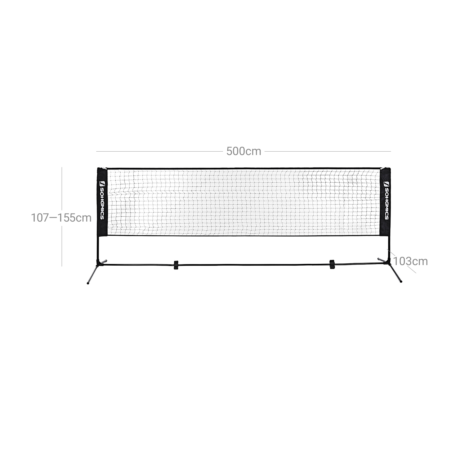 This set includes a close-meshed net and sturdy iron poles. With it, you can set up a court in your garden, backyard, park, beach, or gym in seconds. Then chase after the shuttlecock and play a wild game of badminton with your friends or family. Product details: Color: Black Material: Iron poles, PE (polyethylene) net, Oxford fabric Size: 500 x 103 x 155 cm (L x W x H) Iron pole diameter: 19 mm Weight: 4.8 kg Scope of delivery: 1 x badminton net 1 x carrying bag 4 x ground hooks 1 x instructions (DE, EN, FR, ES, IT)