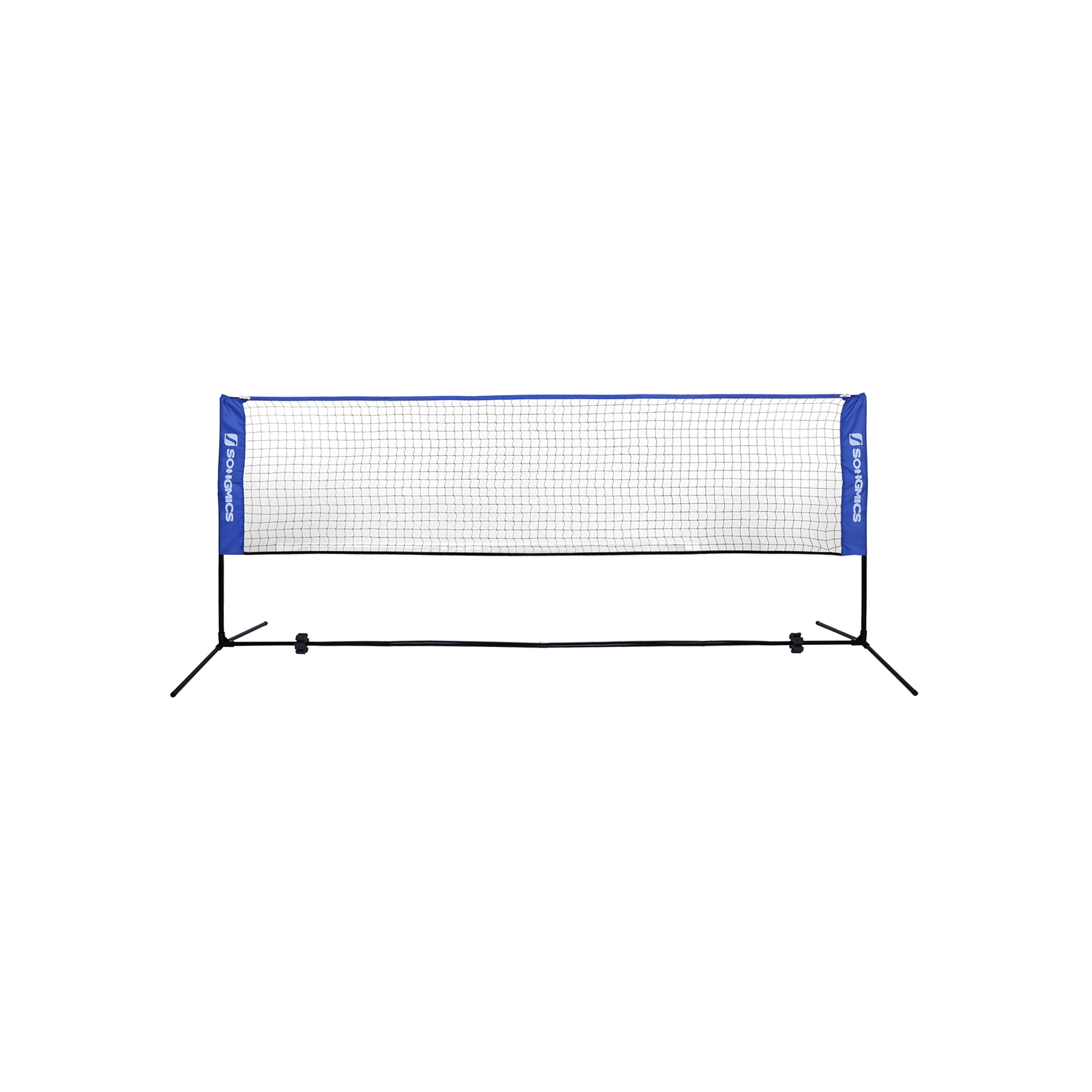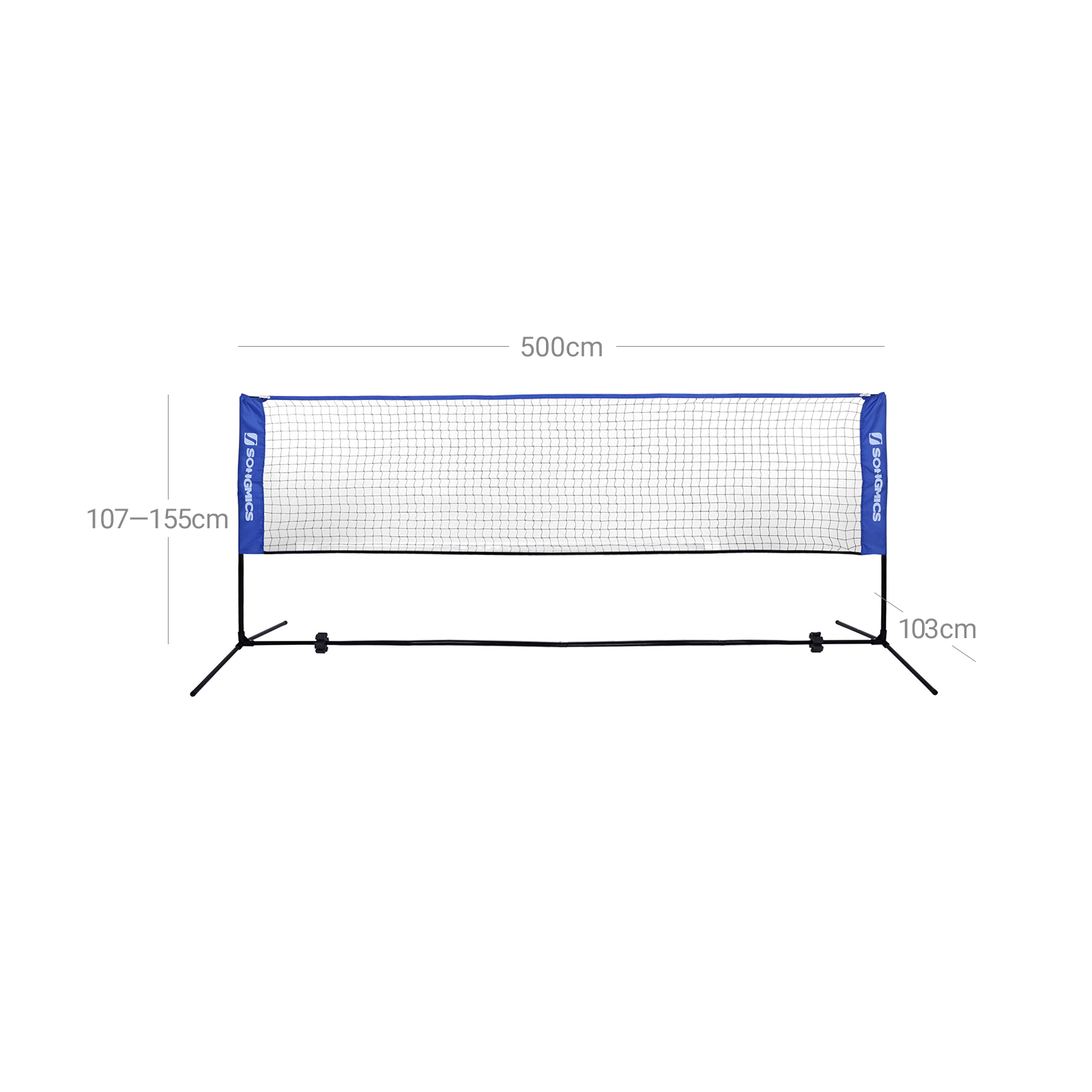 Product description: It’s sunny and green outside, but your family is glued to the TV or their smartphones? This spring and summer, you can finally lure them back into the garden: play a round of badminton together! Without electronic devices or other distractions, your children will have fun in nature and play badminton for hours. With this badminton net from SONGMICS, you’ll be the star of your family and their number one playing partner! These are the highlights of the SONGMICS badminton net: Height-adjustable net with markings at 107, 120, and 155 cm.Suitable for numerous net sports: badminton, tennis, volleyball, etc. Can be set up and taken down in a few minutes. Includes 4 ground hooks for increased stability. The 4-way nylon connections on the net’s feet are made of the same material used in the production of shock absorbers. This makes them particularly durable and resistant. A transport bag is also included. Product details: Material: Iron tubes + PE net + Oxford fabric Diameter of iron tubes: 19 mm Product dimensions: 500 x 155 x 103 cm (W x H x D) Color: Black (frame); blue (net) Scope of delivery: 1x badminton net 1x carrying bag 4x ground pegs 1x instructions (DE, EN, FR, IT, ES)