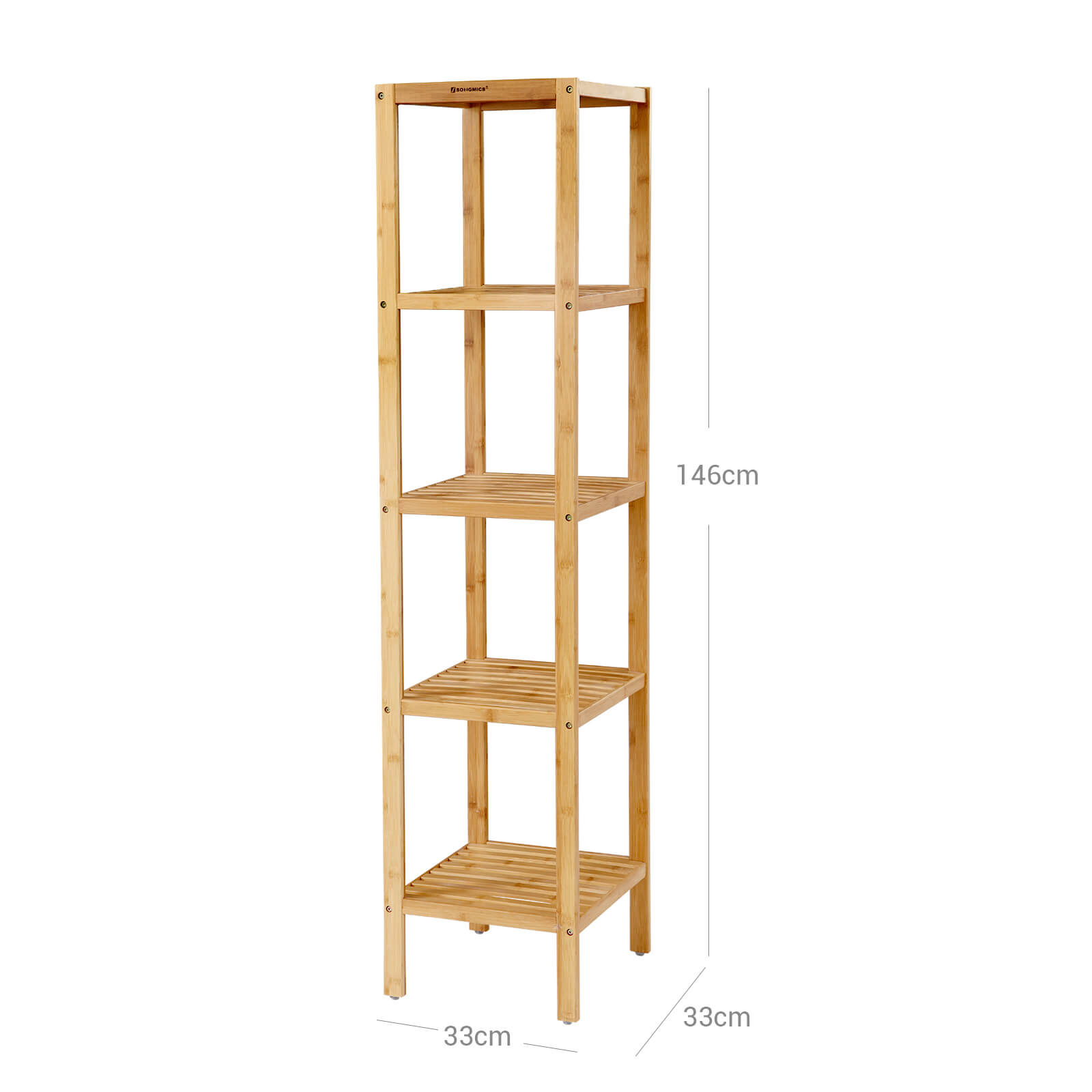 Do you need a storage shelf that can hold numerous items within easy reach and is sturdy enough to last for many years? Would you also like to maximize the limited storage space in your home? Then try this bamboo shelf from SONGMICS! It will never let you down. Bamboo makes the difference What do you think of when you see bamboo? A natural material? Correct, but that’s not all! Bamboo is also wear-resistant and user-friendly. The material also has a long service life and retains its stylish appearance even after years of use. An eye-catcher everywhere! With its beautiful, well-crafted bamboo surface, this shelf adds a natural yet elegant touch to your home. From photo frames and shower gels to plants and cookware, everything will find its place here. Whether in the living room, bathroom, hallway, or kitchen—try out where the shelf looks best and let us know in the reviews! Product details: – Color: natural – Material: bamboo – Product size: 33 x 33 x 146 cm (L x W x D) – Distance between shelves: 13 cm – Weight: 4.6 kg Scope of delivery: – 1 x bamboo shelf – 1 x Allen key – 1 x instructions (DE, EN, FR, ES, IT) SONGMICS notes – It is recommended to attach the frame to the wall using the supplied anti-tip device for additional safety.