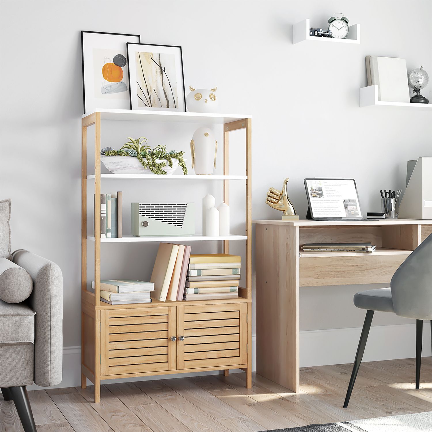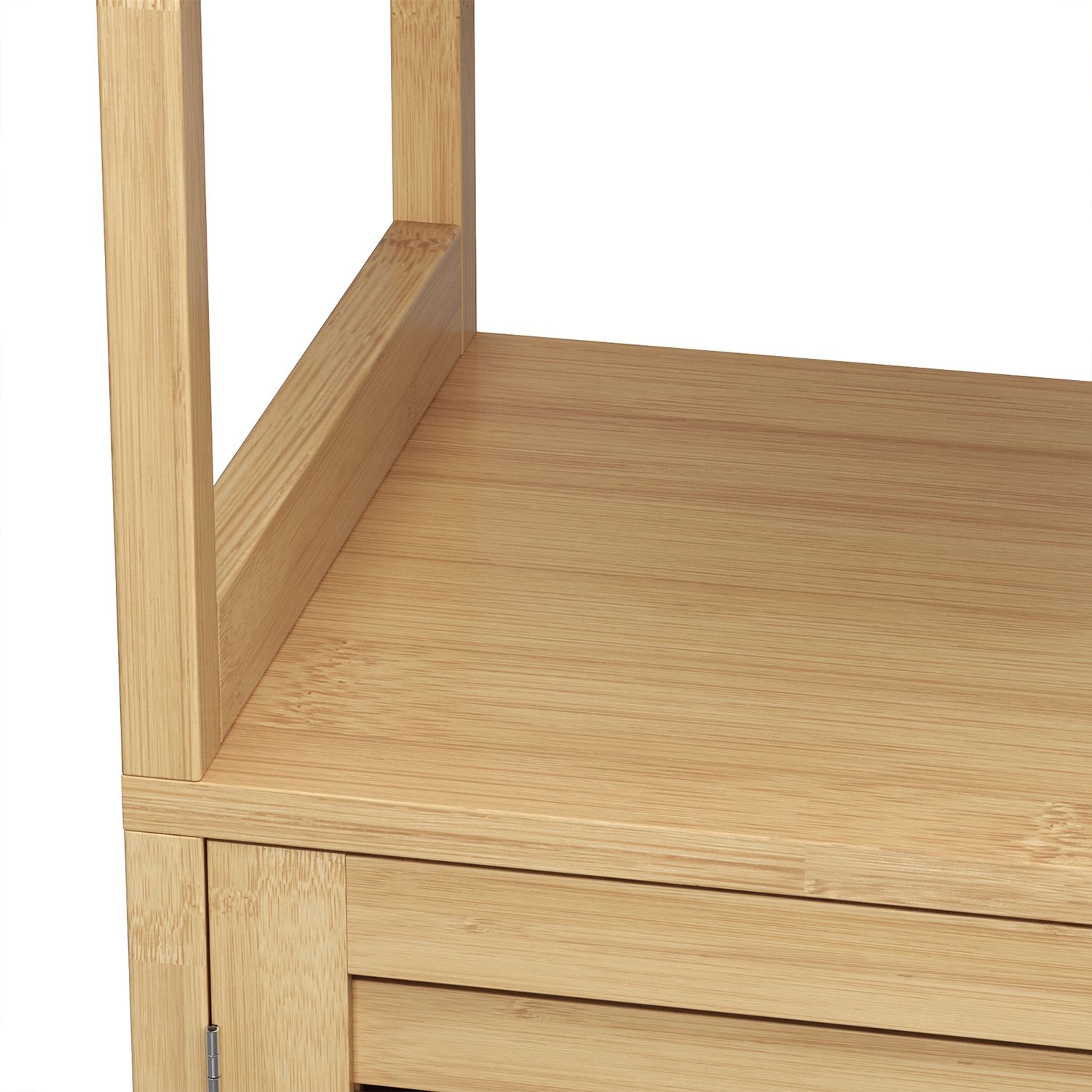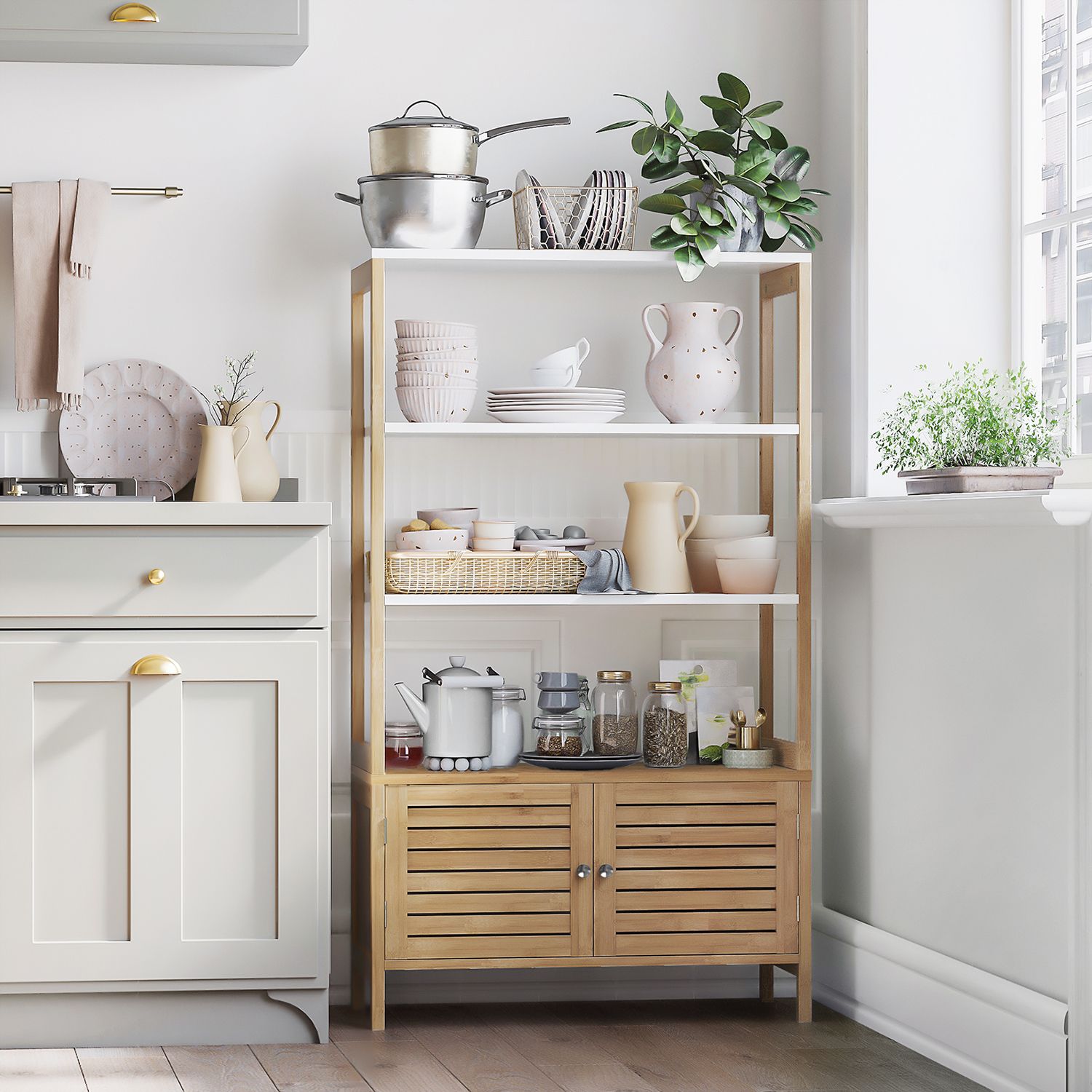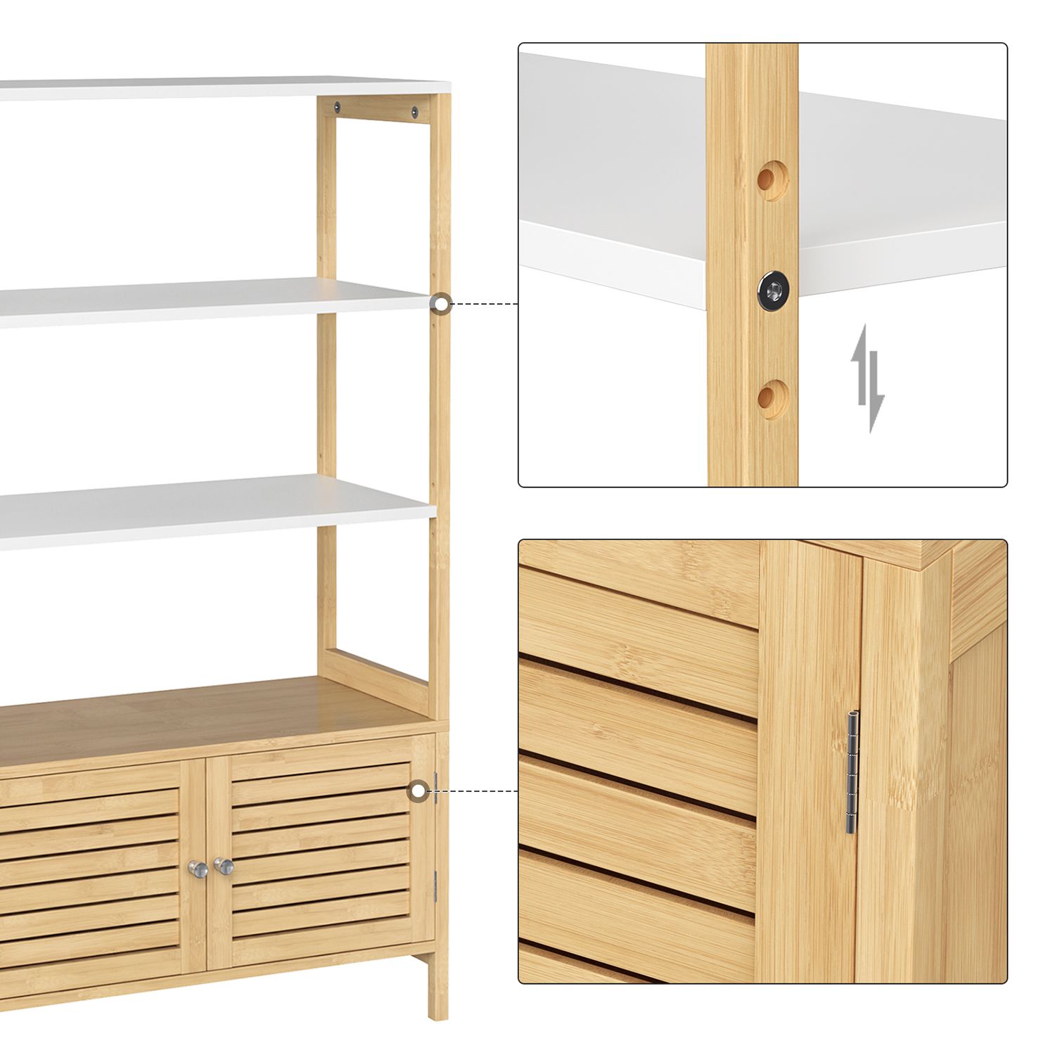 There’s nothing better than wrapping yourself in a cozy towel after a hot bubble bath and moisturizing with fragrant lotion. This storage cabinet offers you plenty of storage space for your bathroom essentials.Versatile storage options: Care products and bath salts fit perfectly on the open shelves. Cleaning products and other items are best hidden behind the double doors. Place a scented candle on the top shelf to give your bathroom a romantic atmosphere.A real all-rounder: more than just a bathroom cabinet! This piece of furniture also fits in your kitchen to store your microwave and pots, and in your living room to hold books and picture frames. Or use this cabinet in the hallway to keep your keys and wallets handy. What’s your plan? Product details:- Color: natural white – Material: bamboo, MDF (medium-density fiberboard) – Size: 70 x 30 x 120 cm (L x W x H) – Weight: 16.3 kg – Max. static load capacity per shelf: 15 kg – Max. static load capacity of the base cabinet: 20 kg Scope of delivery:- 1 x bathroom cabinet – 1 x accessory pack – 1 x anti-tip device – 1 x instructions (DE, EN, FR, ES, IT) SONGMICS notes: – Please attach this product to the wall using the anti-tip device provided to ensure safe use. – For safety reasons, children are not allowed to climb on or play with the product.