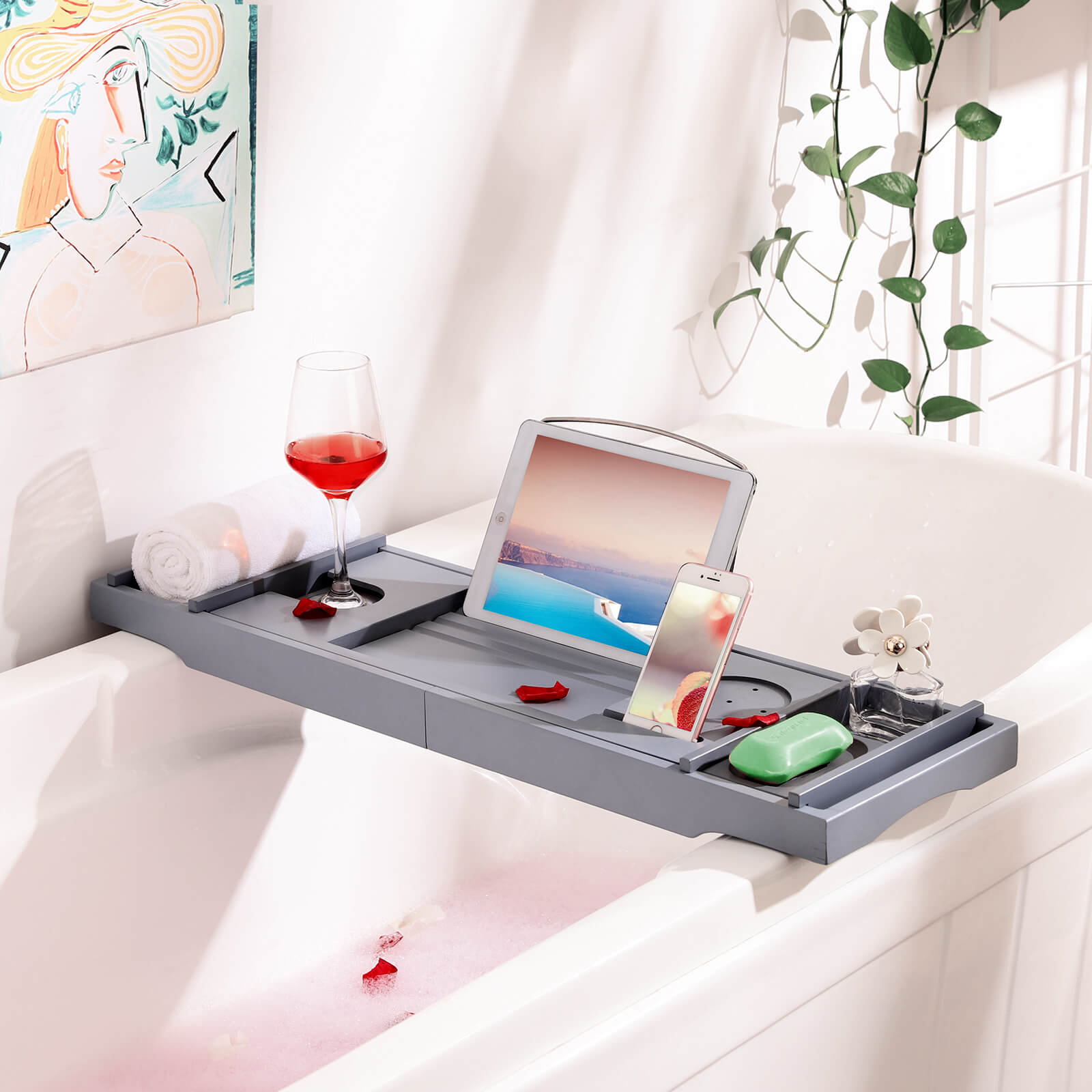 Do you enjoy reading or watching movies in the bathtub? Do you just need a place to put your glass of wine while you bathe? The Songmics bathtub tray is designed especially for you! Do you want to relax in the bathroom after a long day at work? This bathtub tray can definitely meet your needs. When you go to the bathroom, you can sit back comfortably and not worry about your book, phone, or iPad getting wet or your arms getting tired. If you want to create an extra nice atmosphere, you can put a candle and flowers on it. Slip into the bubbles and enjoy an undisturbed moment of relaxation with the Songmics bathtub board.Product details: Color: gray Material: bamboo Dimensions: 75-109 x 4.5 x 23 cm (W x H x D) Load capacity: 3 kg Weight: 1.96 kg Scope of delivery: 1 x bathtub tray SONGMICS Notes: Wipe with a damp cloth before use to remove the bamboo fibers on the surface.