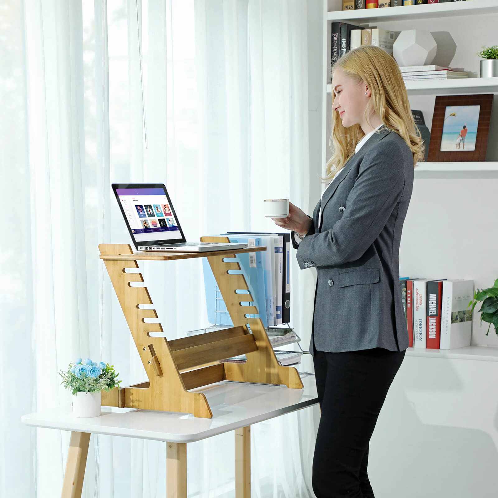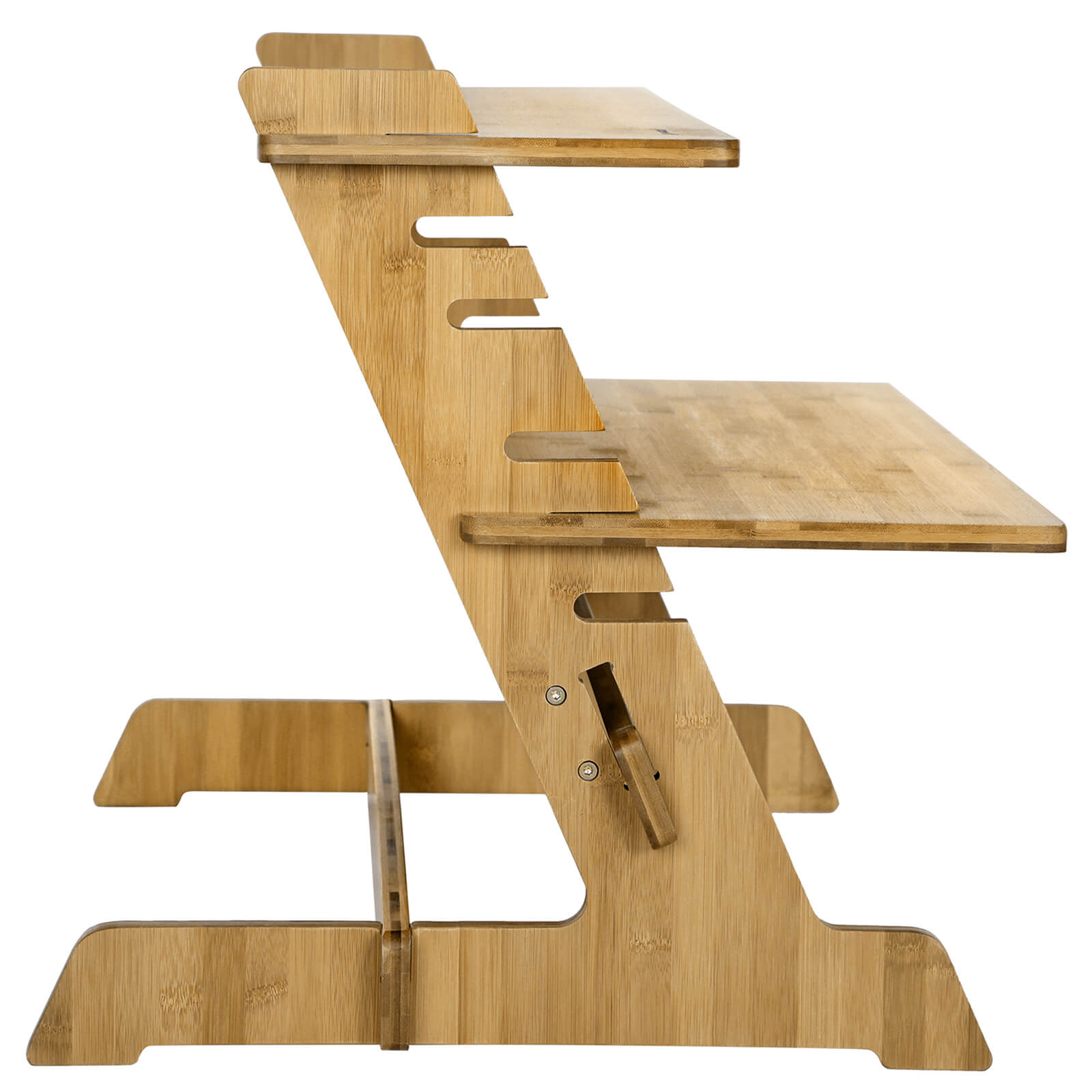 Sitting all day or standing all day – that is the question! Everyone knows that neither is good for your health. Our bodies thrive on changing activities, and the SONGMICS bamboo standing desk allows you to easily switch between sitting and standing positions – and back again.With this SONGMICS desk attachment, you can find a healthy balance between sitting and standing during your daily work. The 6 notches on both sides of the frame allow the 2 table tops to be raised or lowered to the appropriate height: if you want to stand, you can attach one top at the very top and place your monitor or laptop on it. The lower tabletop is then ideal for the keyboard or mouse. If you want to sit, you can lower one tabletop or simply remove it. This allows the standing/sitting desk to serve as a monitor stand, and you can use the removed tabletop as a laptop tray. Alternating between sitting and standing during working hours helps to prevent common office ailments such as back pain or neck/shoulder tension, avoid poor posture and uneven strain, and activate the cardiovascular system. The side effects of this are also improved concentration and reduced fatigue. Product details: – Dimensions: 66 x 49.5 x 48 cm (W x H x D) – Color: natural – Material: bamboo – Height adjustment range: 31-46 cm – Load capacity: 10 kg per base; 19 kg total – Weight: 4 kg Scope of delivery: – 1 x standing/sitting desk – 1 x instructions (DE, EN, FR, IT, ES) – 1 x tool