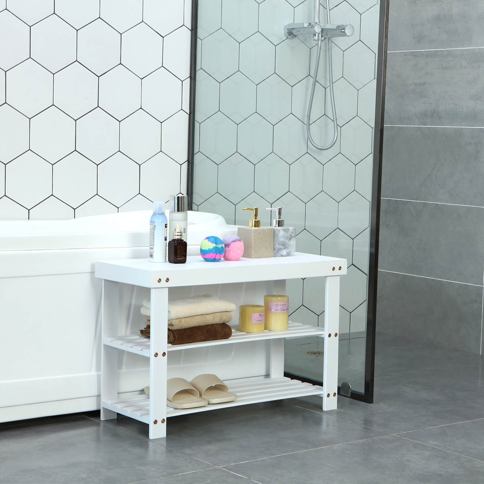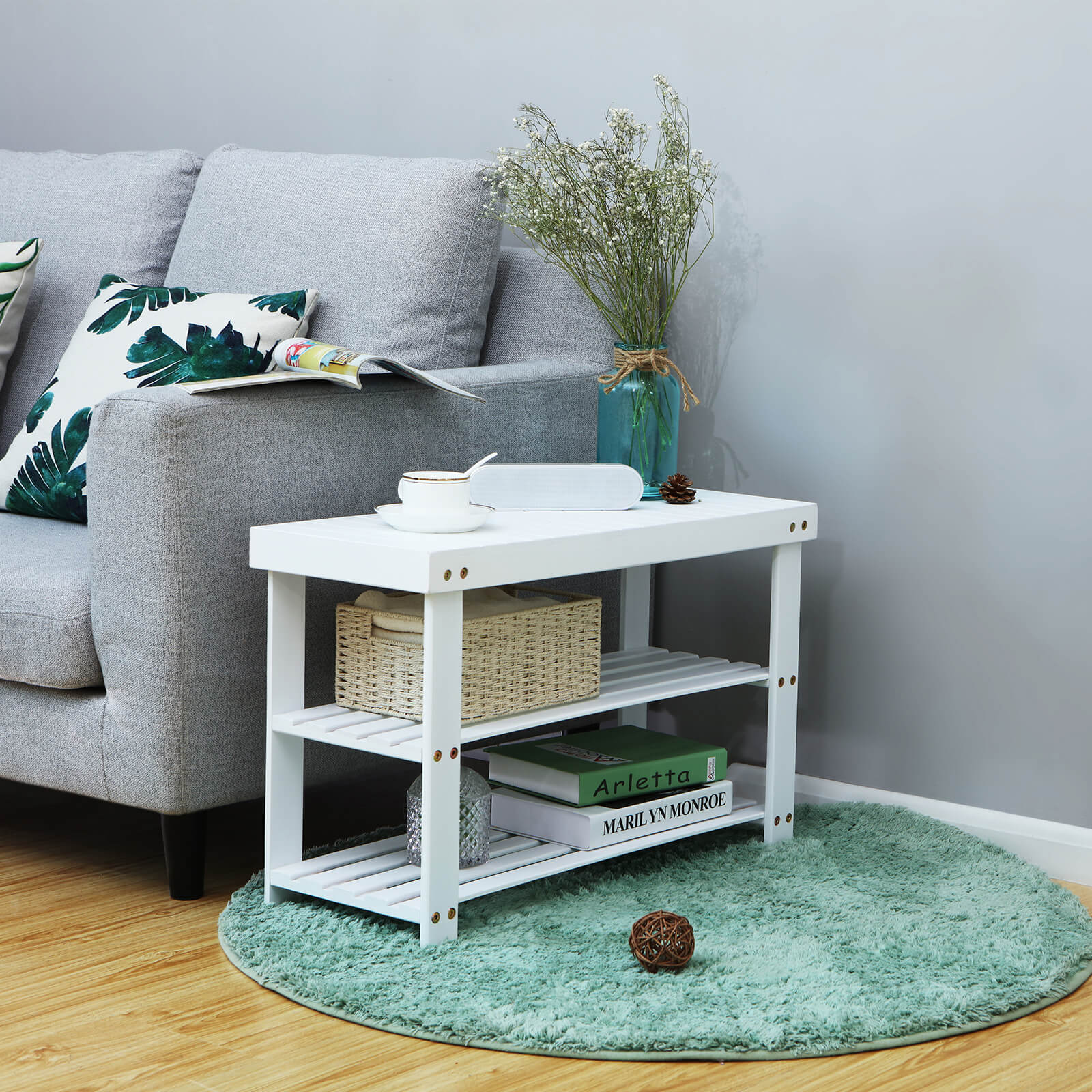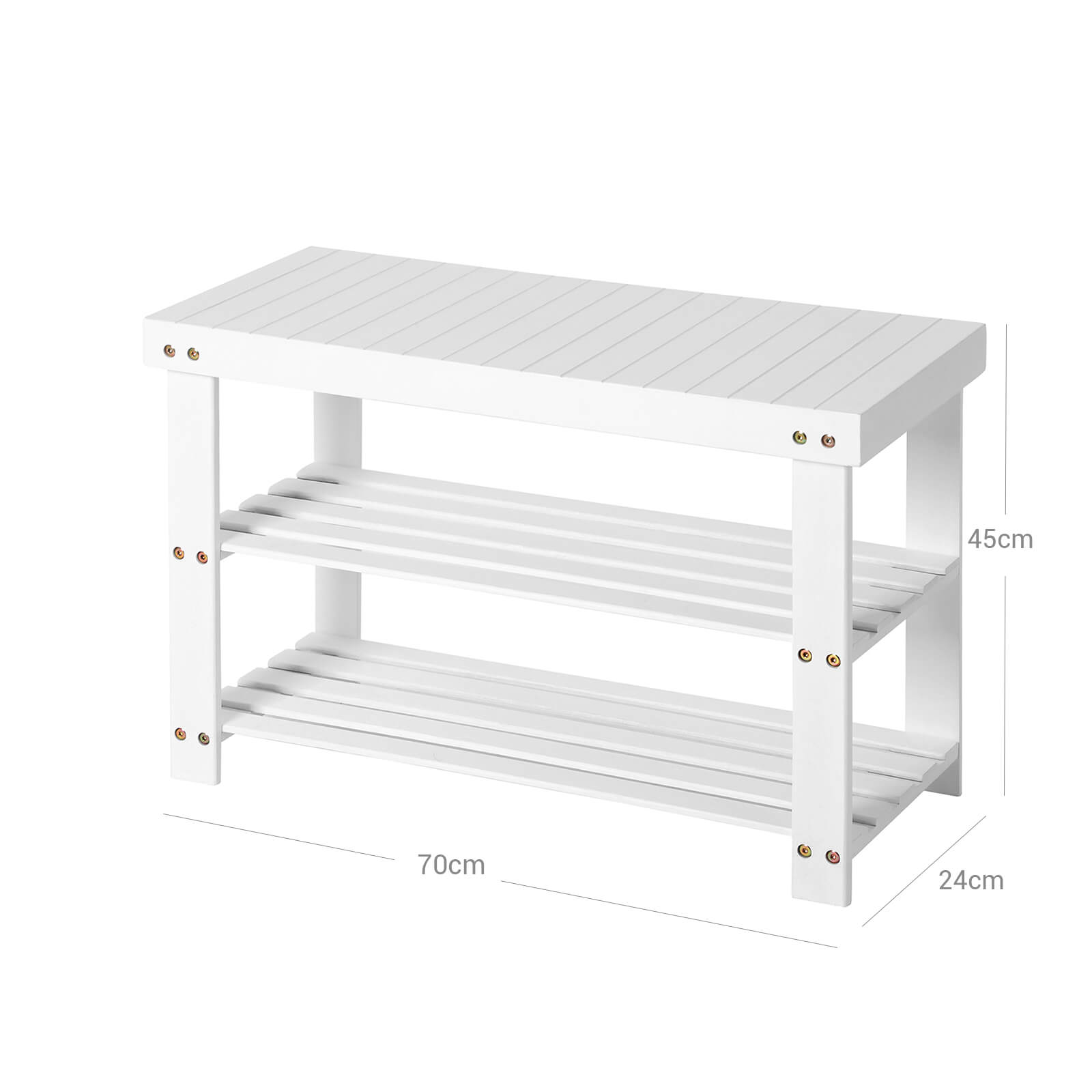 The bamboo shelf from Songmics is a combination of shoe rack and bench, which can be used for a variety of purposes. The stable and robust shelf is made of high-quality bamboo. Bamboo is a rapidly renewable raw material and therefore an environmentally friendly alternative. It is a good choice for environmentally conscious people with a sense of elegance. The bamboo panels are smoothly finished. The rounded edges will not damage your clothes or hurt you. Compared to other products, the shelves on this rack are made from a single piece of bamboo with grooves, which allows for higher load capacity and looks very attractive and modern. This beautiful rack will provide you with cozy comfort. Assembly tips: 1. First, assemble the shelf legs using the short screws and hex screws. 2. Insert the screw bolts into the holes and screw the long screws in from the outside of the shelf legs toward the inside. When assembling, please leave the legs with the holes facing outwards. 3. When assembling the shelves, we recommend first fixing them diagonally with screws, as this will make it easier to continue assembling with the remaining screws. Notes: 1. Water should be removed from the bathroom in a timely manner and the shoe rack should remain dry. 2. The shelf should be protected from rain or intense sunlight. Product details: – Dimensions: 70 x 45 x 28 cm (W x H x D) – Material: bamboo – Color: white – Package dimensions: 72 x 5 x 31 cm (W x H x D) – Individual weight: 4.26 kg Scope of delivery: – 1 x shoe rack – 1 x instructions – 1 x accessory set